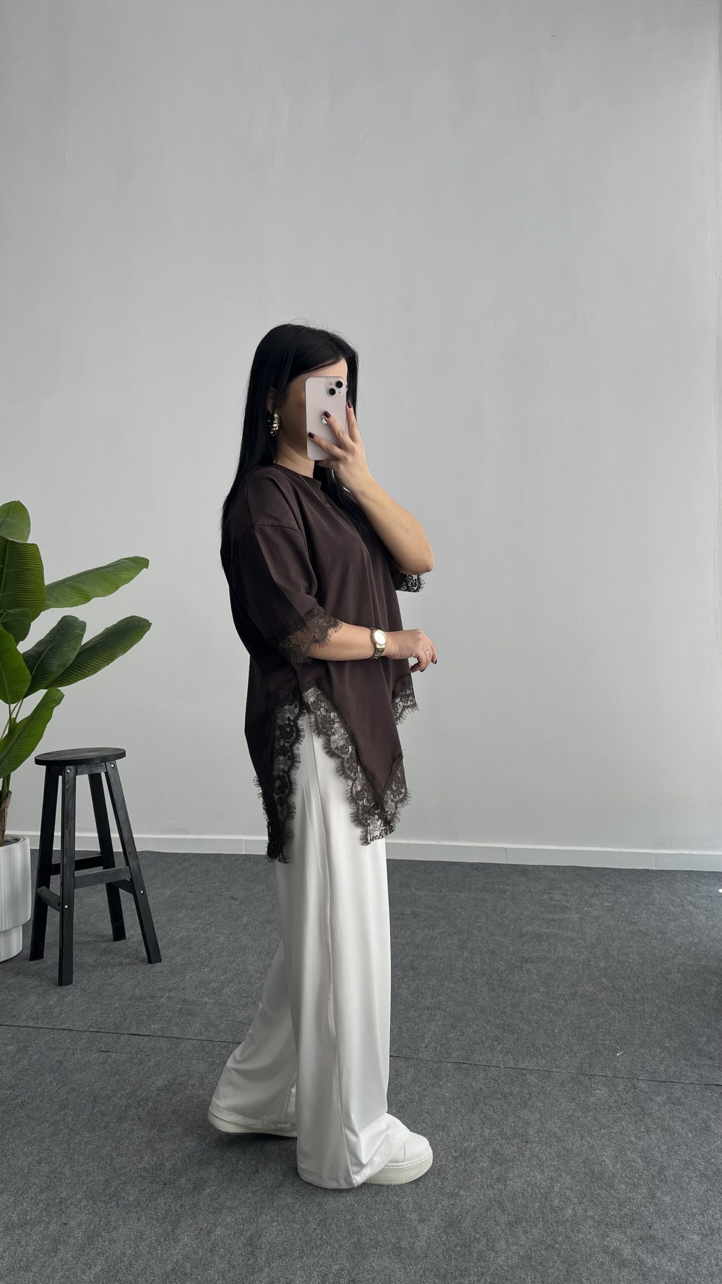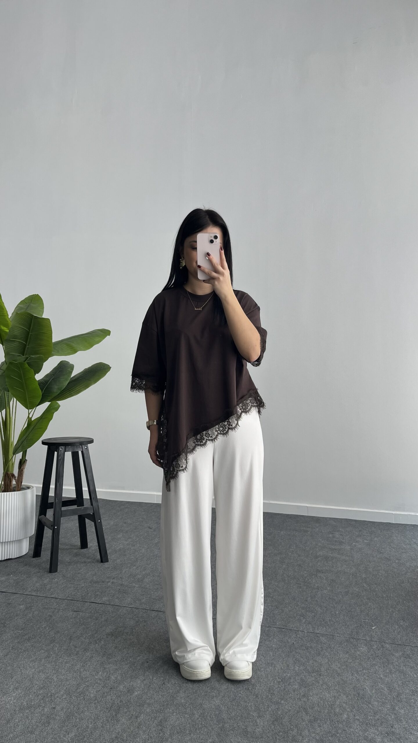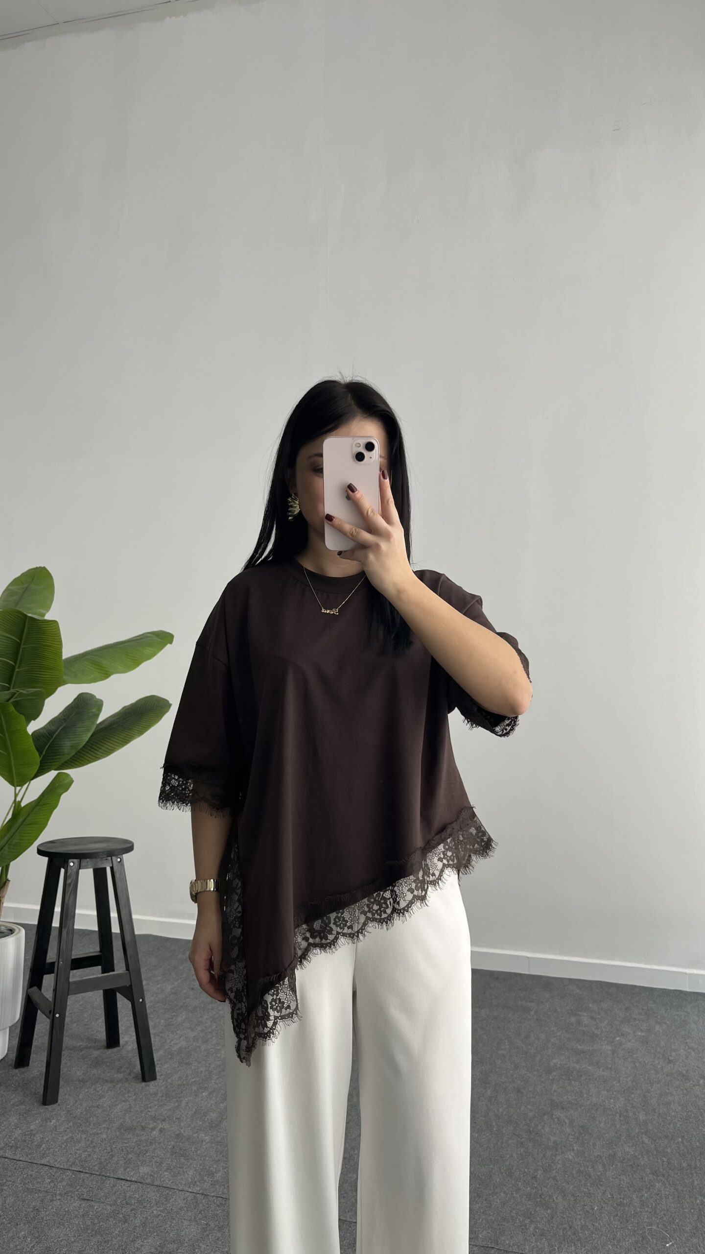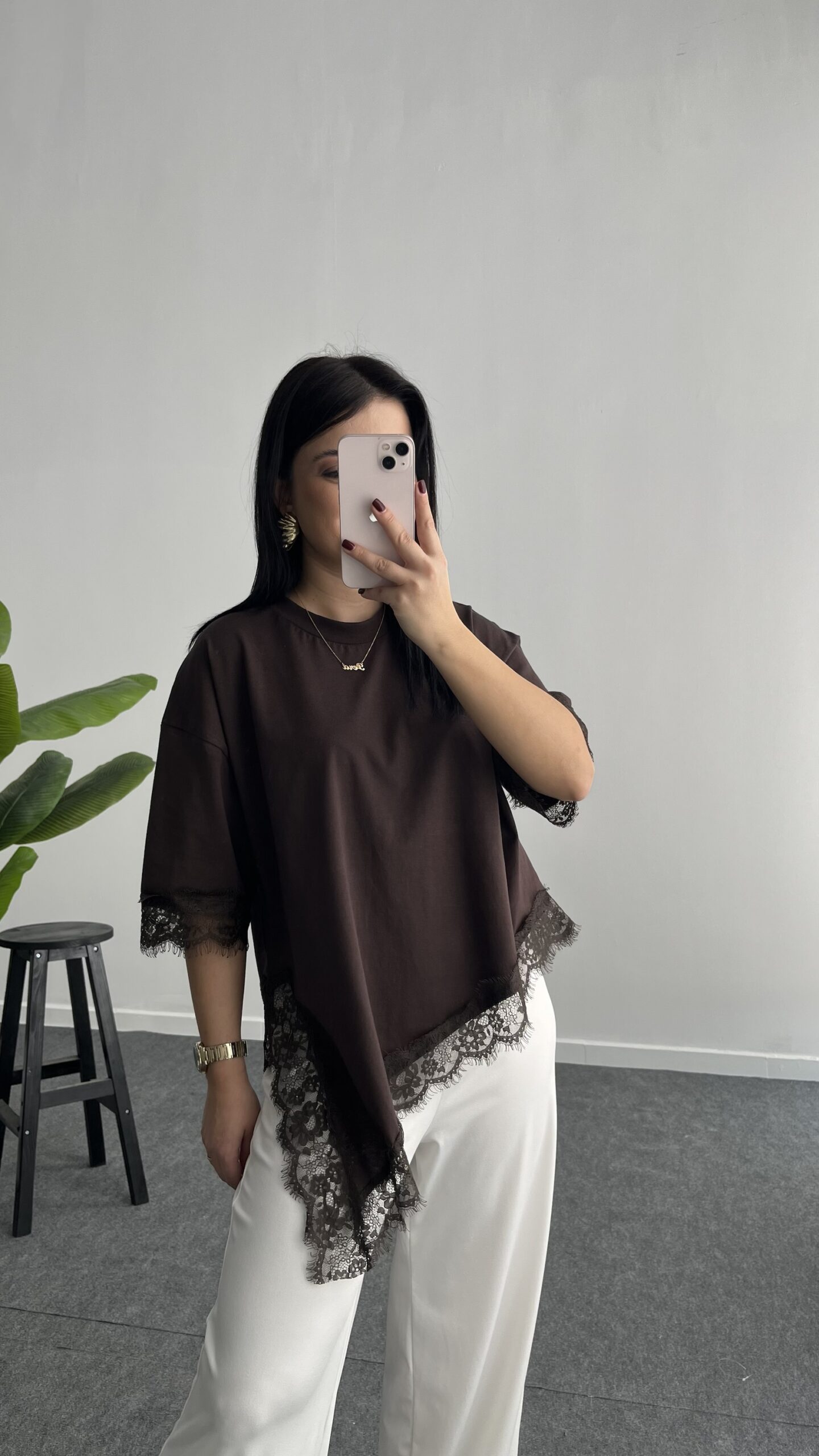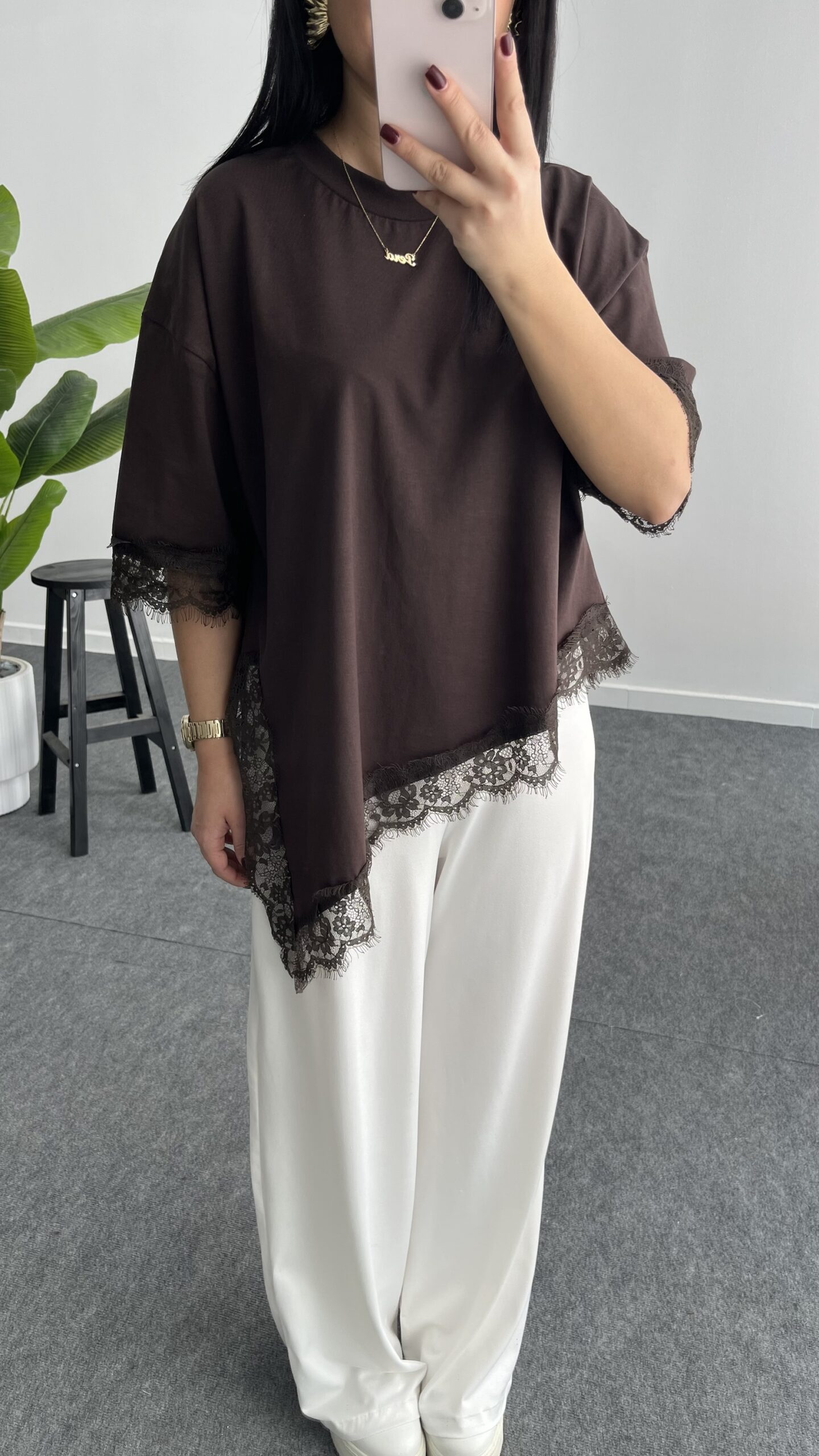 Elly Dantelli Kombine Tişört – Acı Kahve