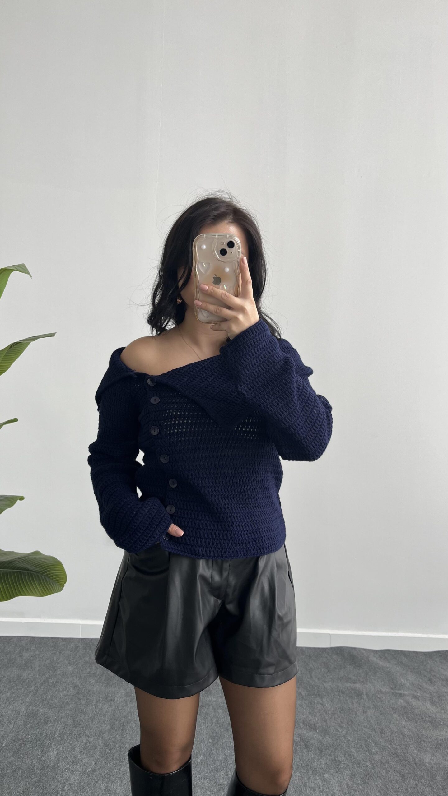 Kayık Yaka Önden Düğmeli Lacivert Bluz