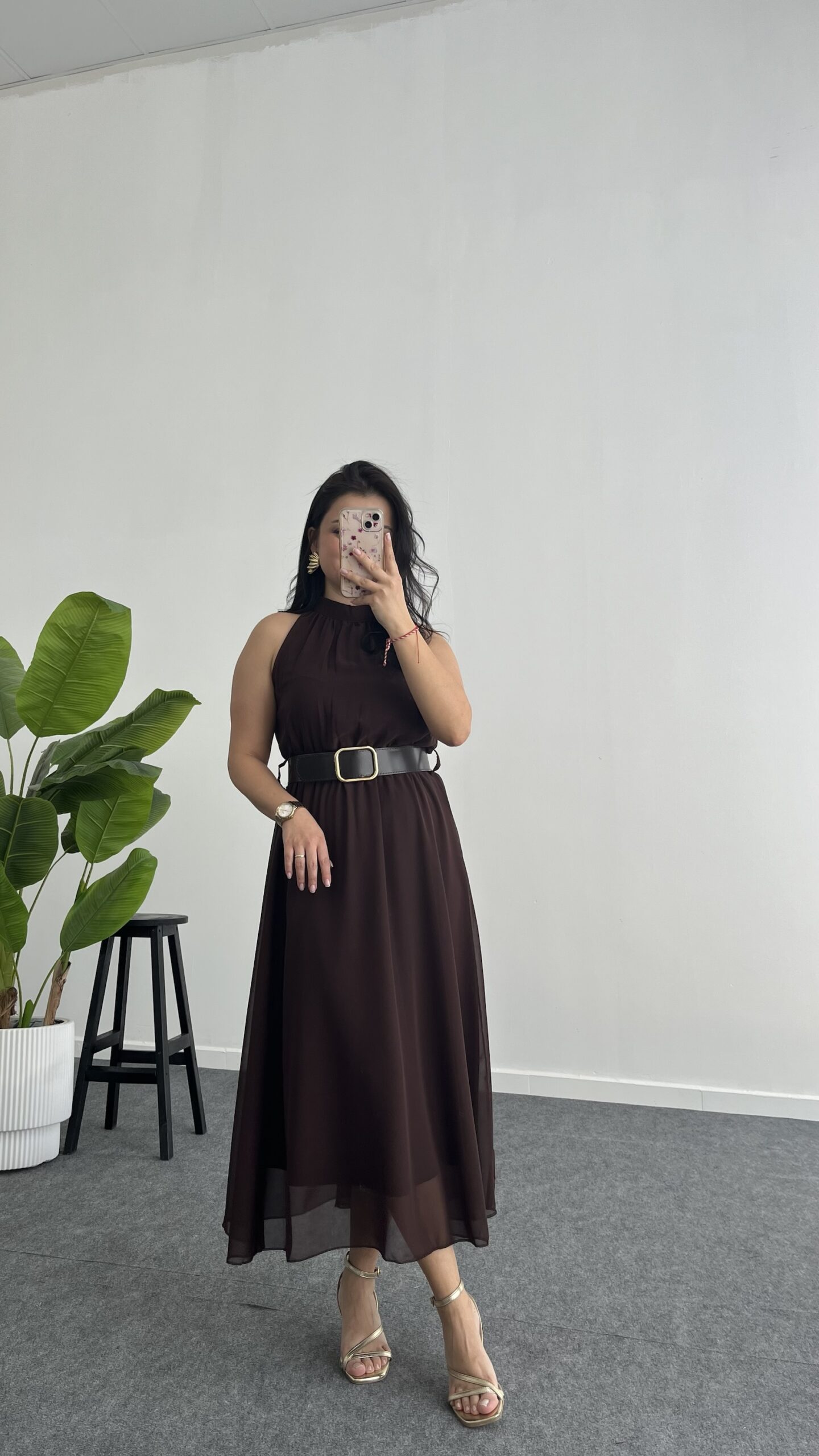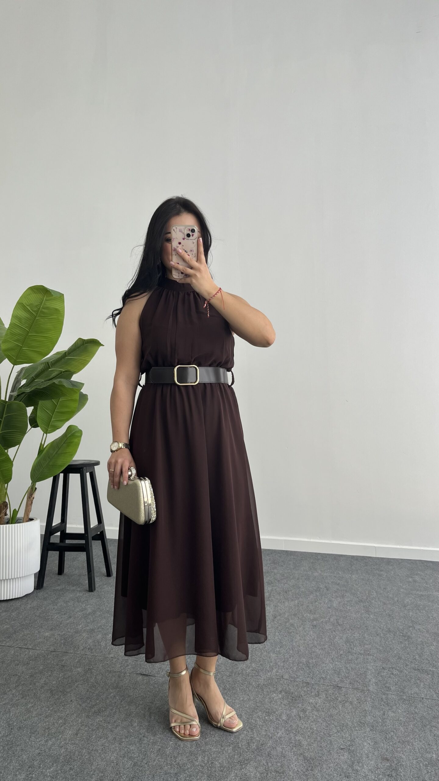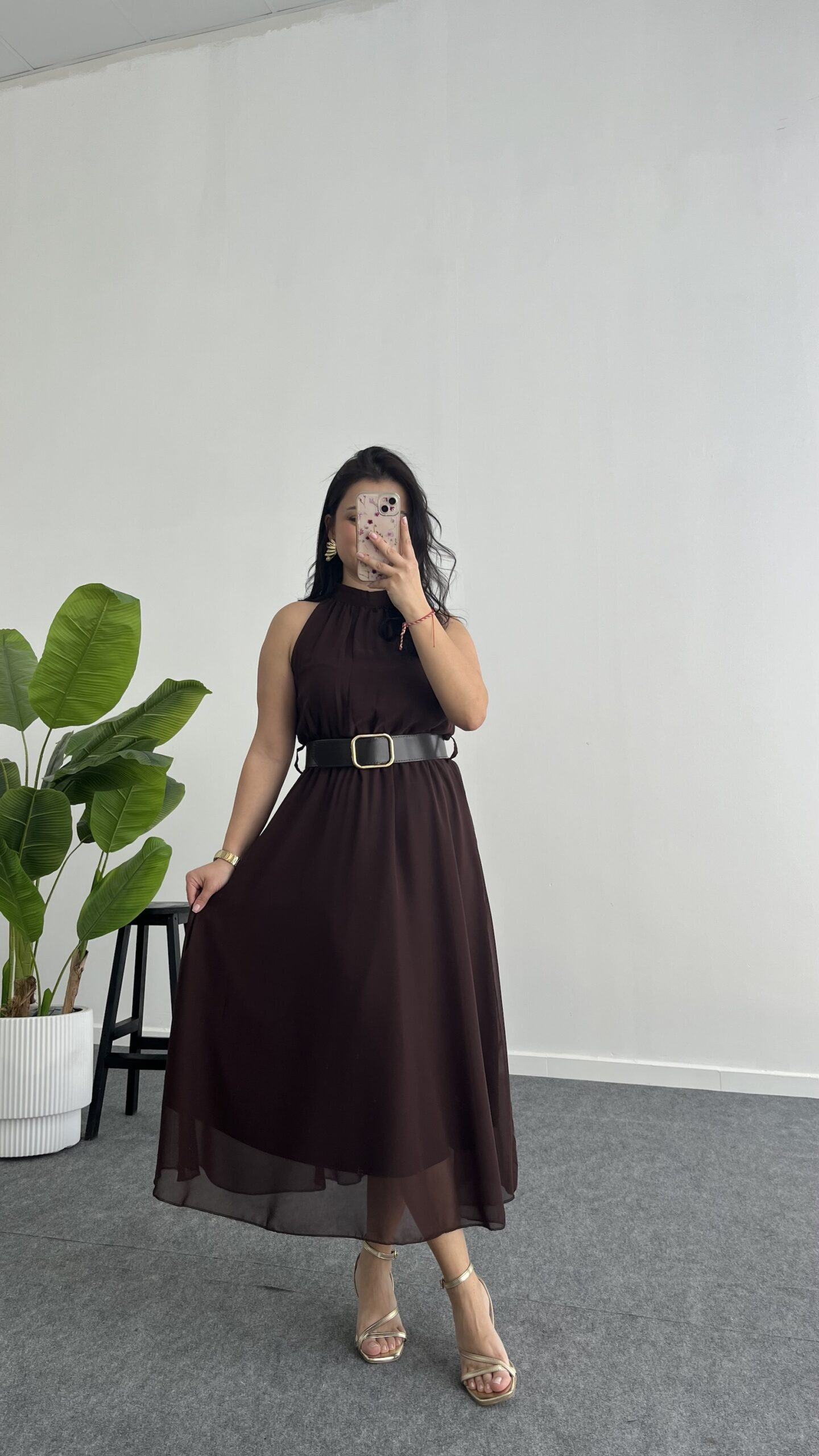 Alya Halter Yaka Kemerli Şifon Elbise – Kahve