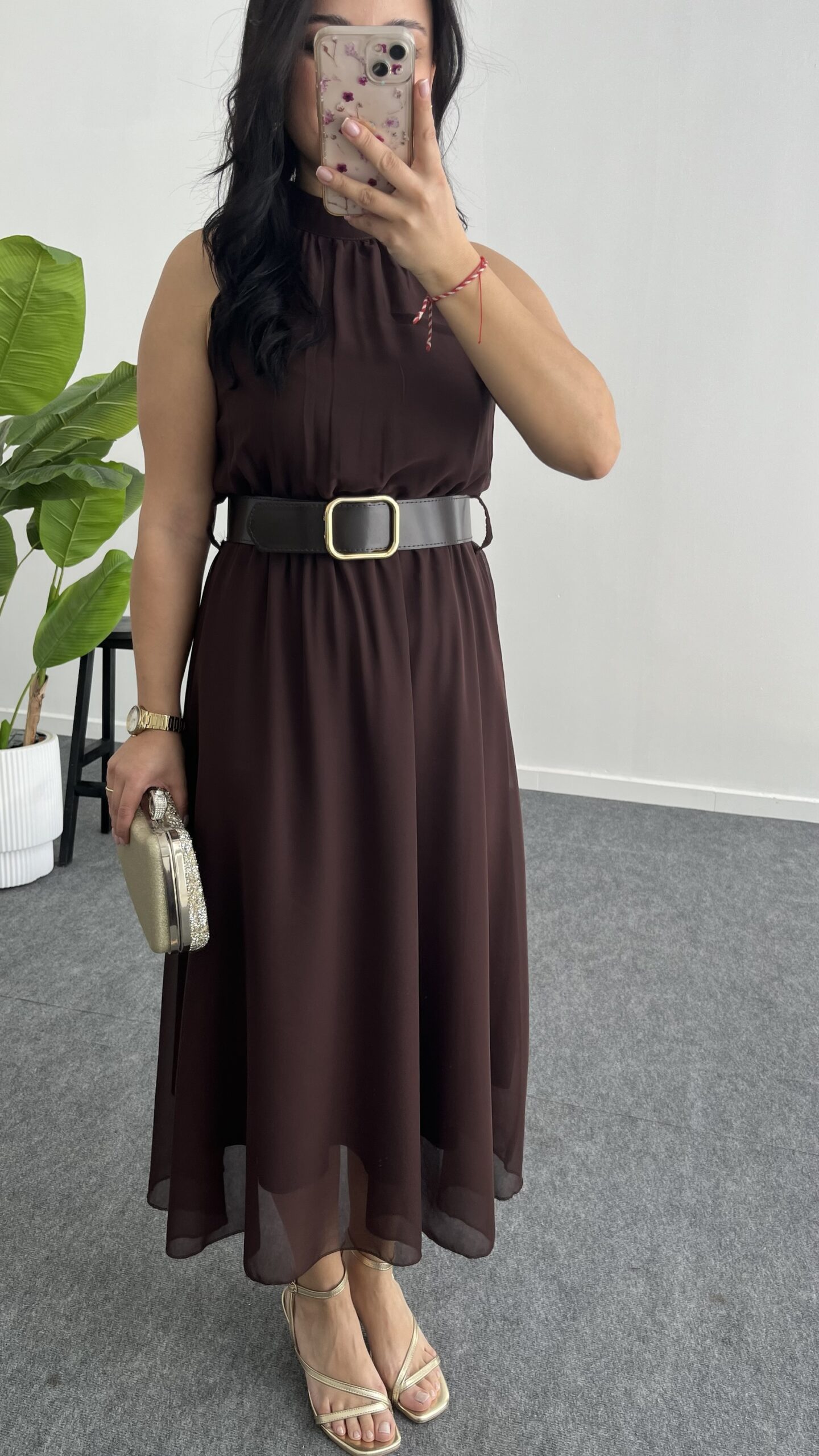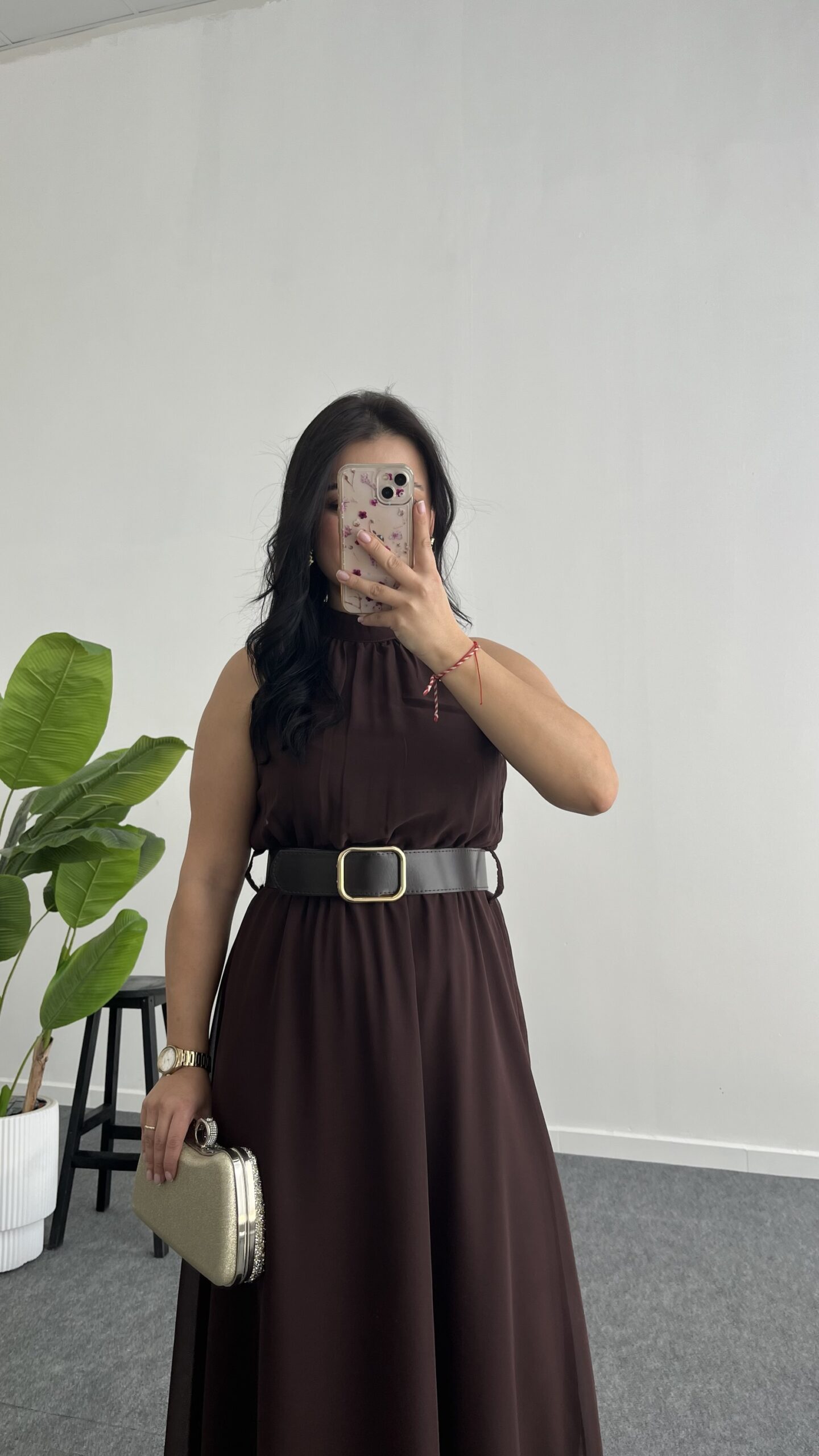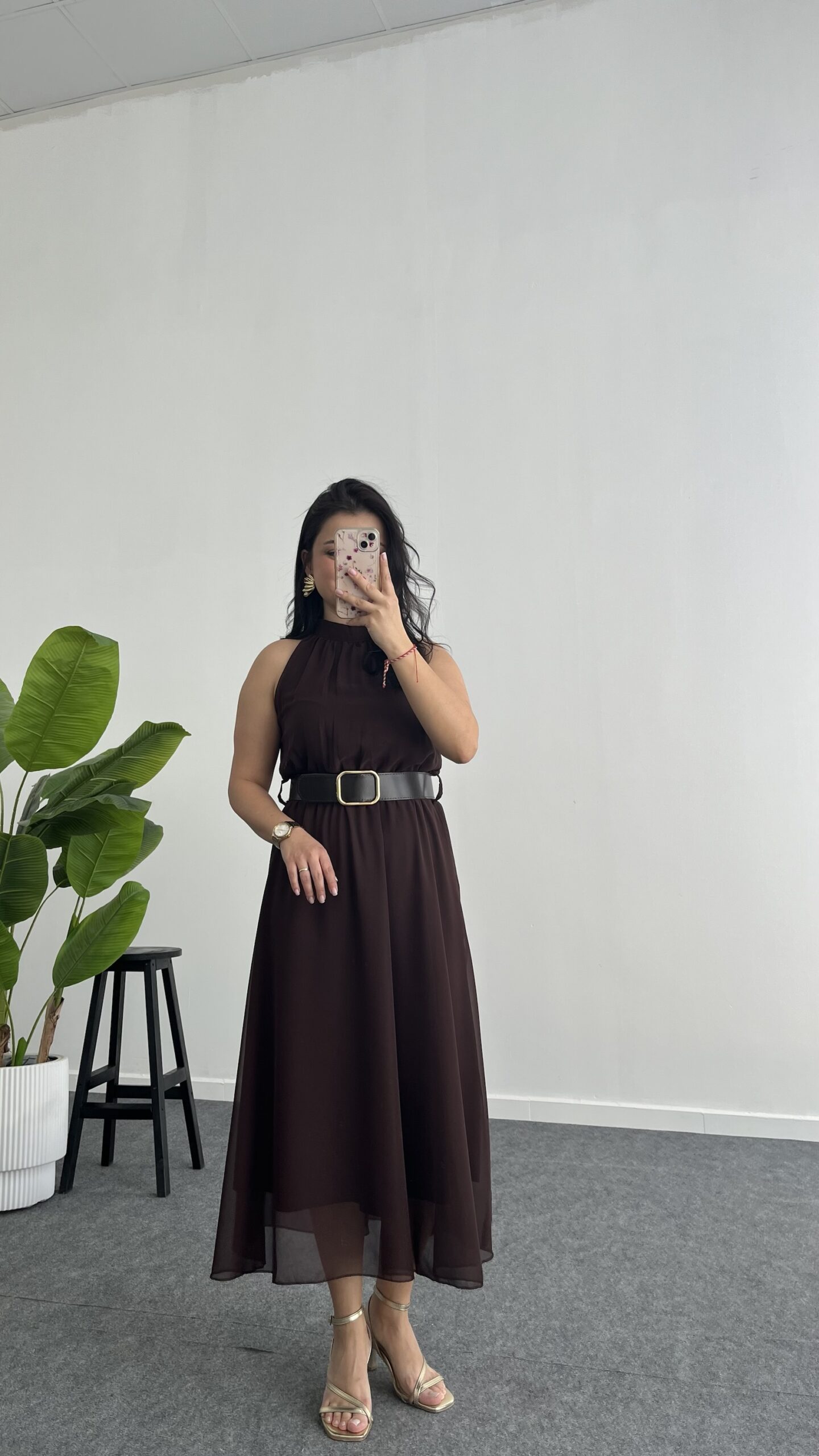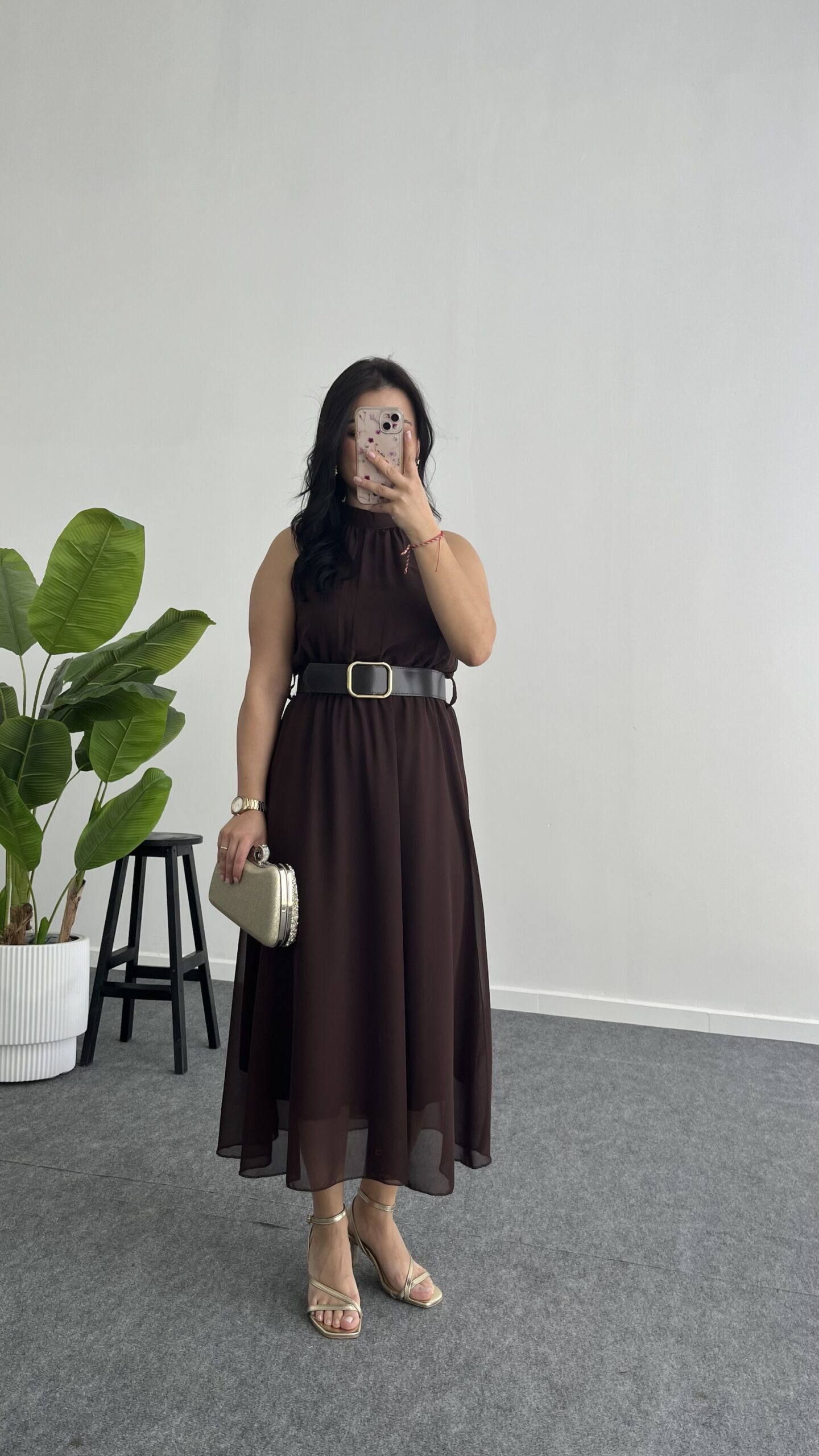 Alya Halter Yaka Kemerli Şifon Elbise – Kahve