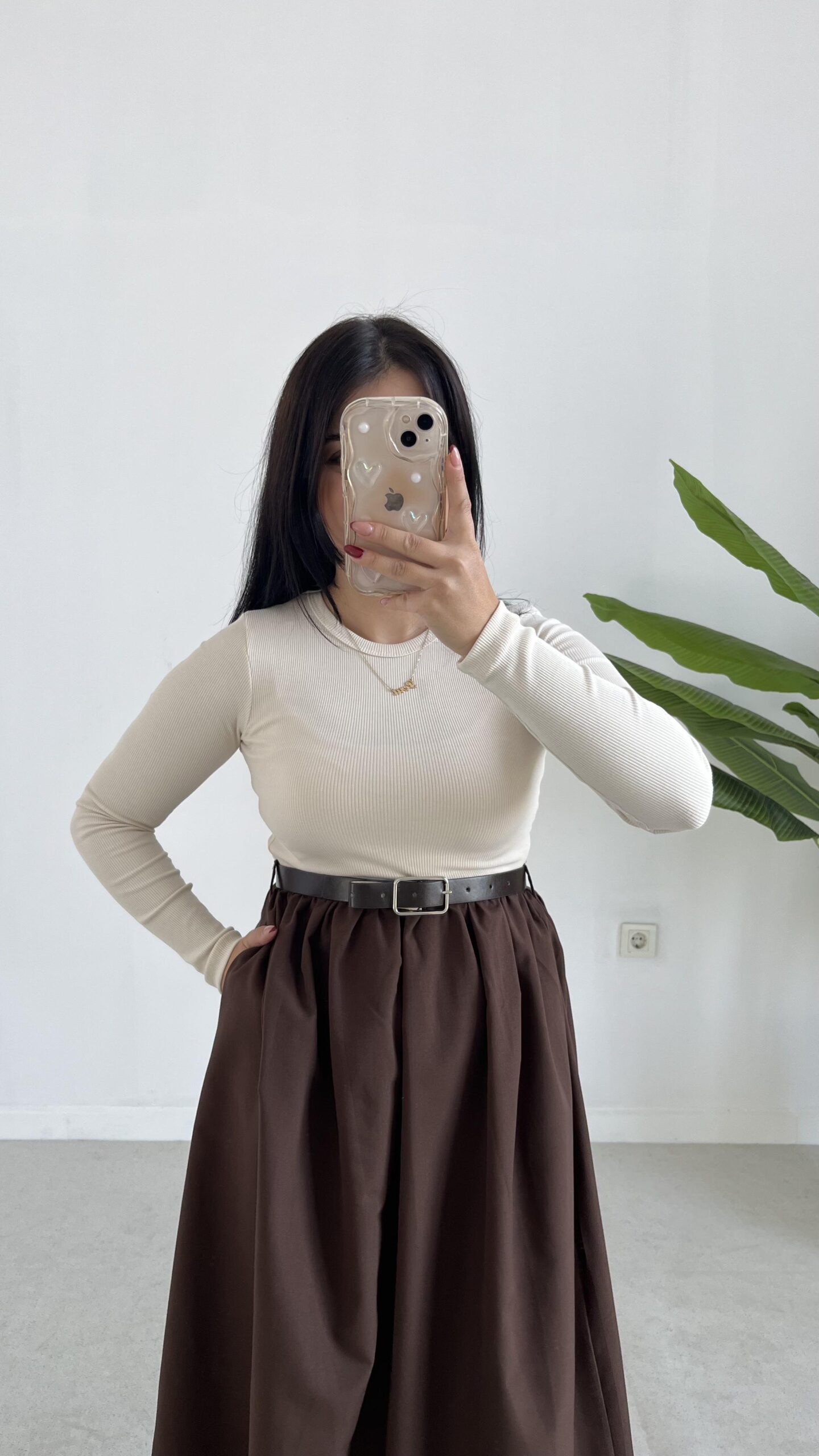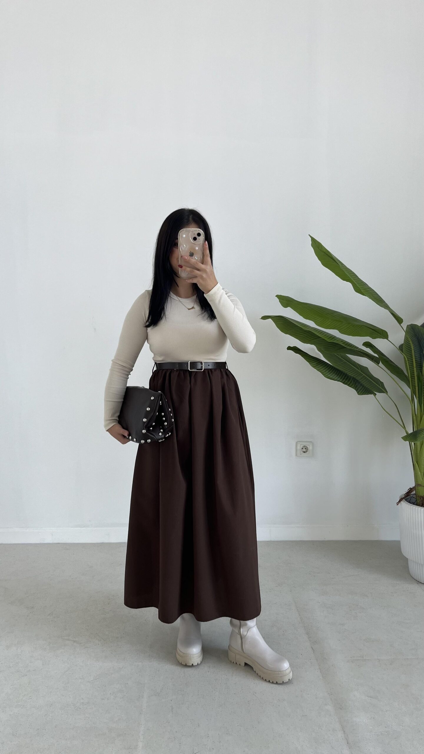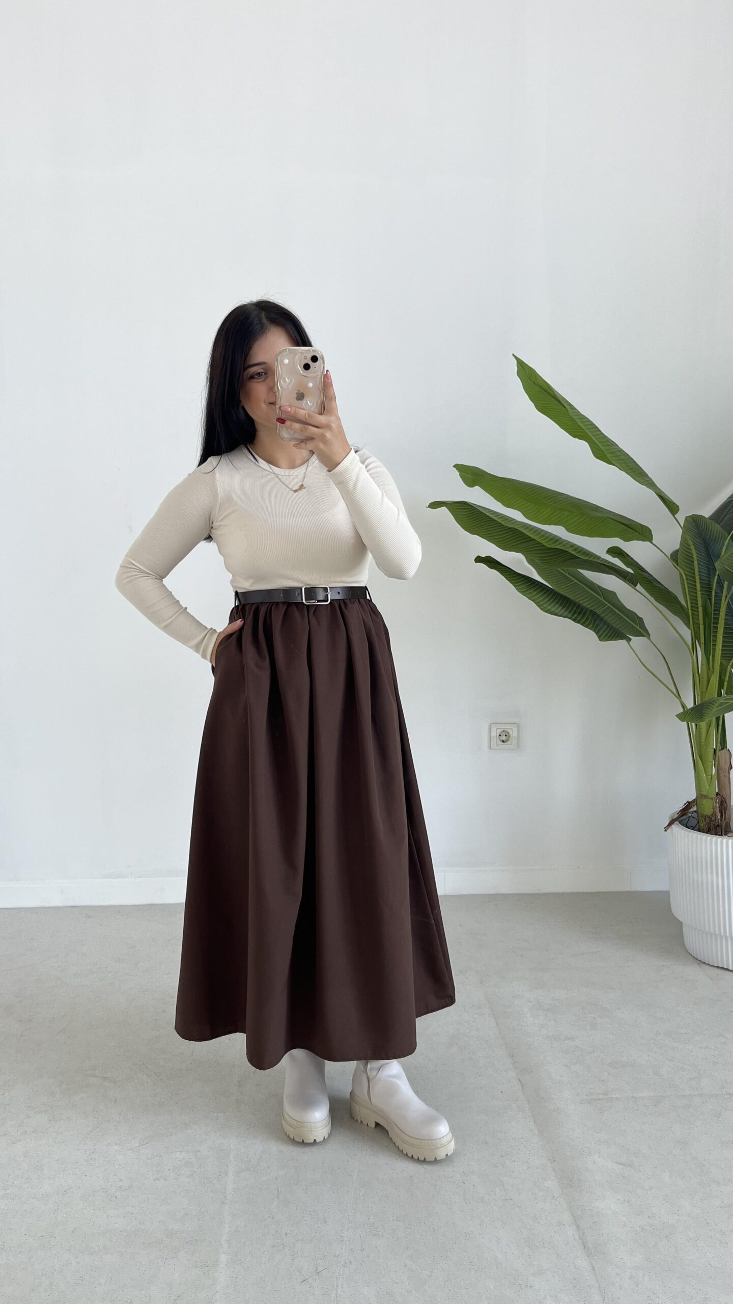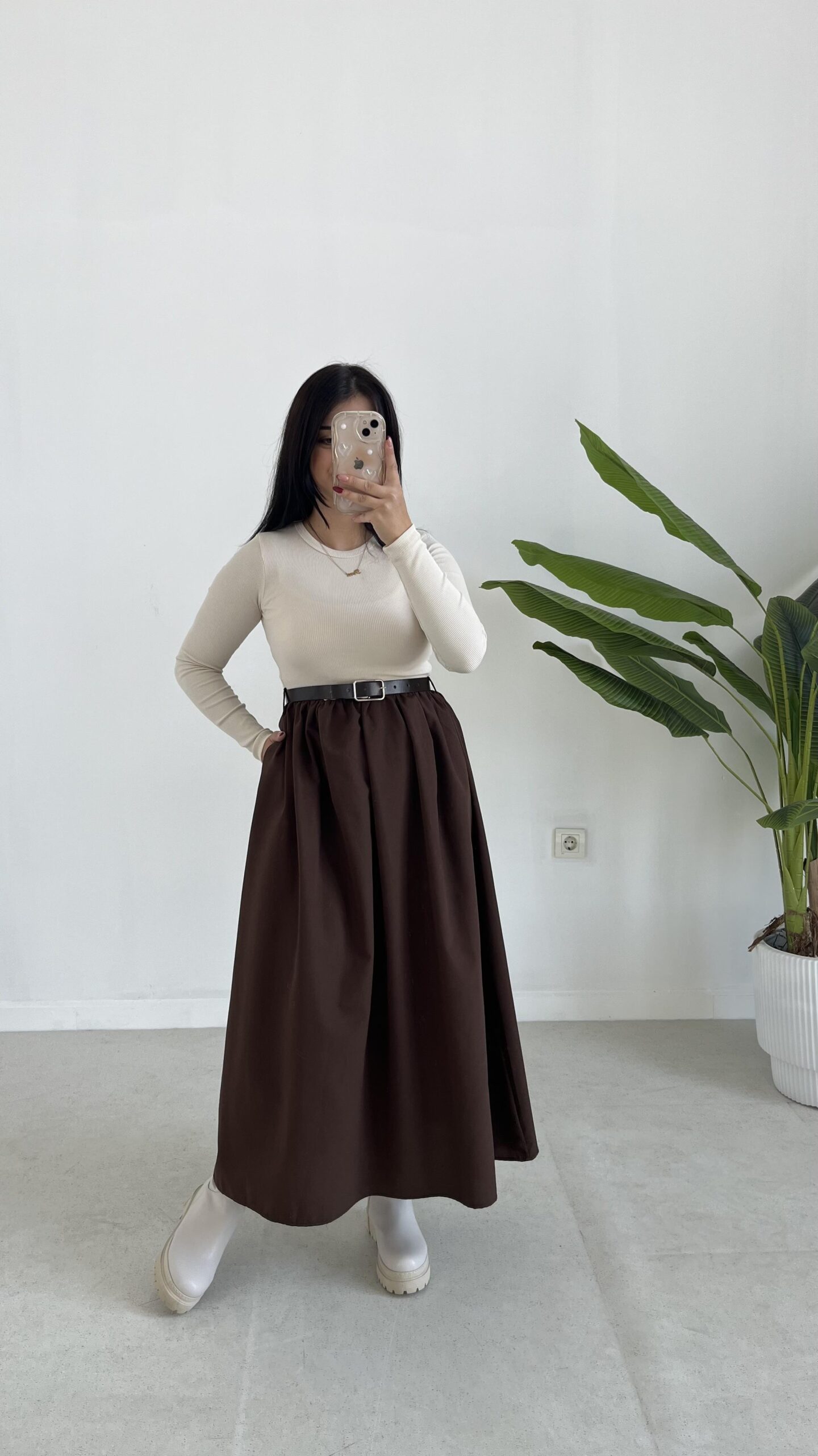 Eteği Poplin Bodyli Maxi Boy Kemerli Elbise – Kahve