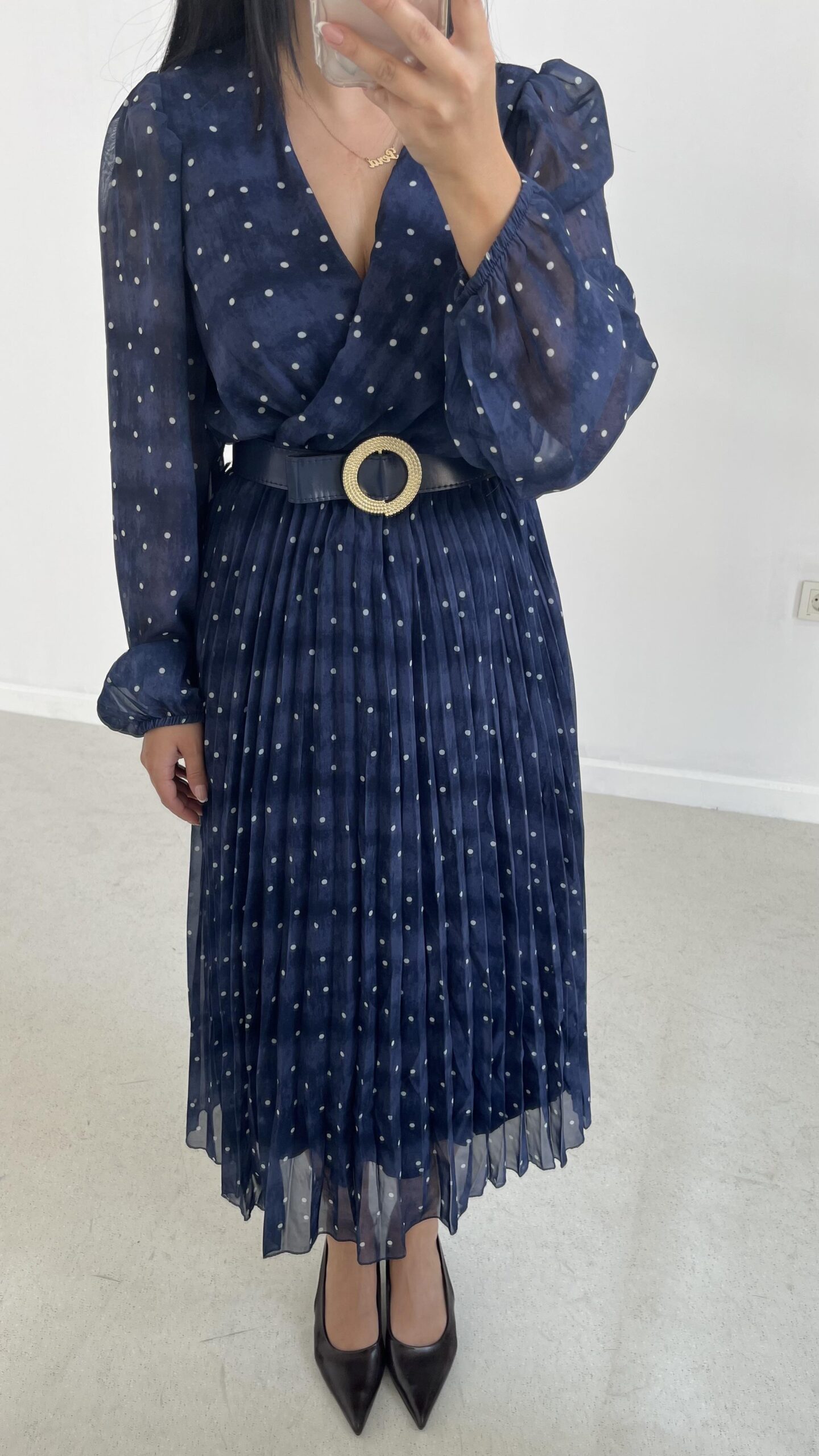 Kruvaze Kemerli Şifon Midi Elbise – Mavi