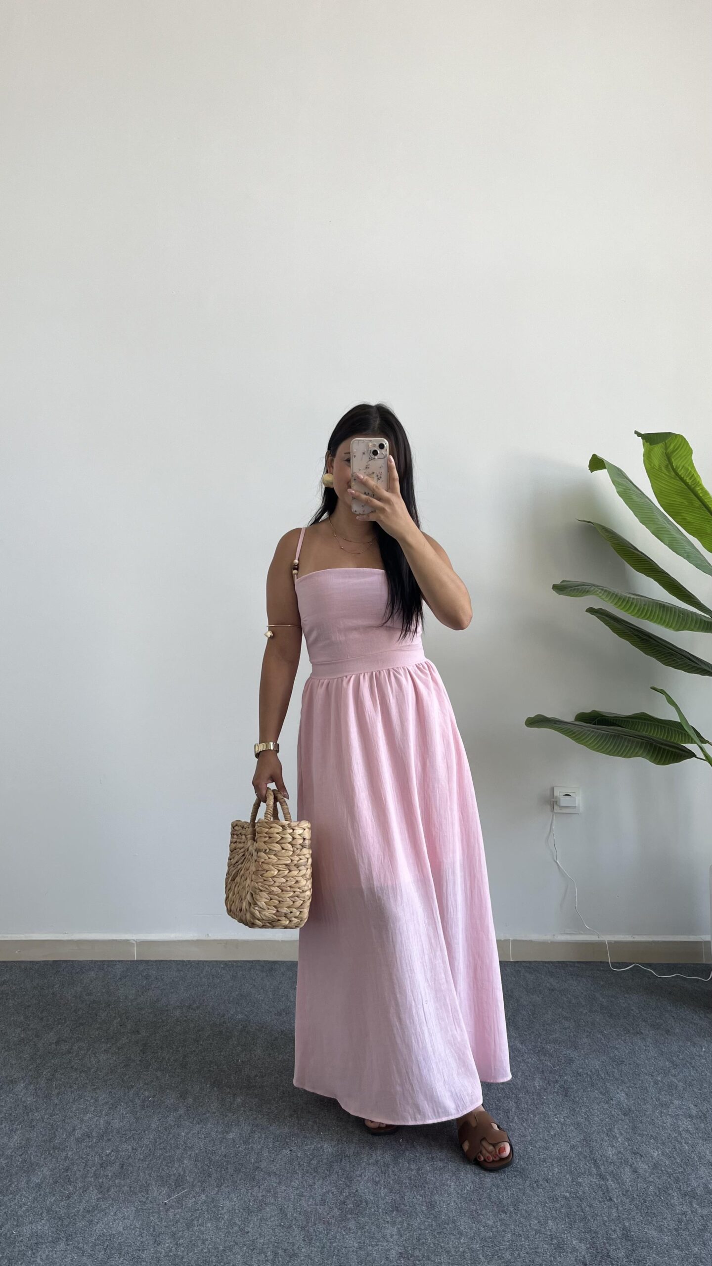 Olesa Sırtı Bağlamalı Keten Elbise – Pembe