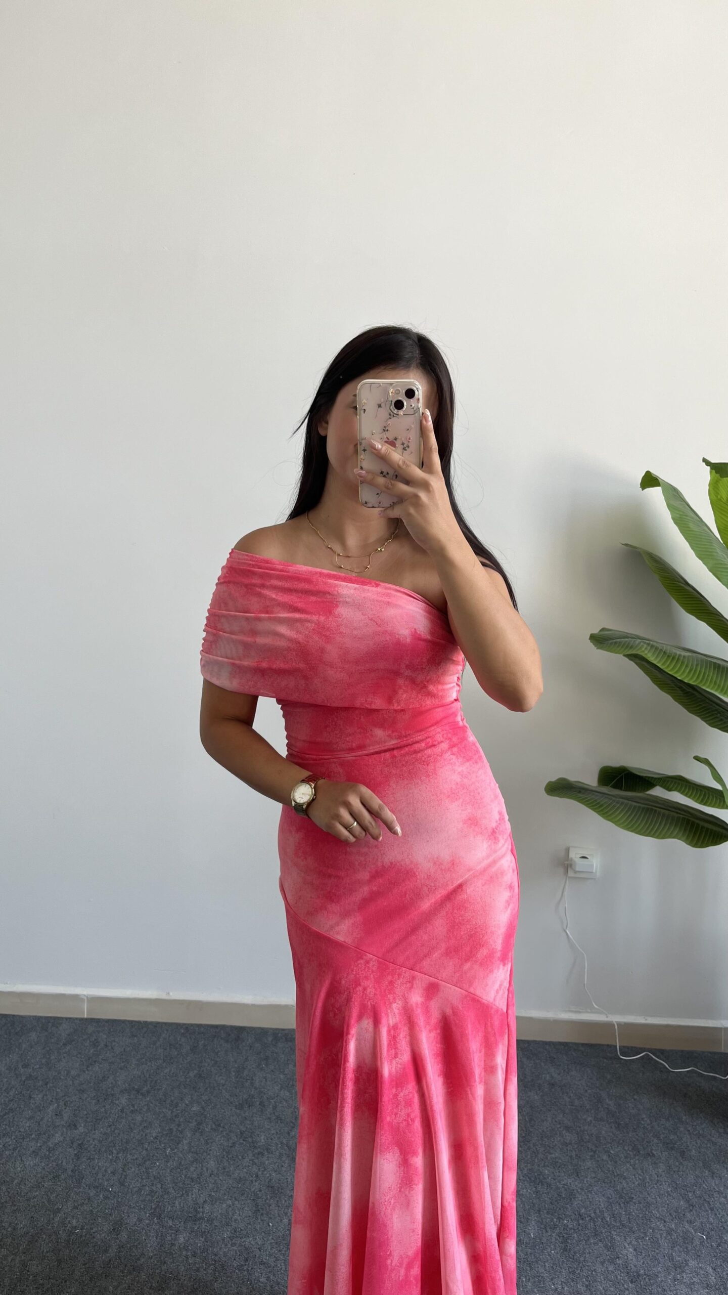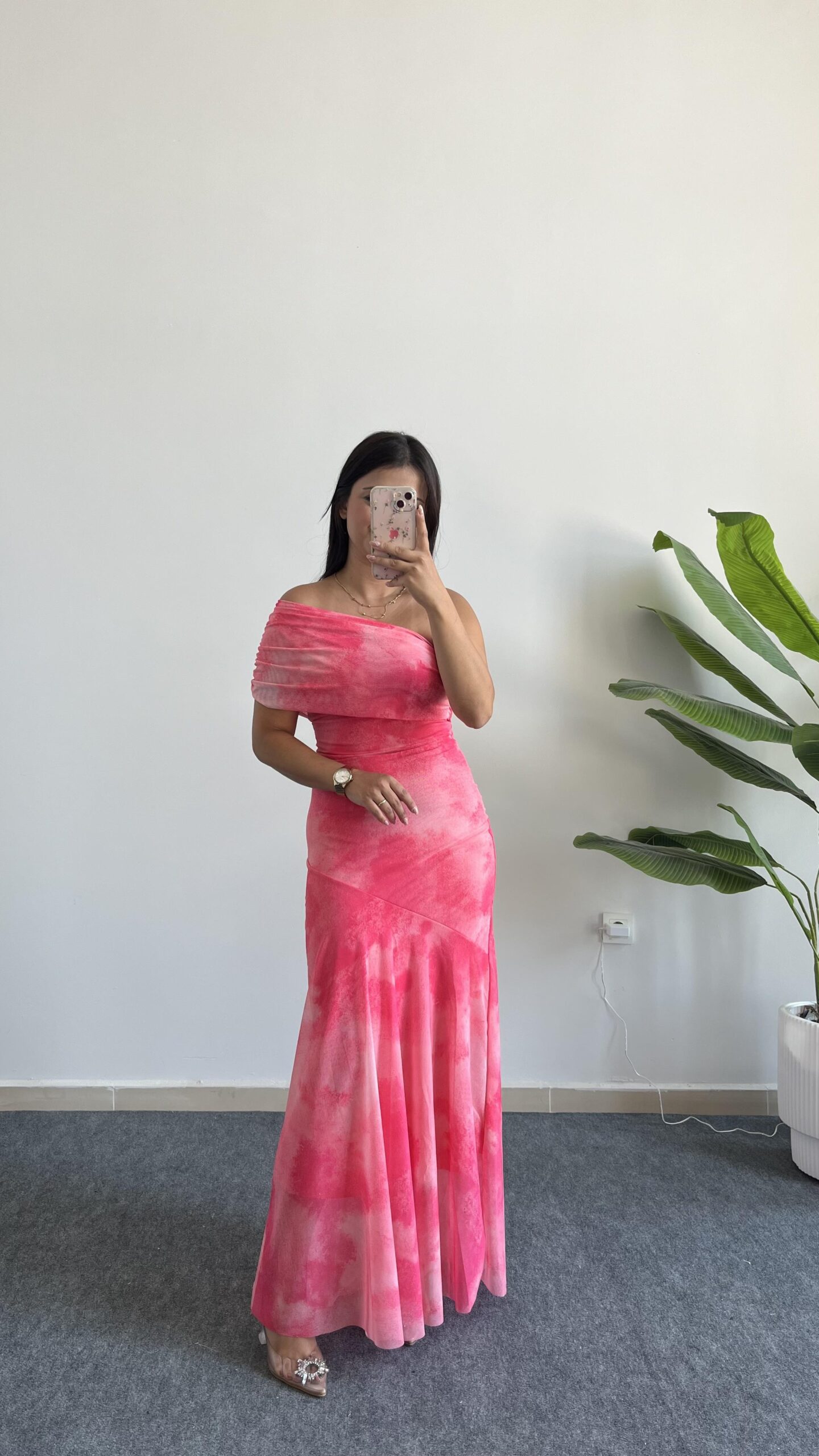 Sandes Tek Omuz Batik Desenli Kruvaze Tül Elbise – Pembe