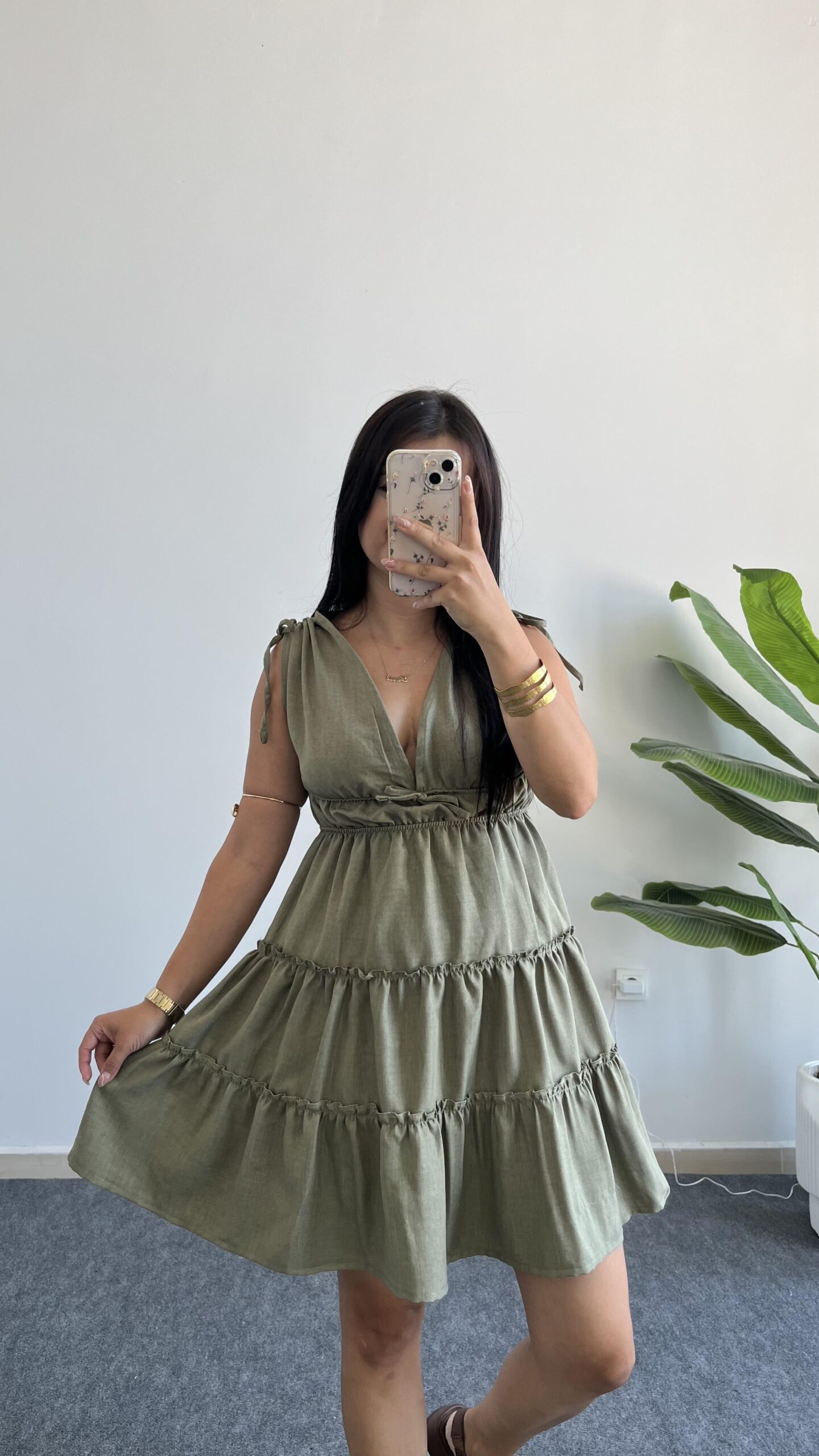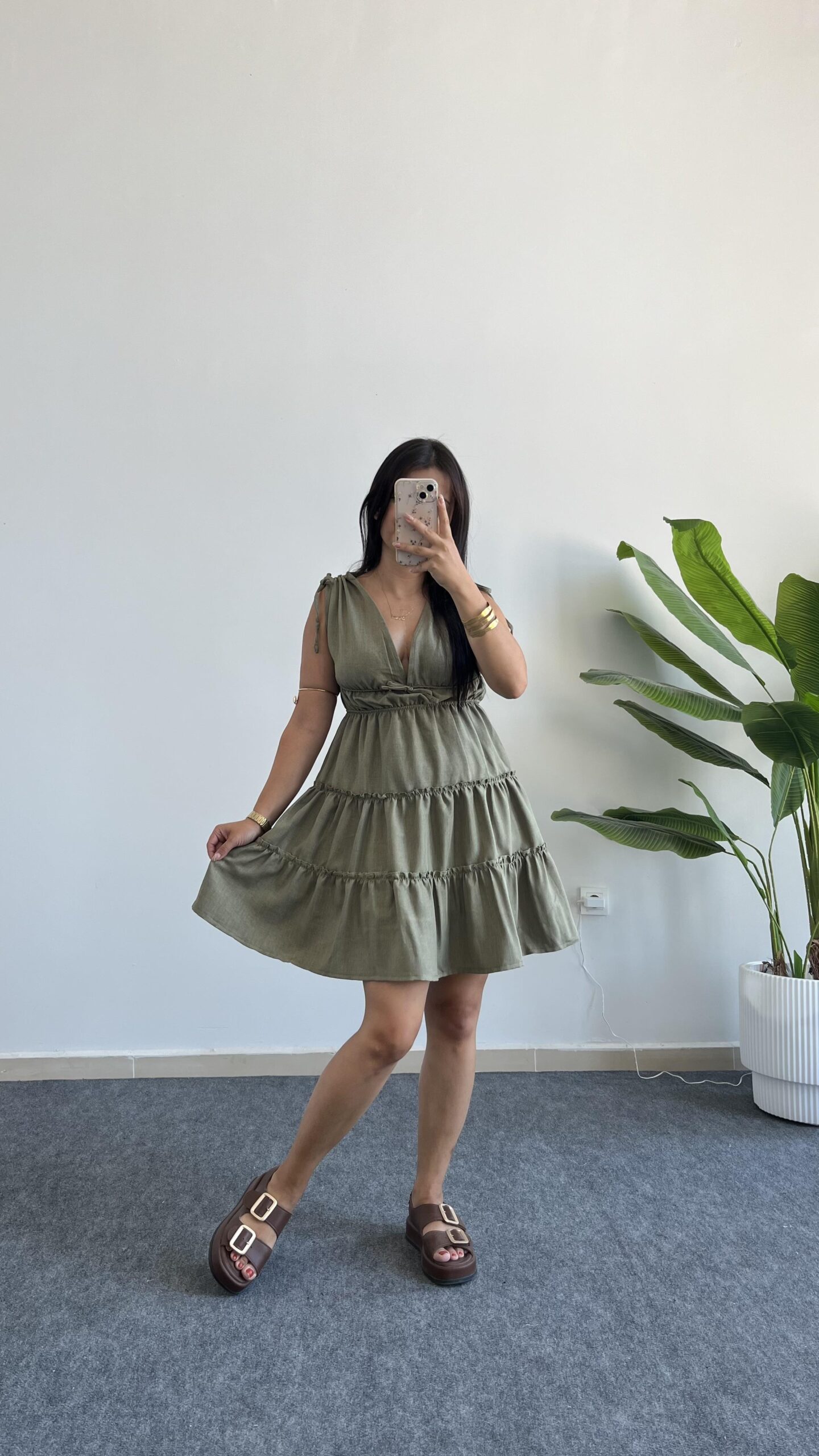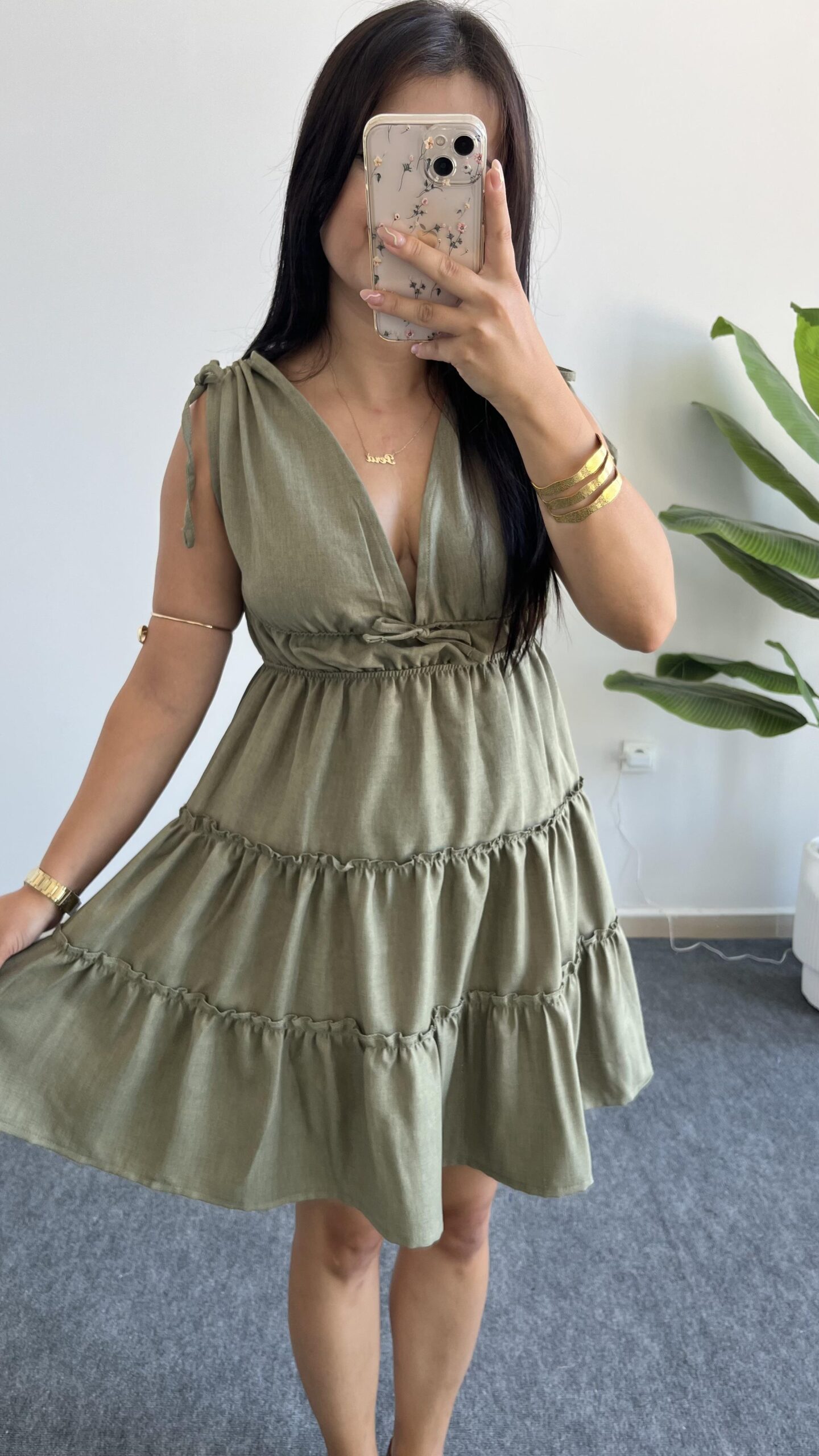 Weras Büzgülü Keten Elbise – Haki