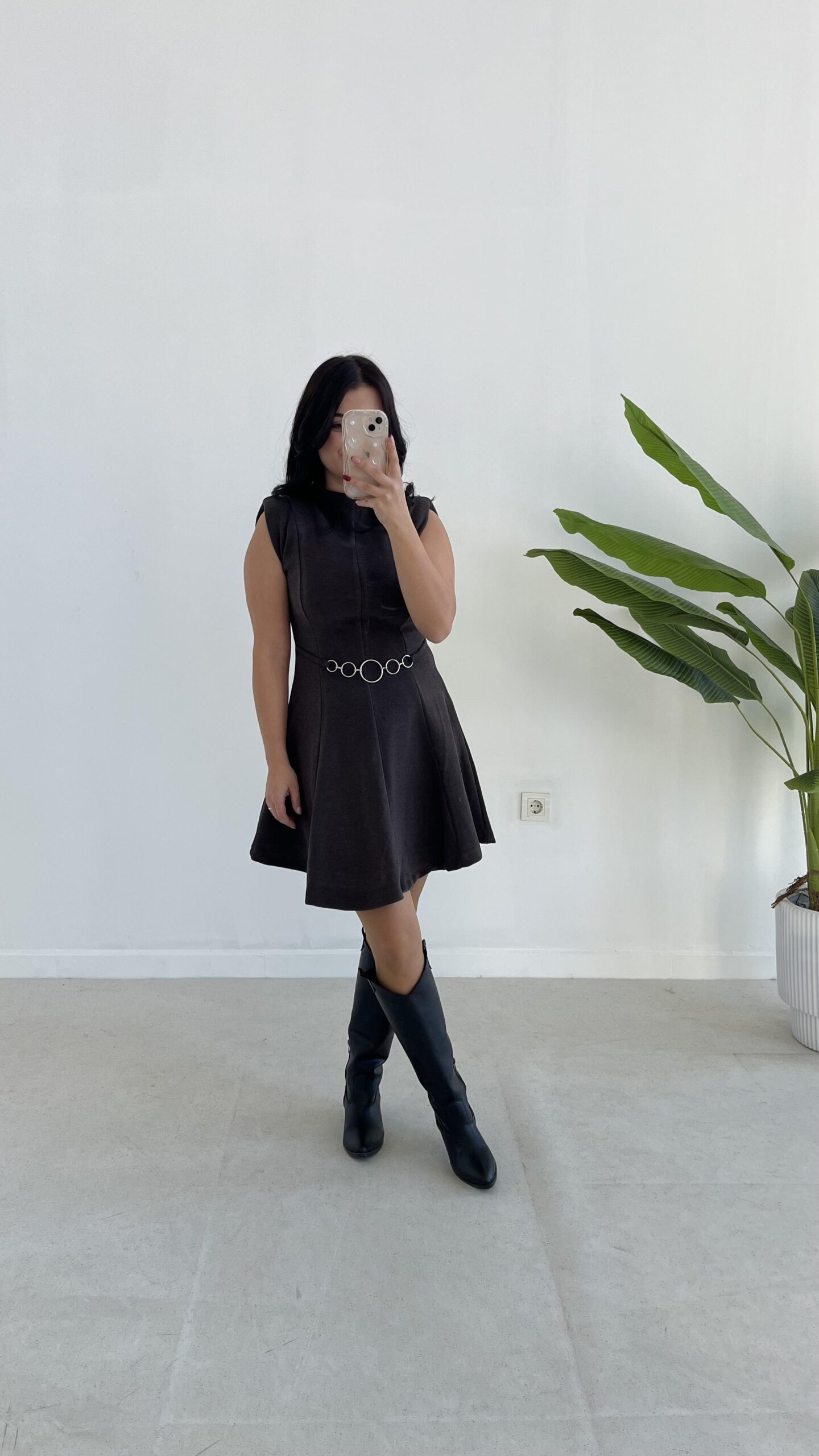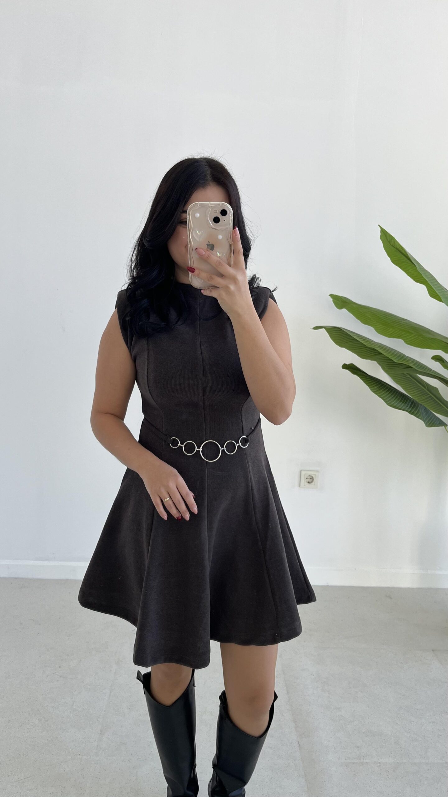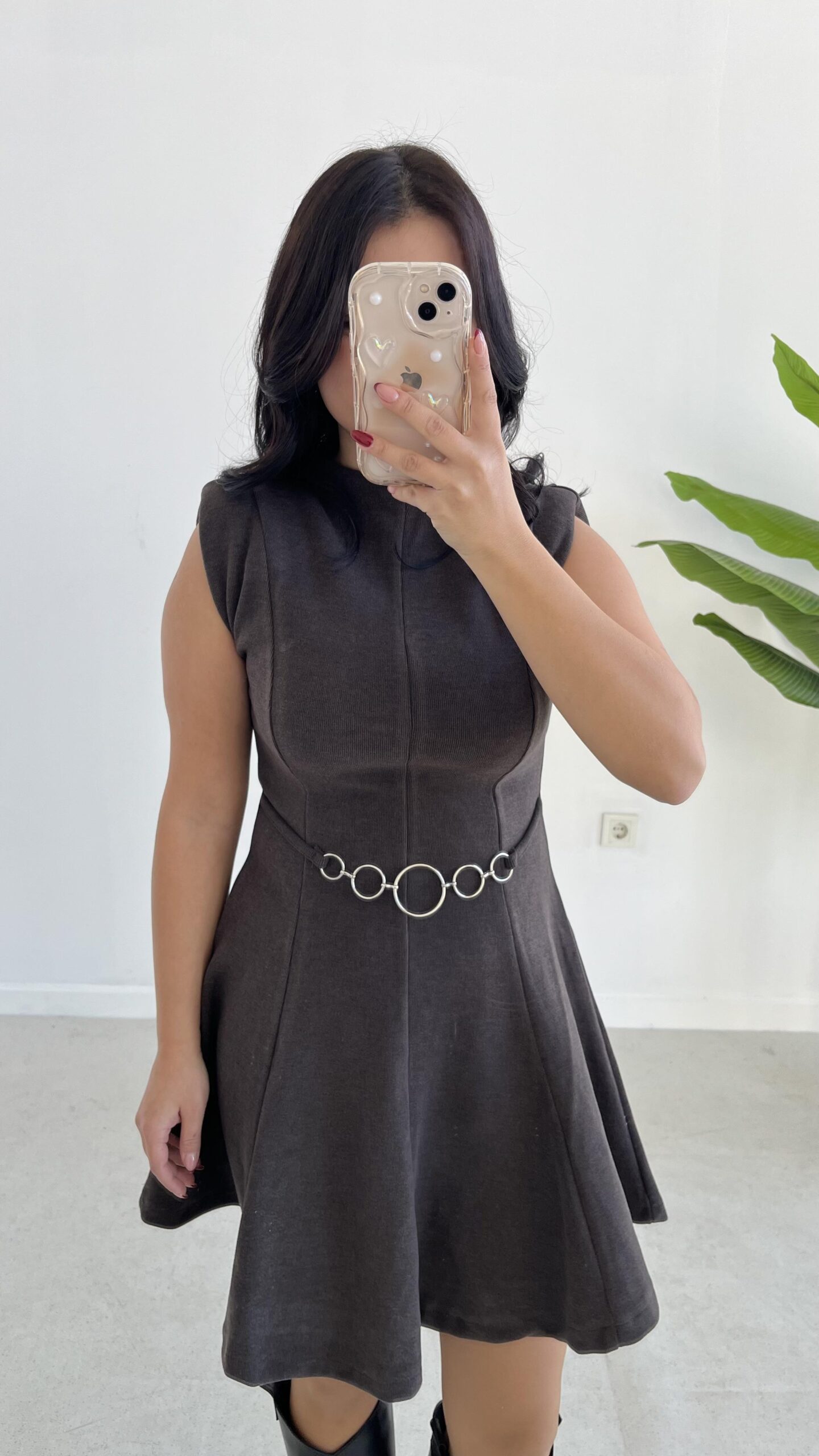 Zincir Aksesuarlı Vatkalı Selanik Elbise – Kahve