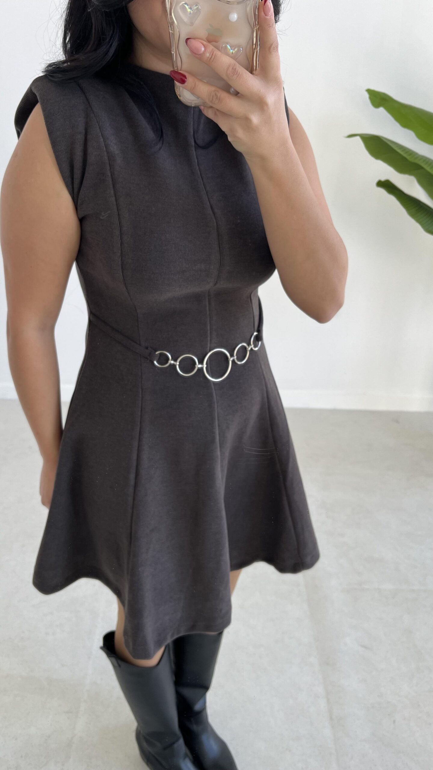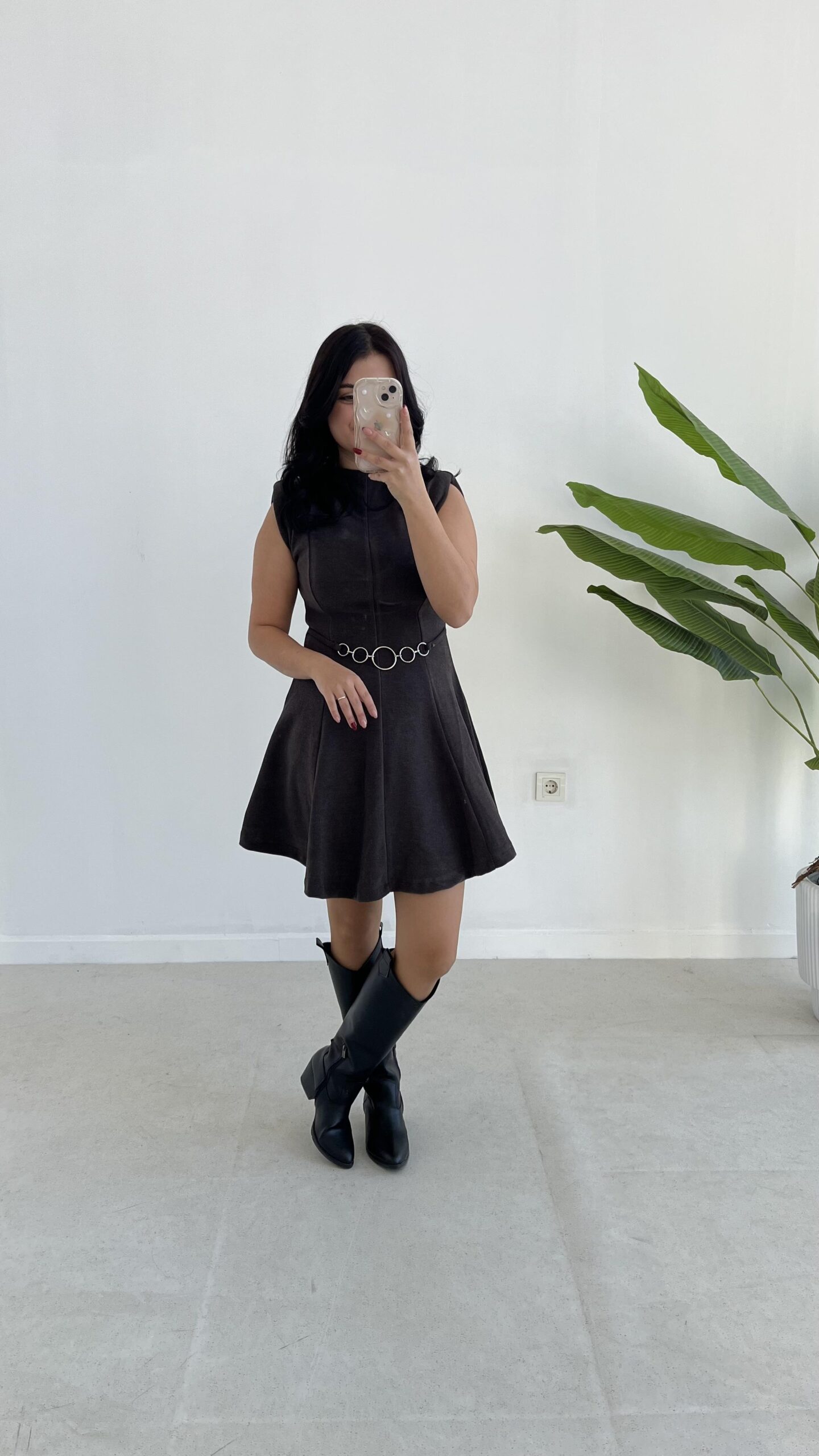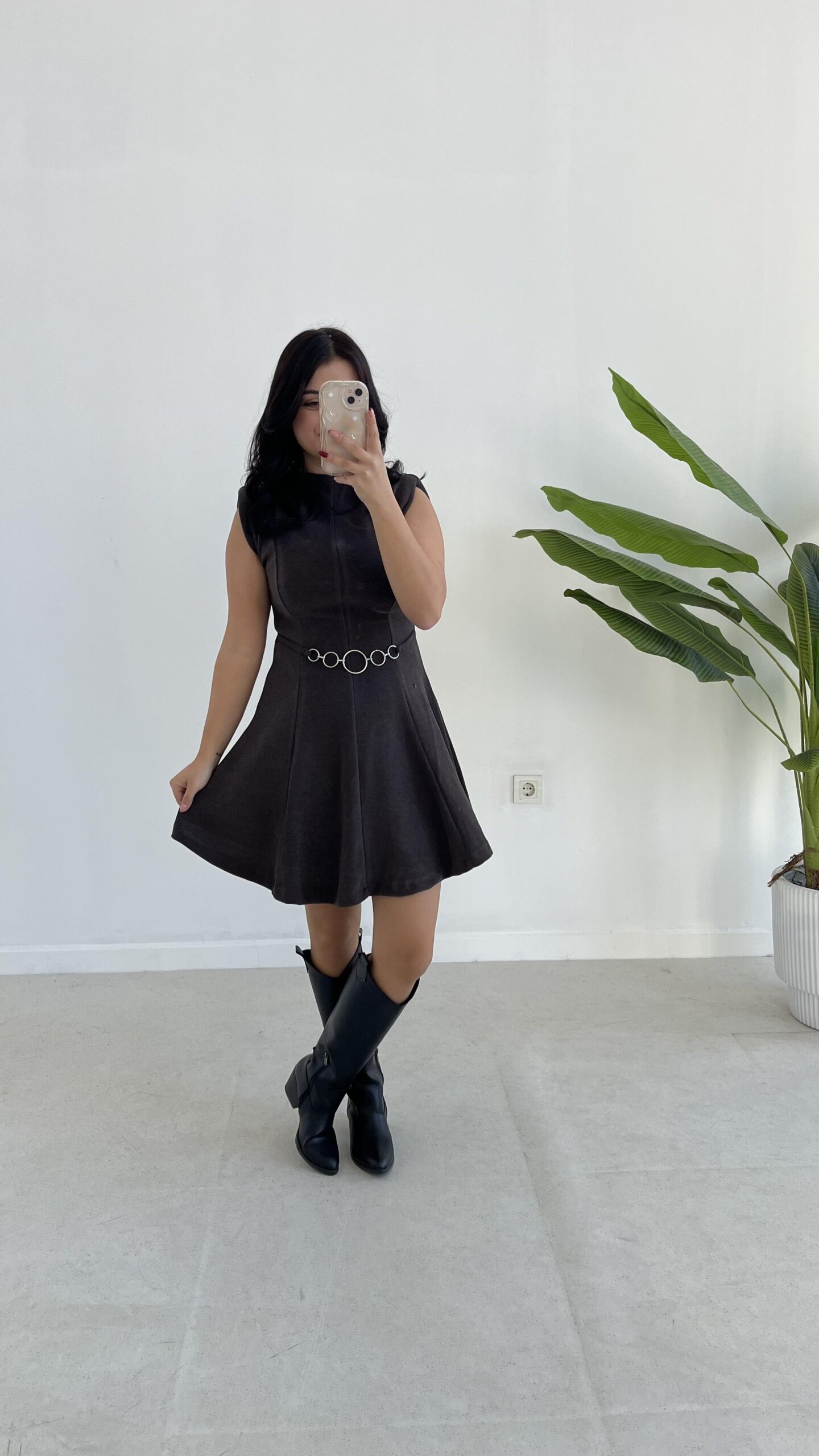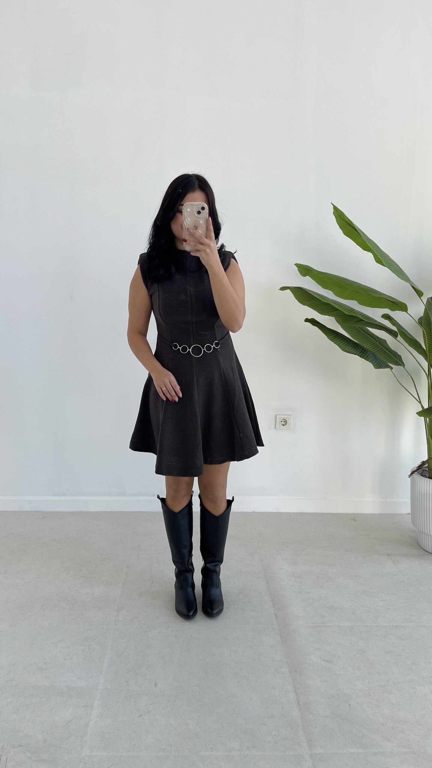 Zincir Aksesuarlı Vatkalı Selanik Elbise – Kahve