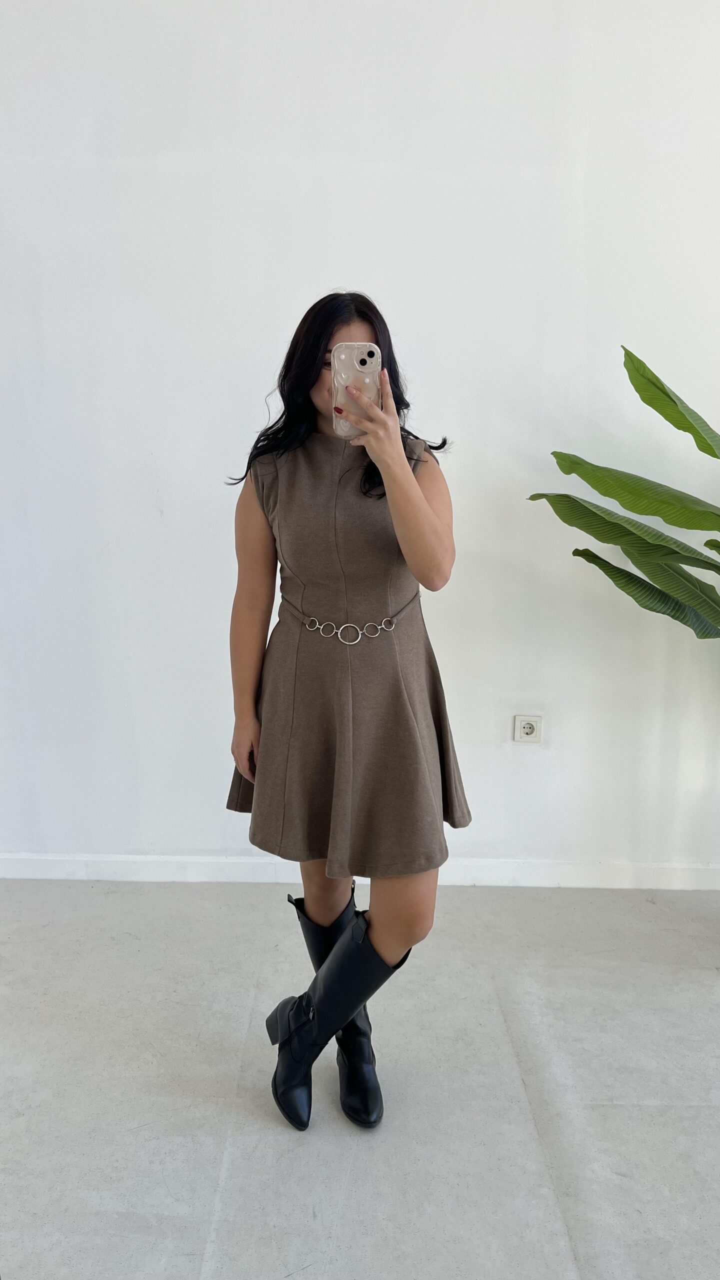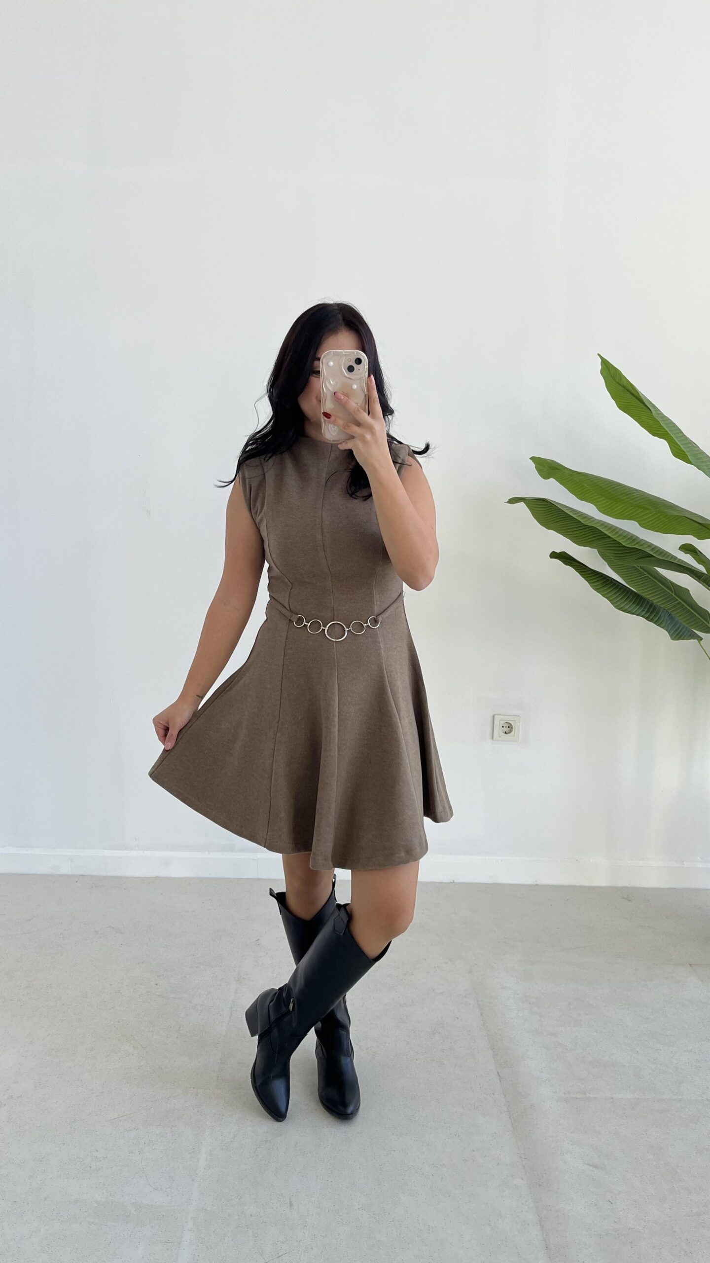 Zincir Aksesuarlı Vatkalı Selanik Elbise - Kahve