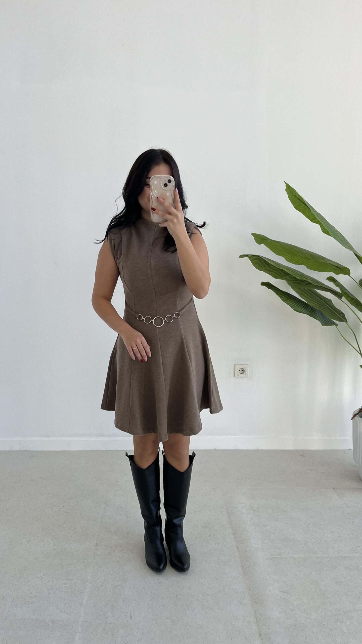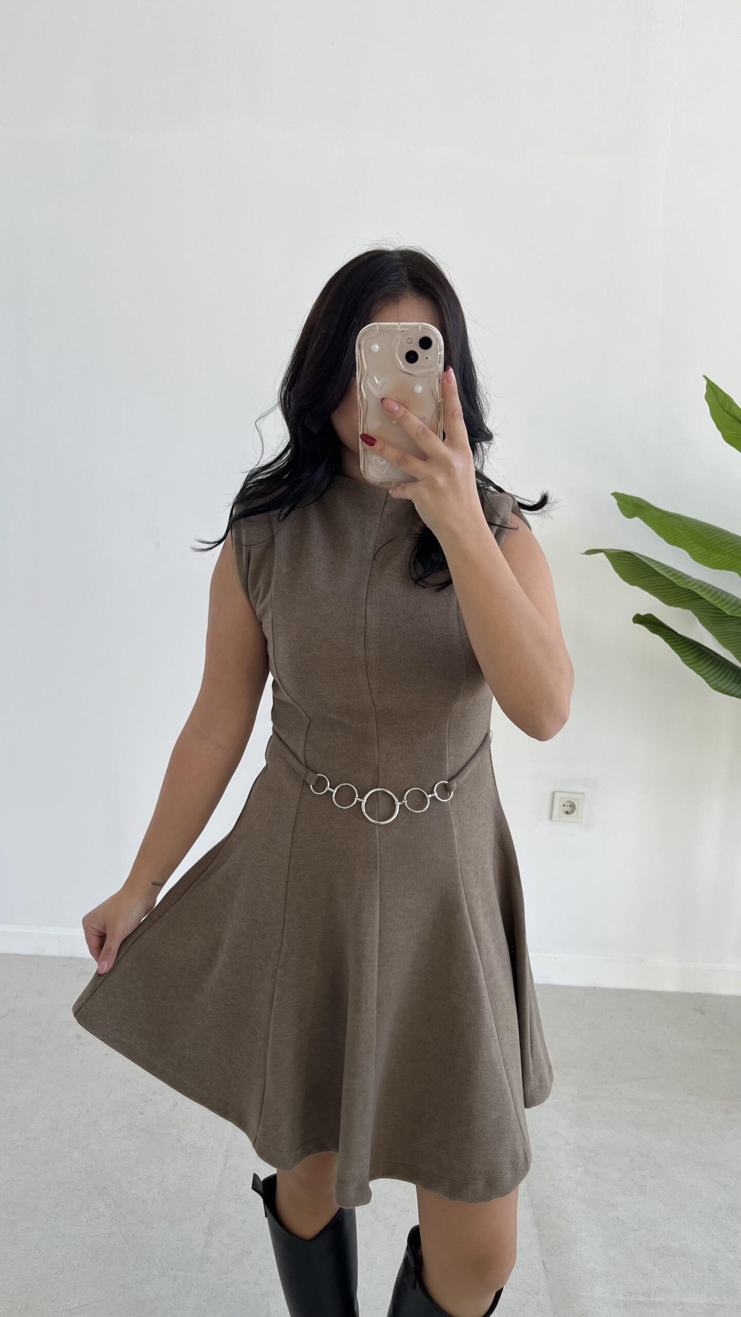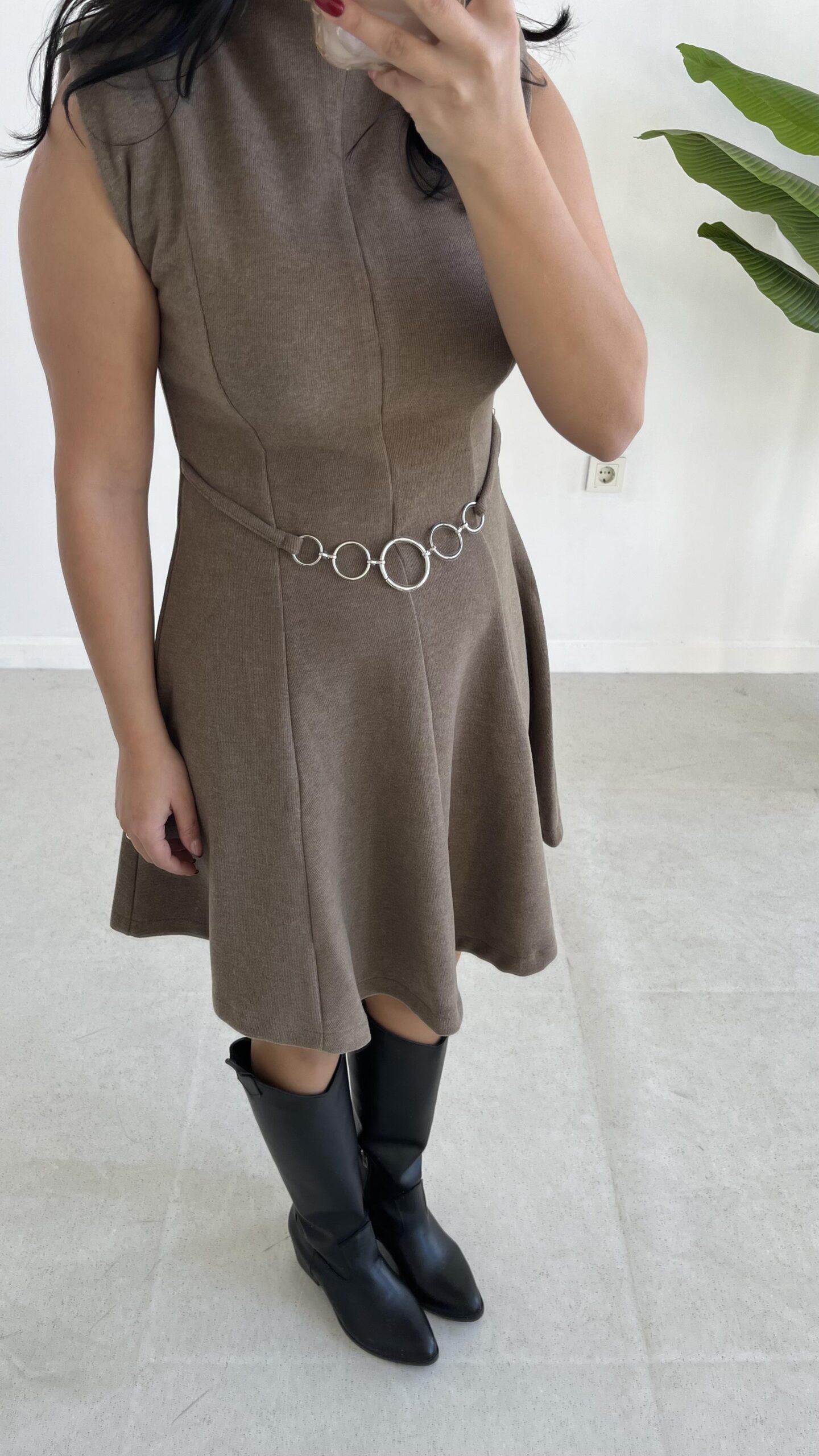 Zincir Aksesuarlı Vatkalı Selanik Elbise – Vizon