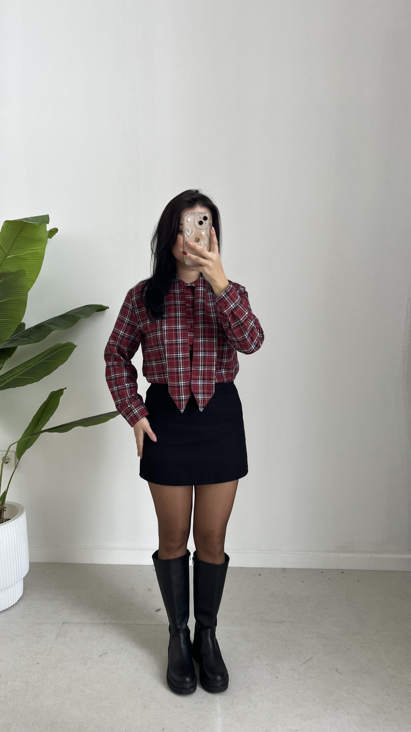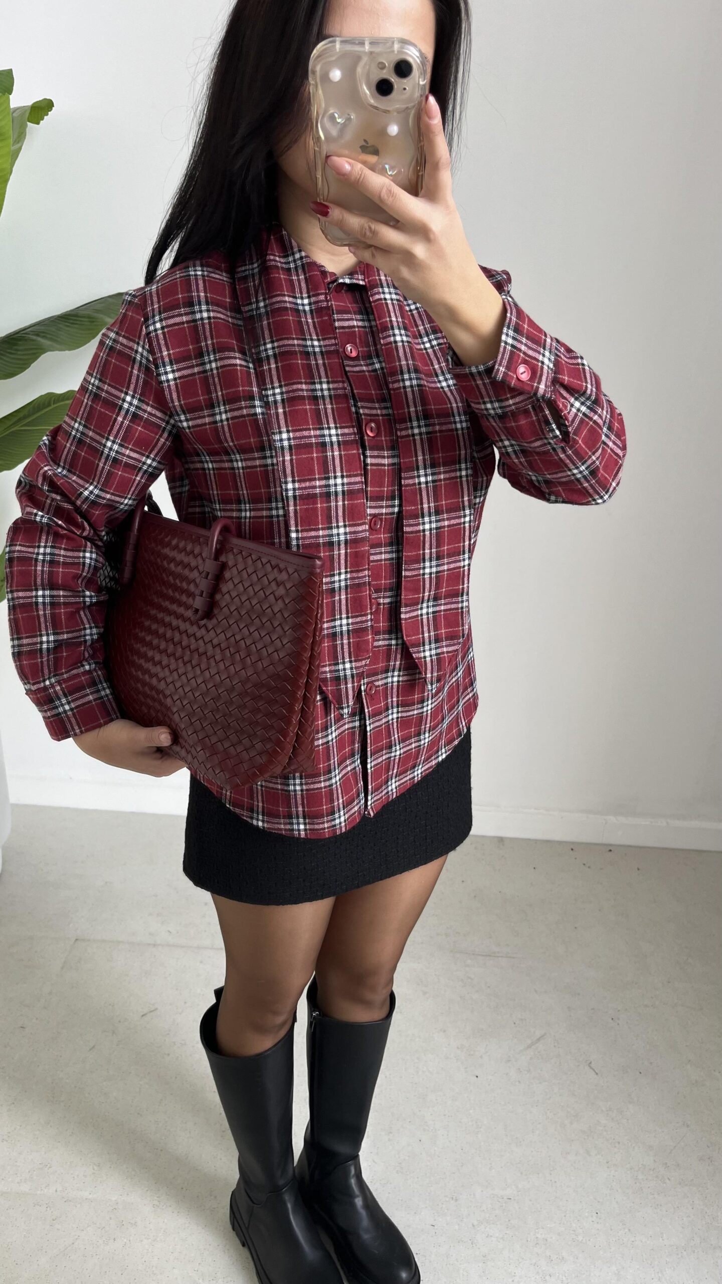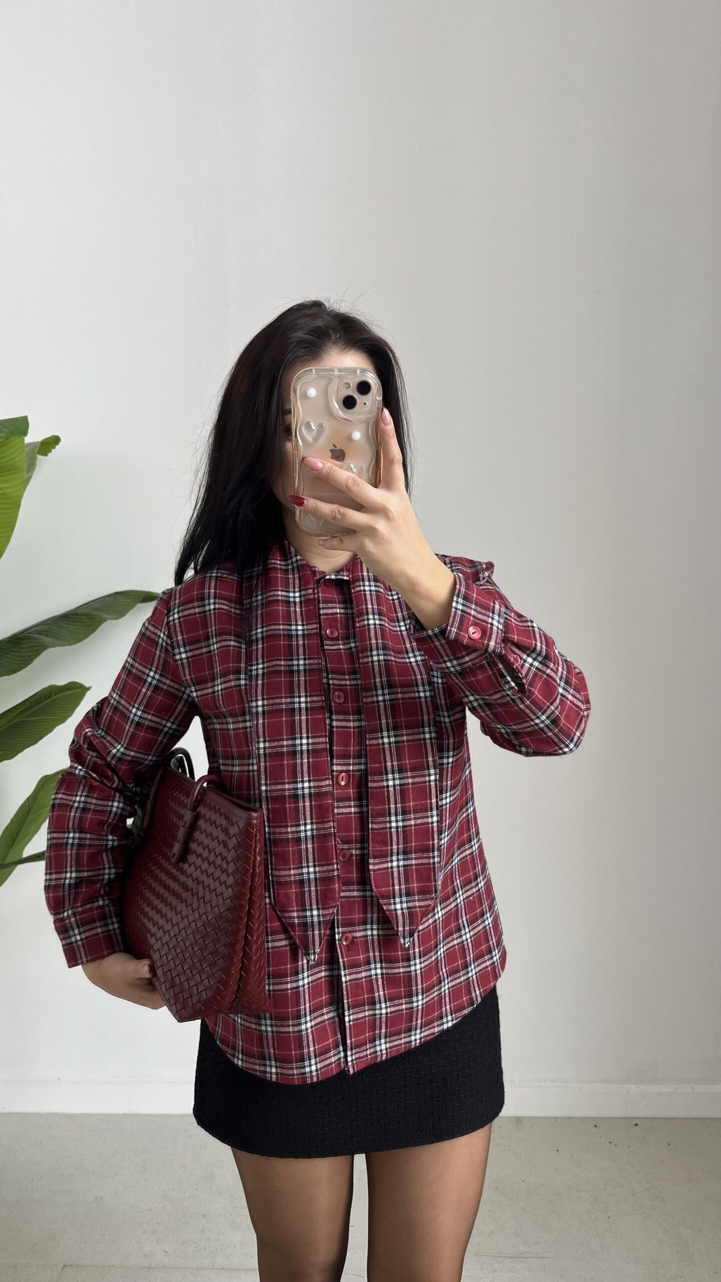 Yakası Fularlı Ekose Gömlek – Bordo