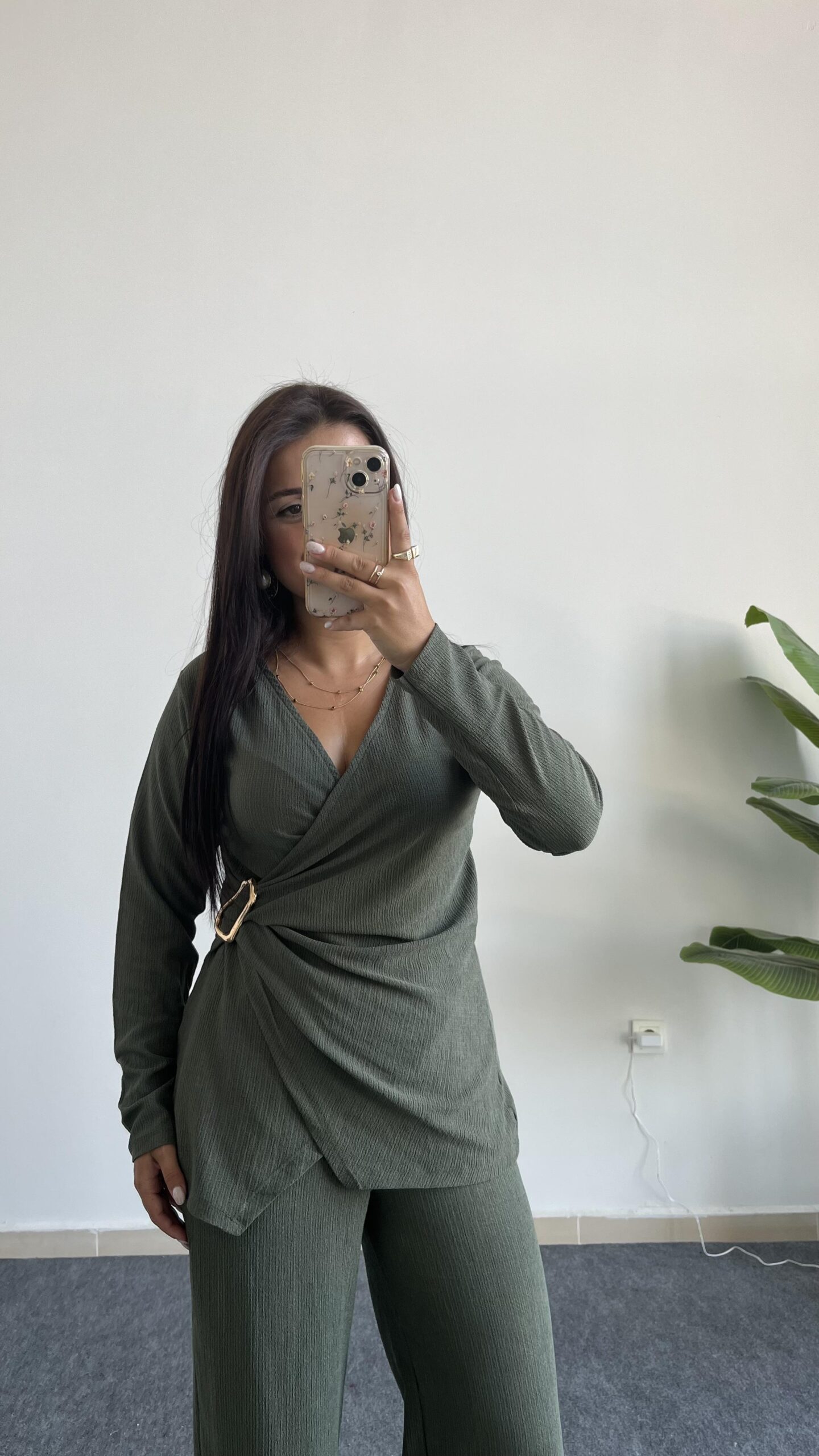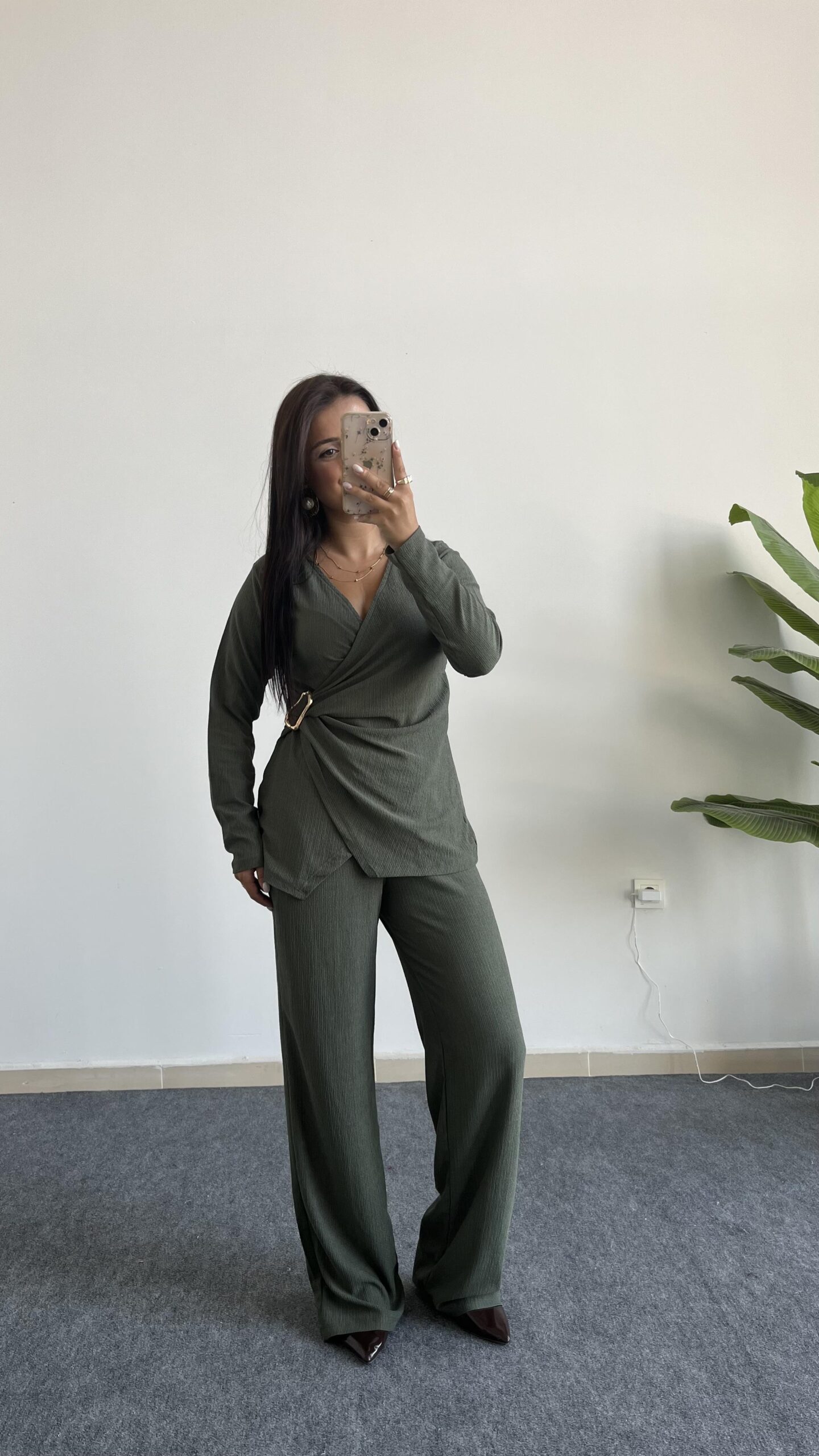 Bonita Kruvaze Yaka Aksesuarlı Takım – Haki