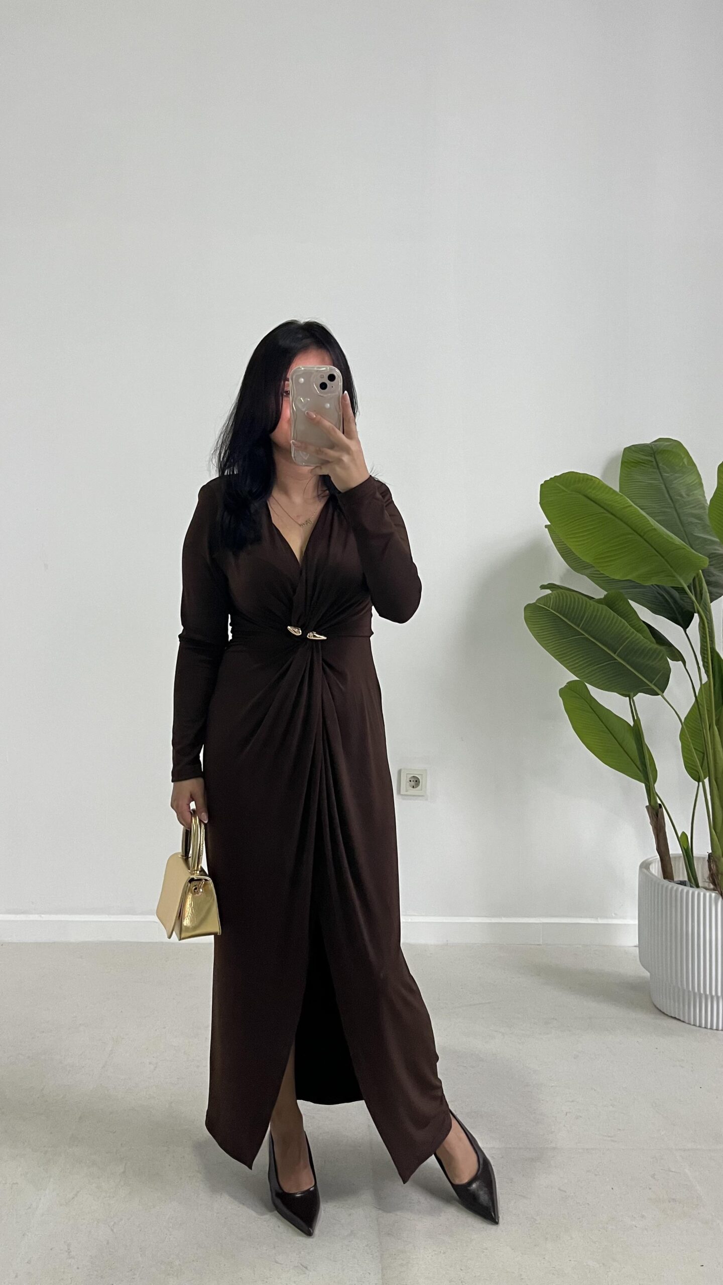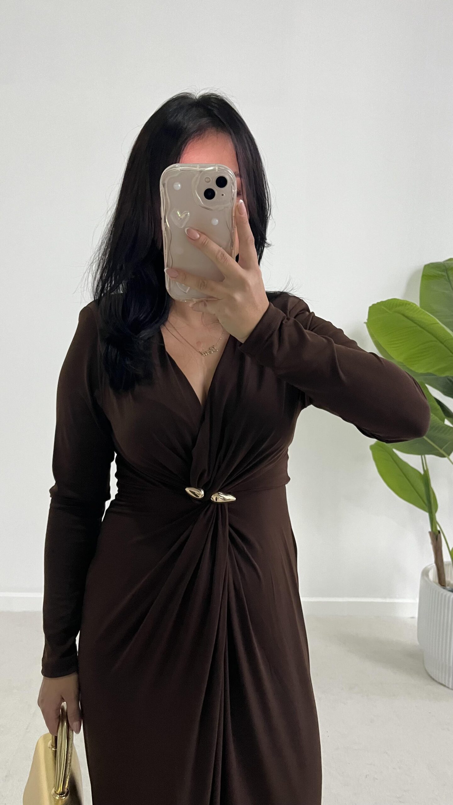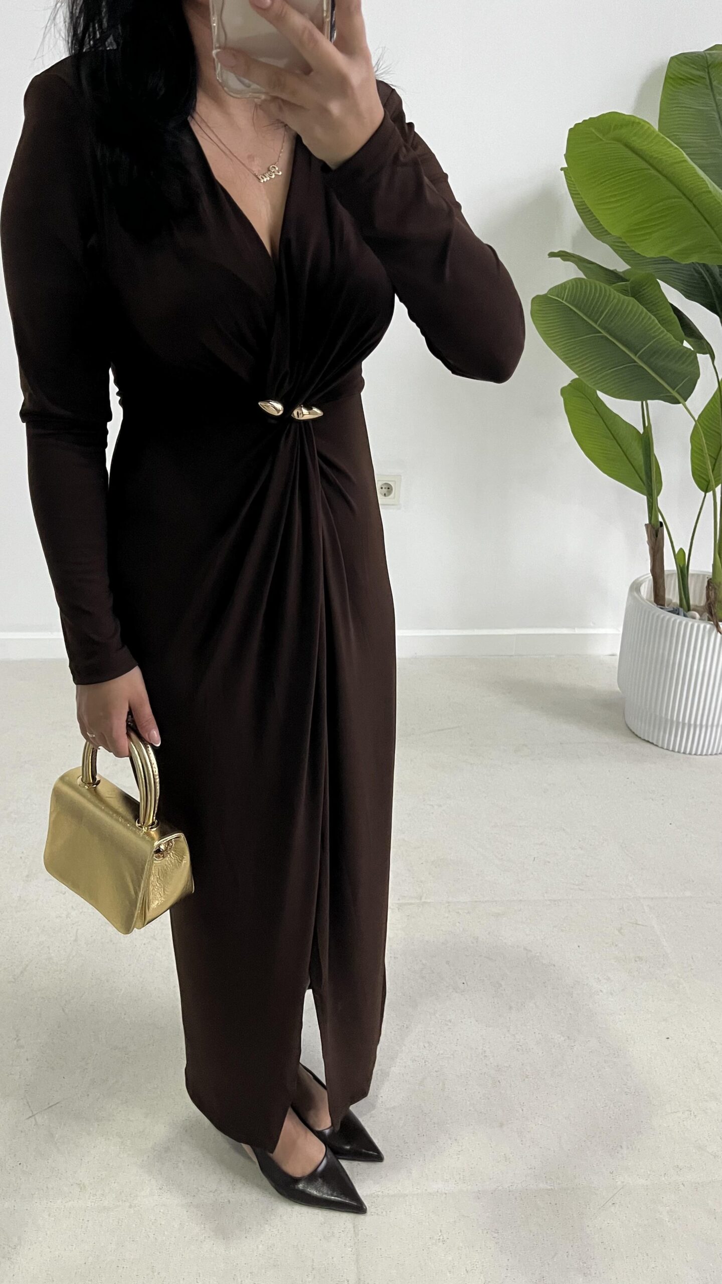 Melodi Gold Aksesuarlı Elbise – Kahverengi