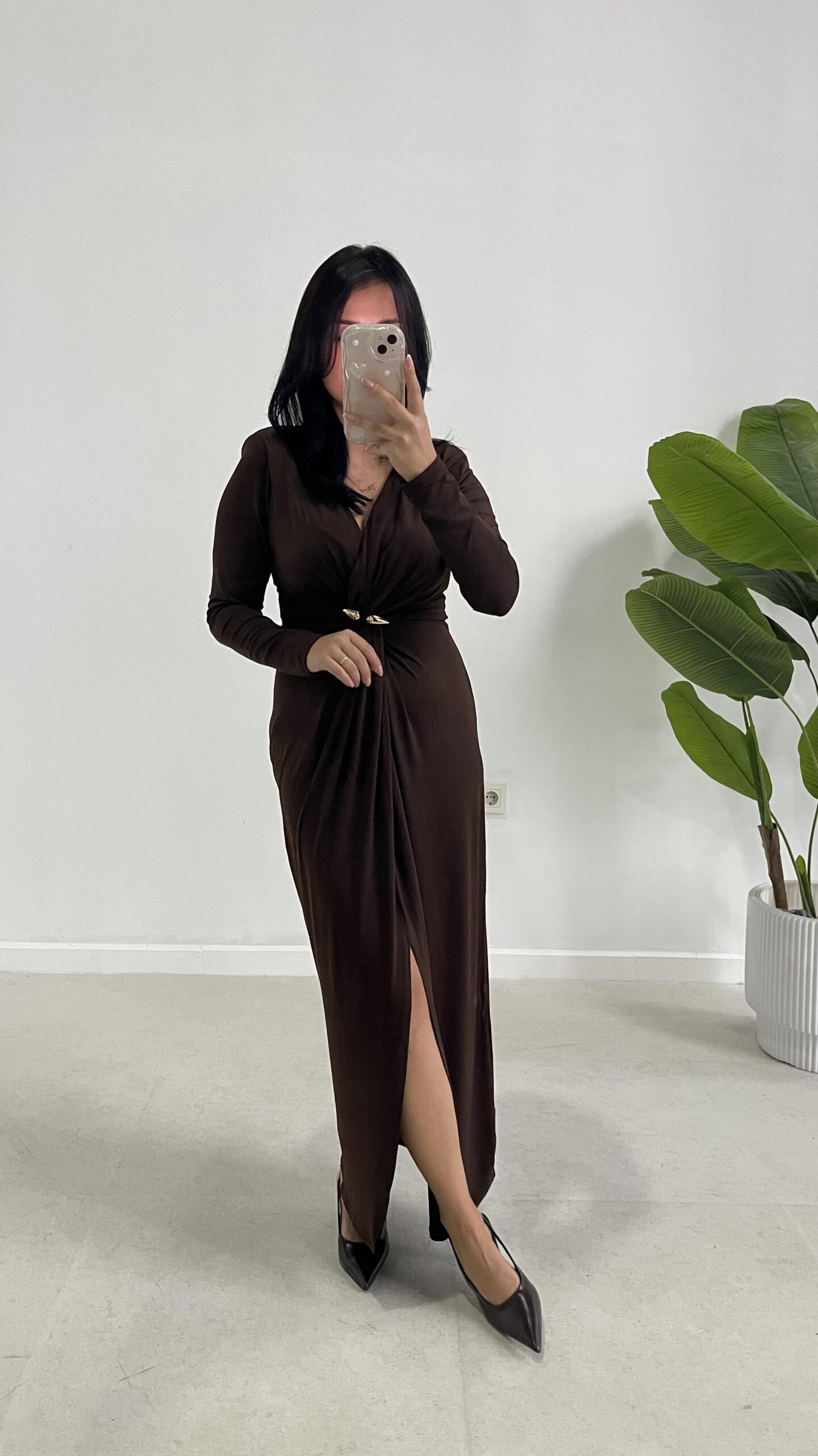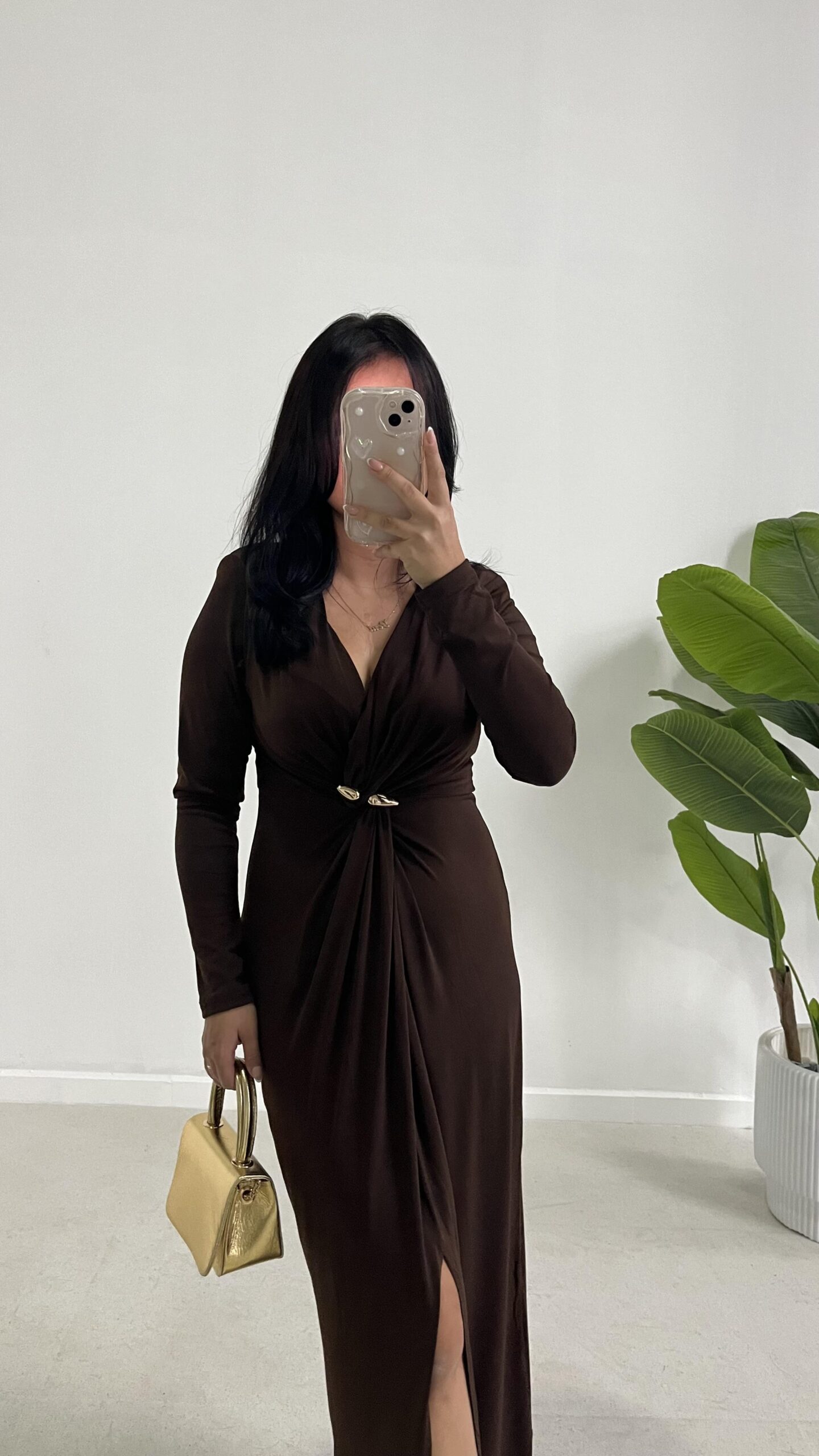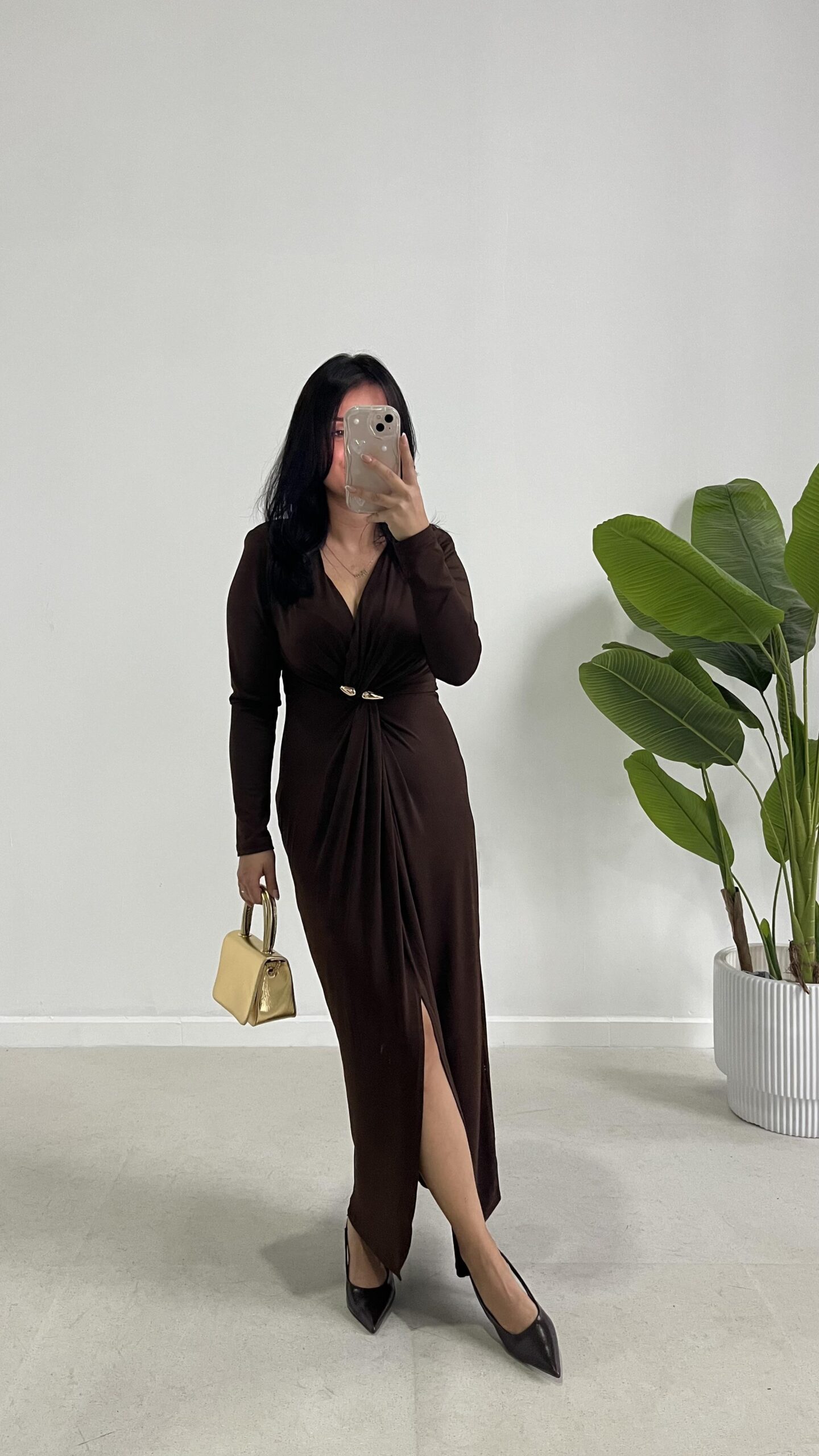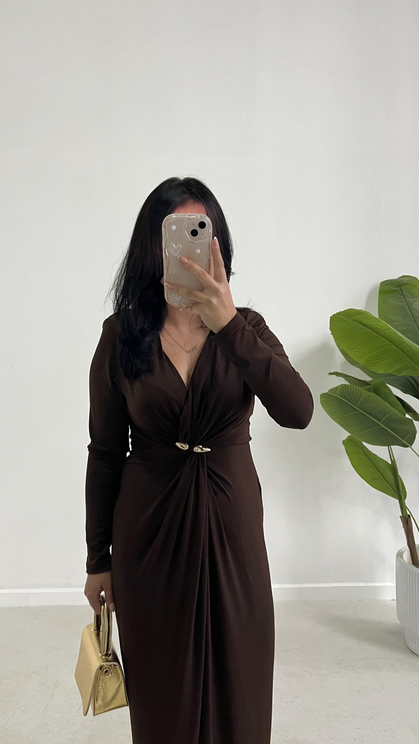 Melodi Gold Aksesuarlı Elbise – Kahverengi
