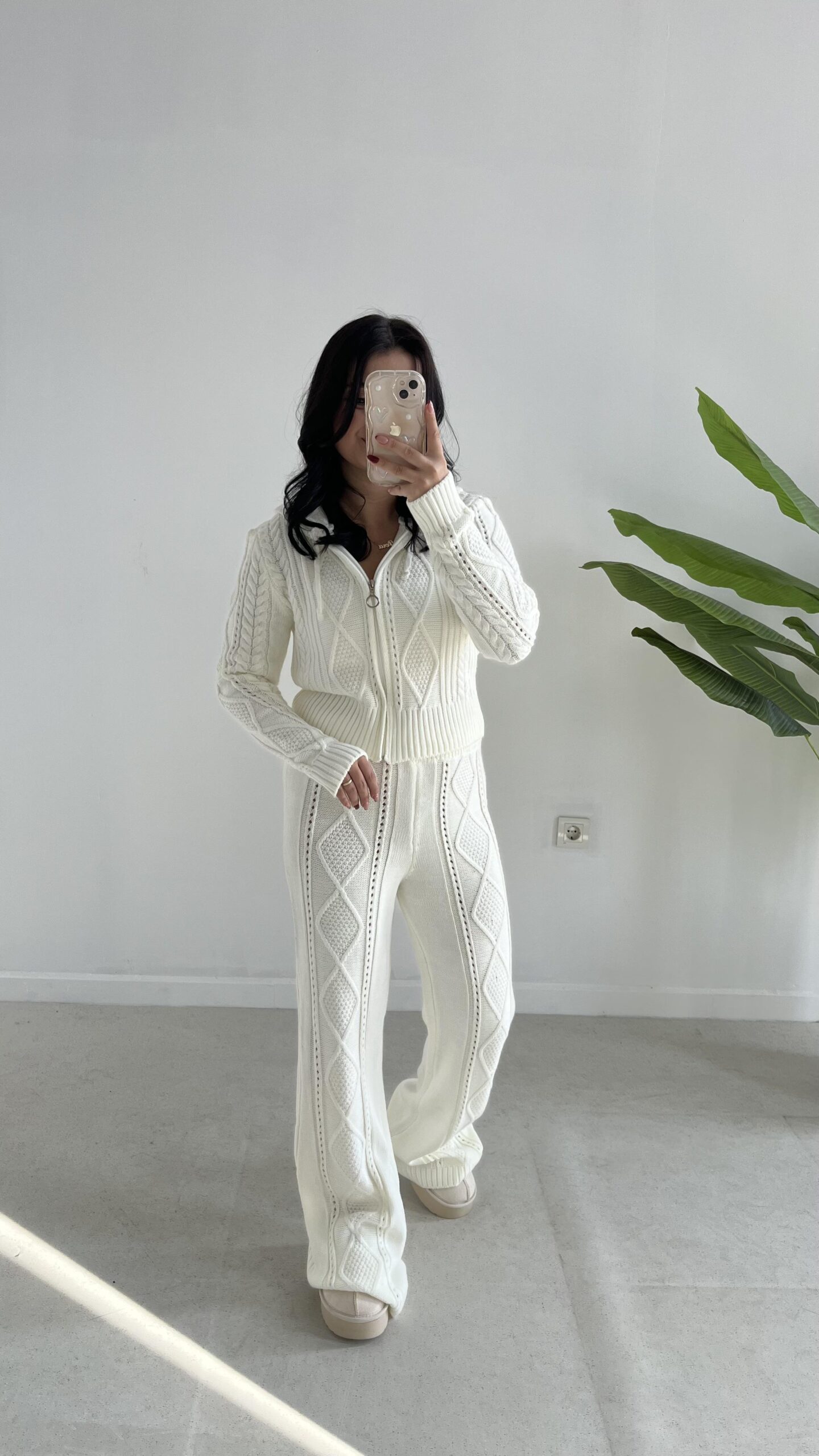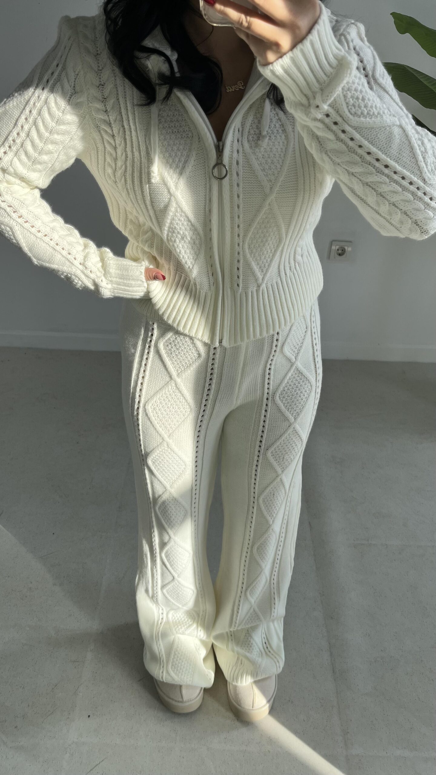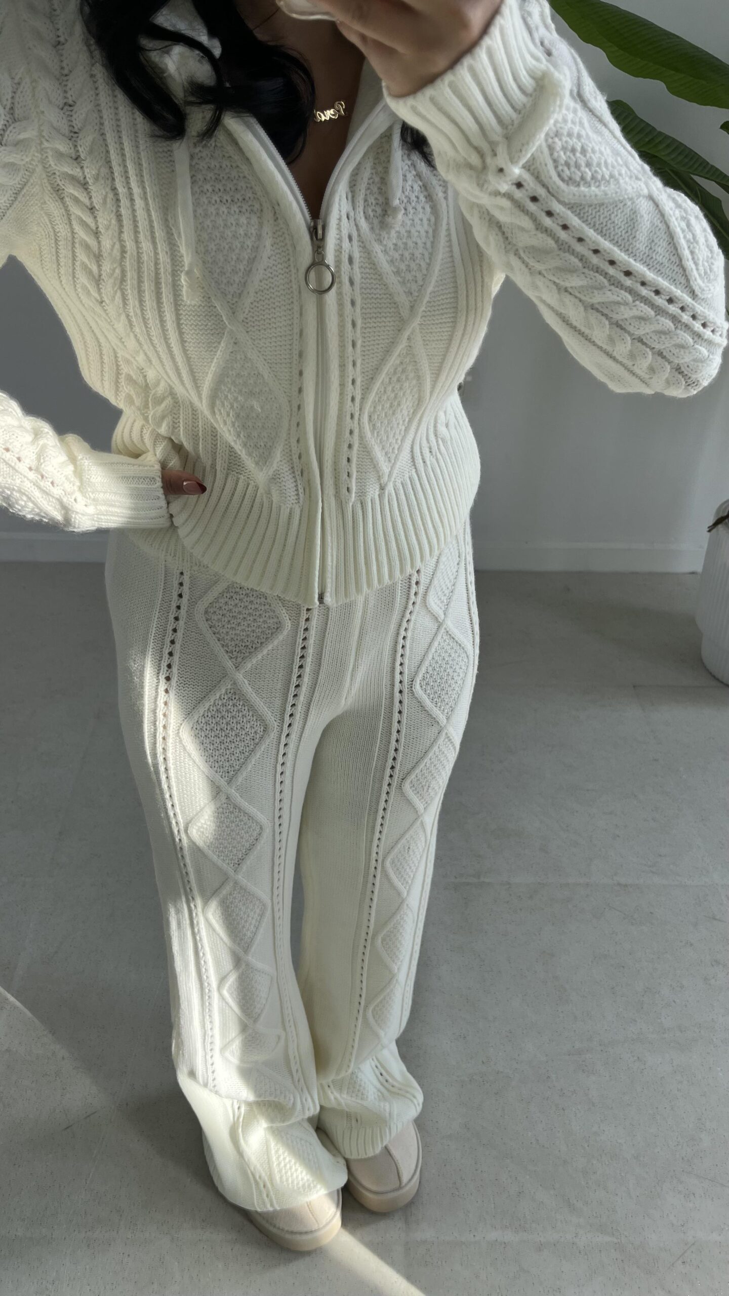 Örgü Desen Kapüşonlu Triko Takım – Ekru