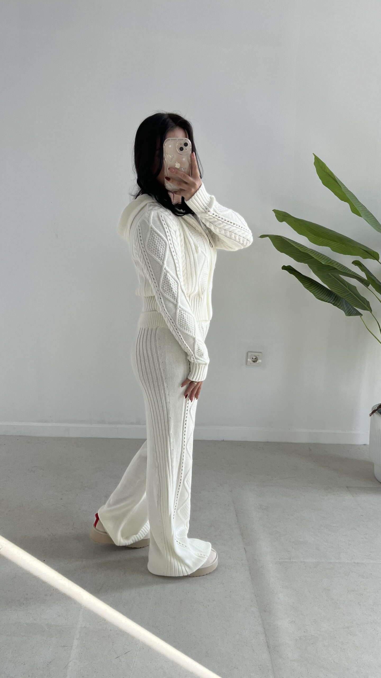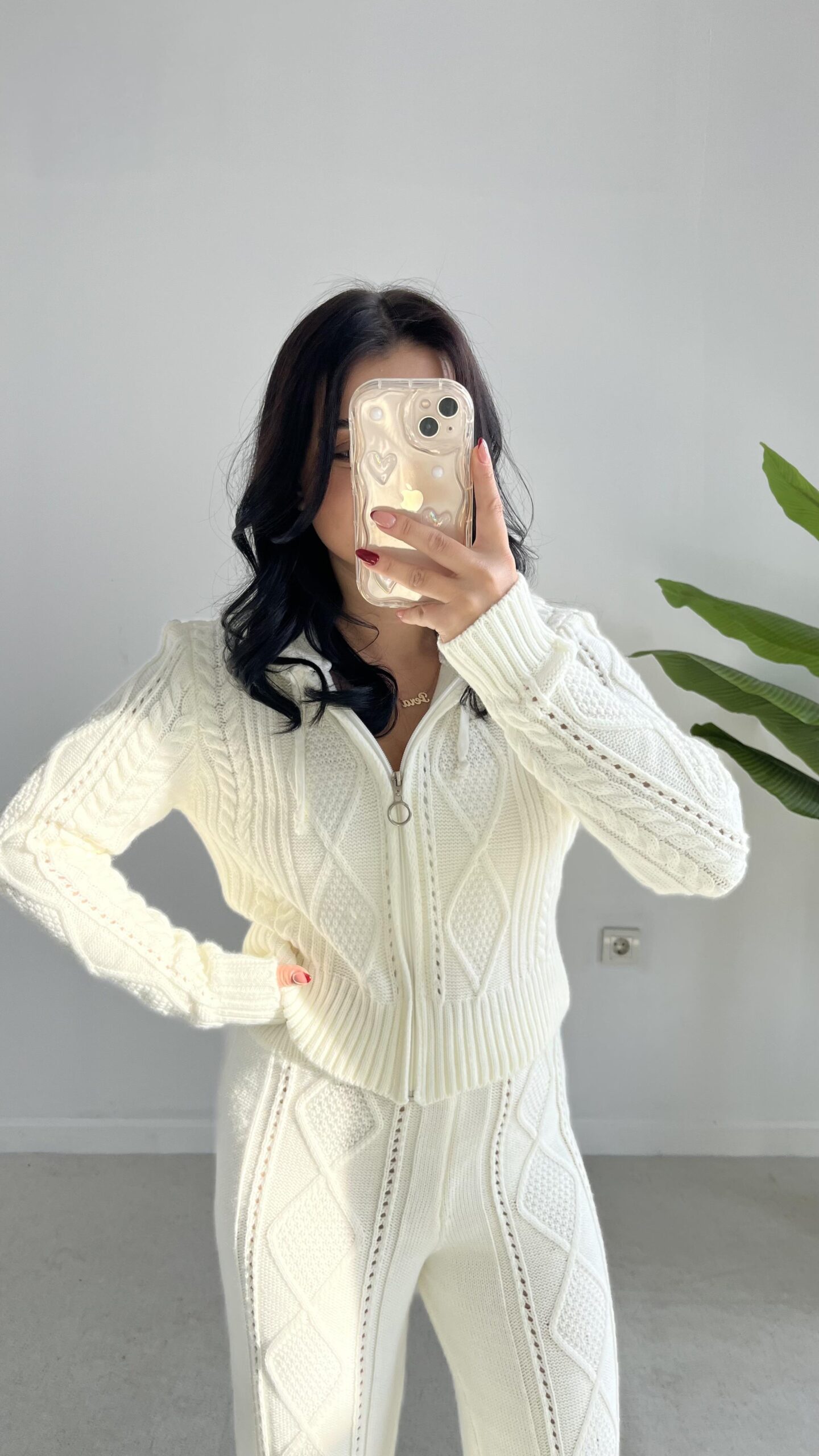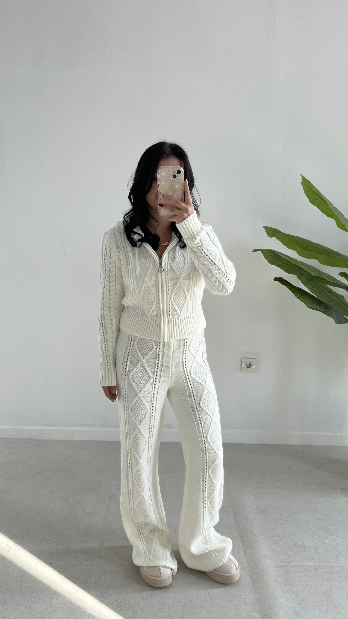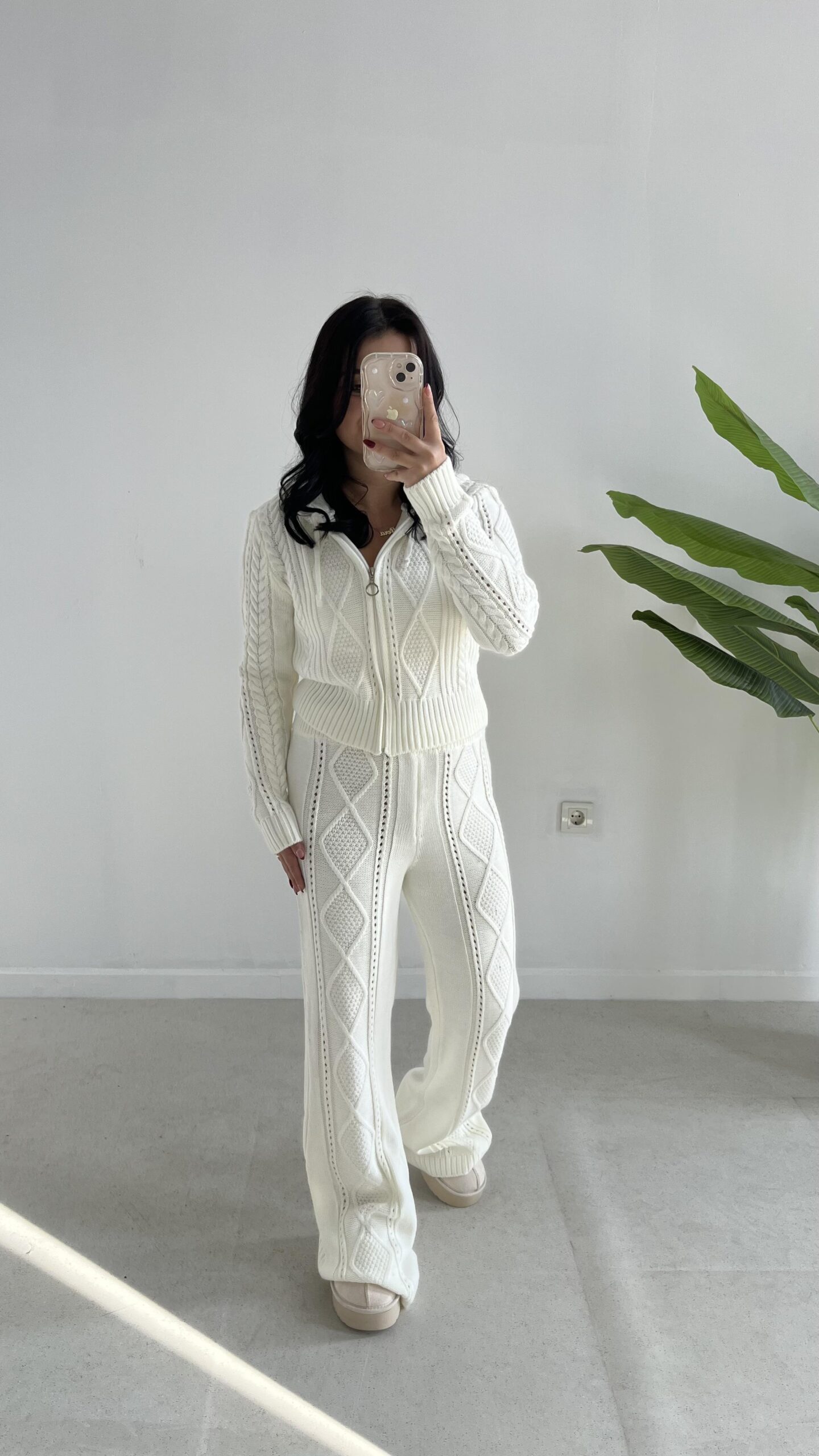 Örgü Desen Kapüşonlu Triko Takım – Ekru