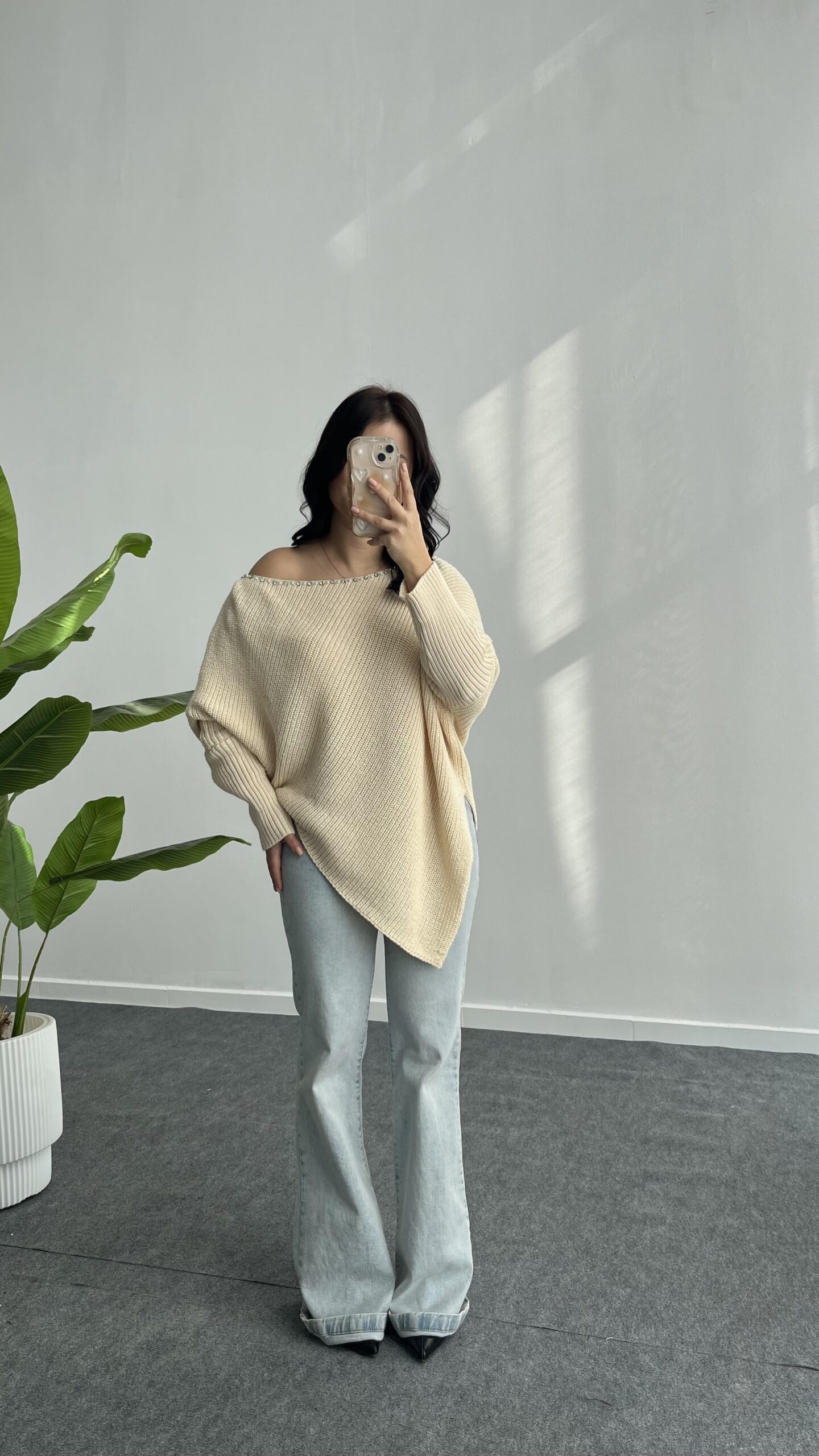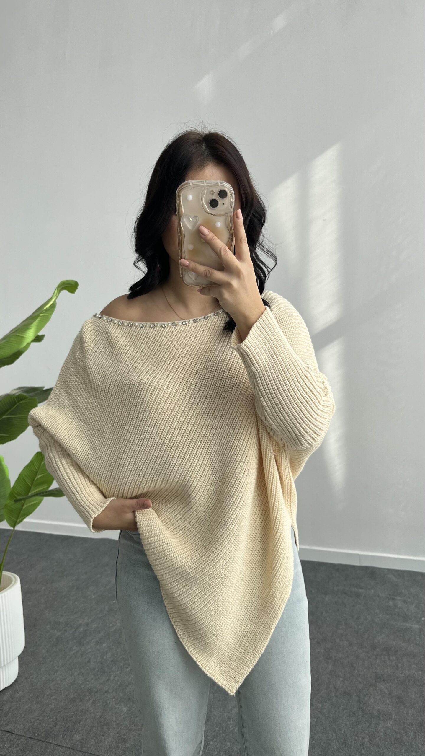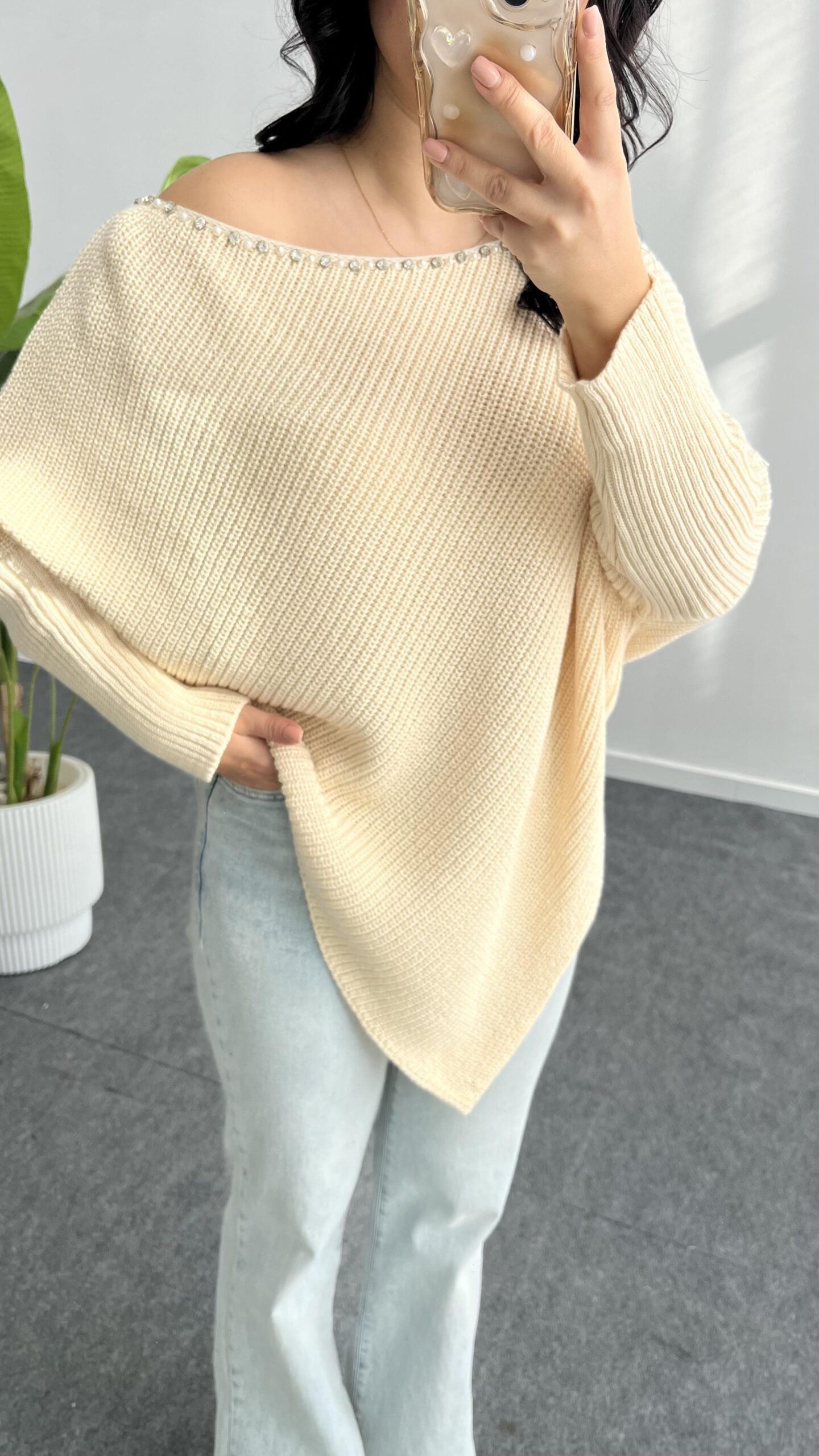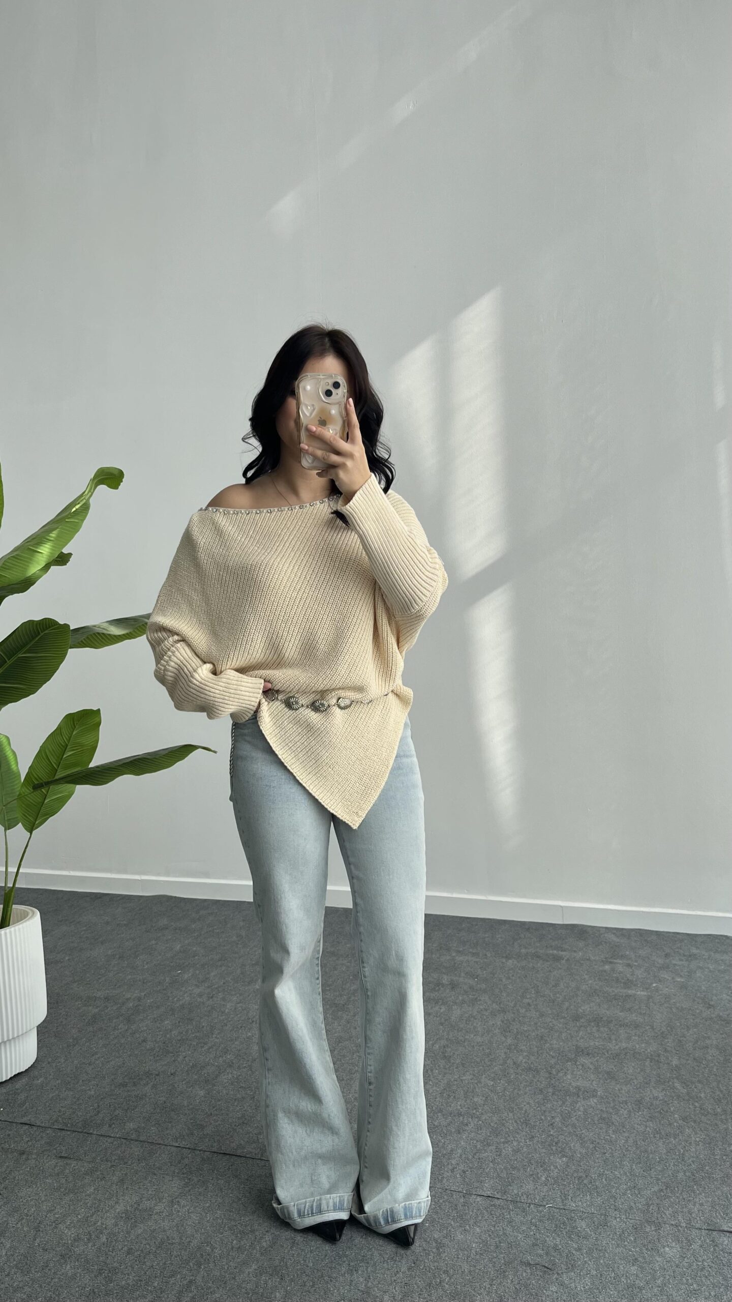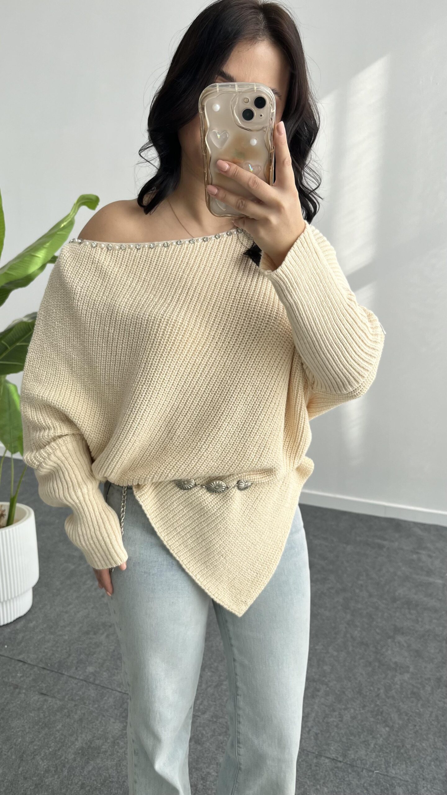 Lisa Yakası Taşlı Asimetrik Triko Bluz – Krem