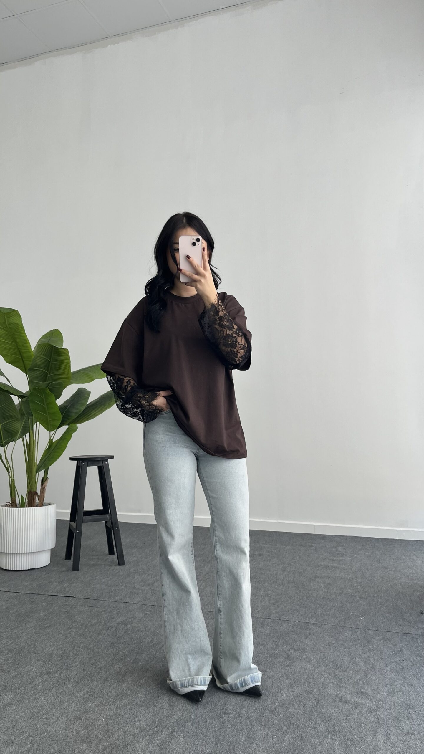 Loi Dantel Detaylı Oversize Tişört – Kahve