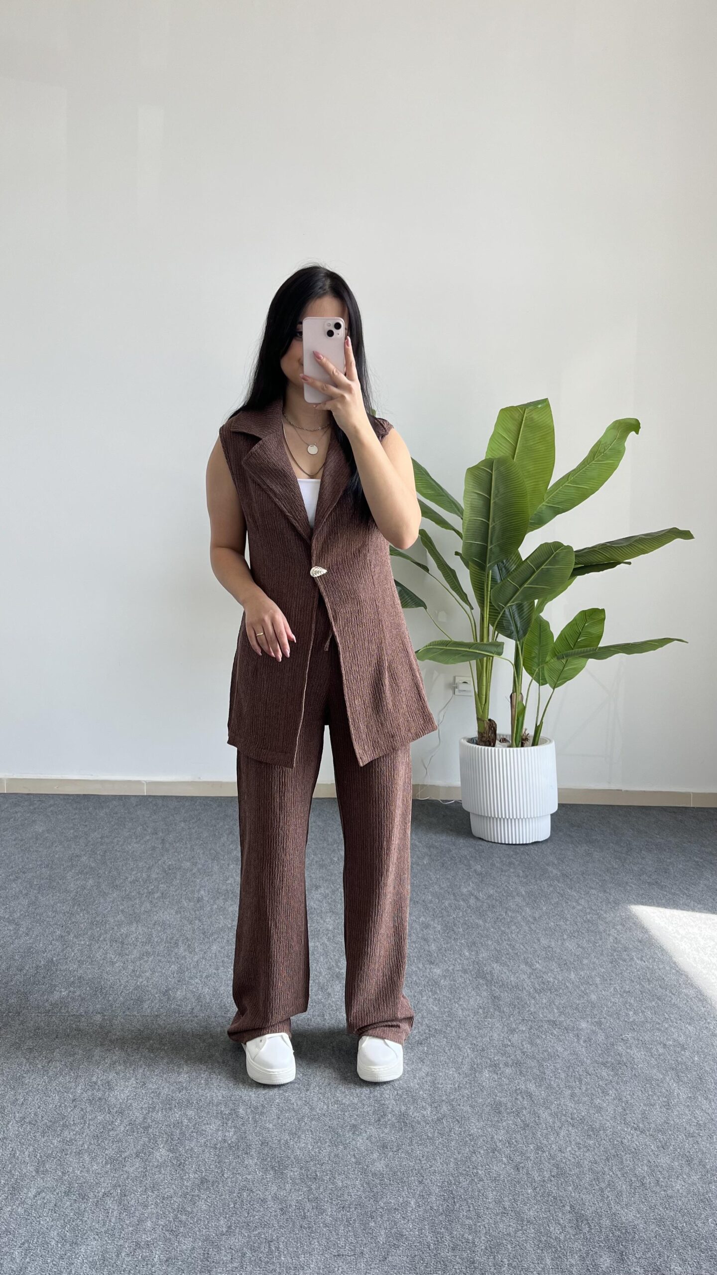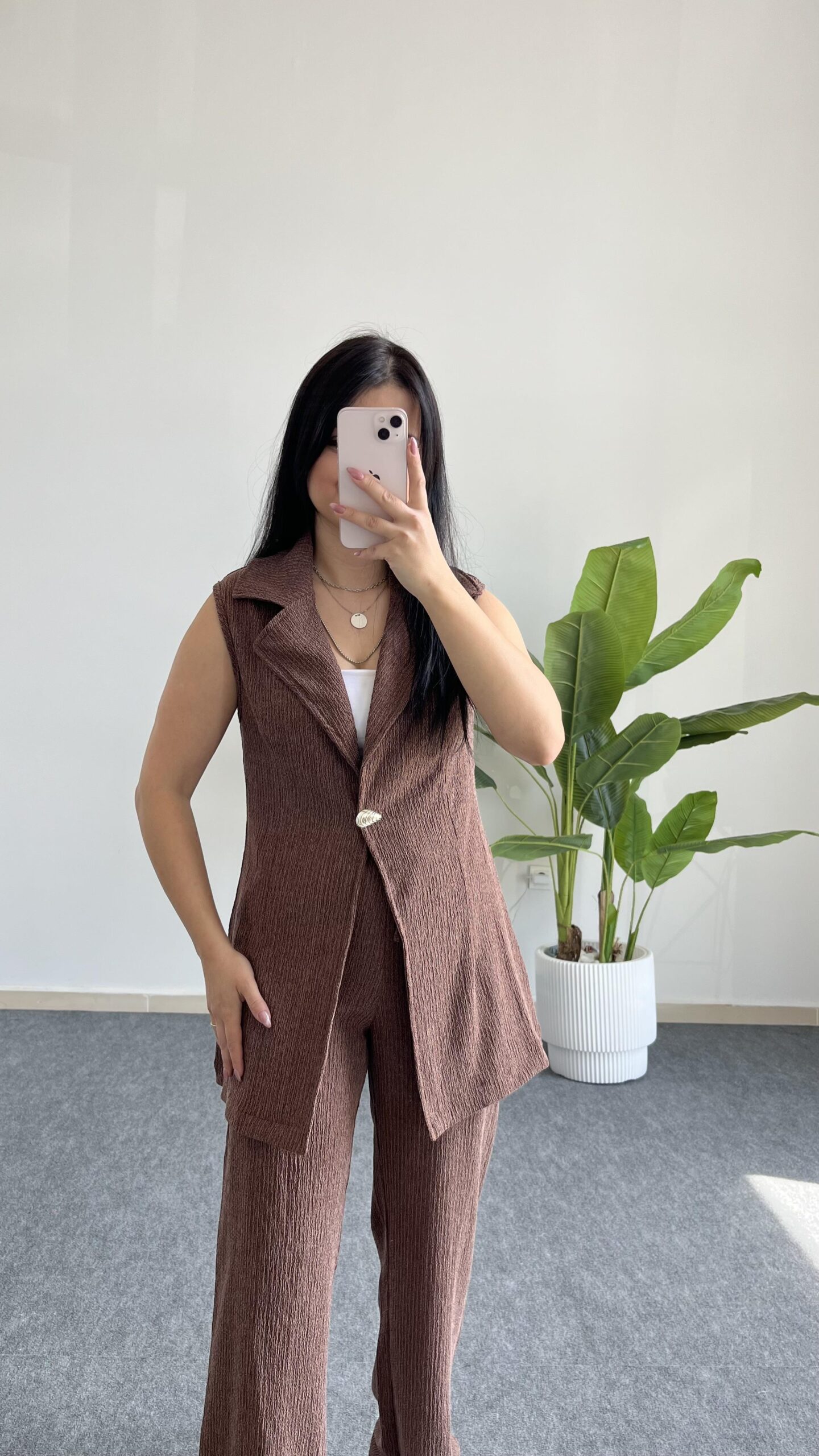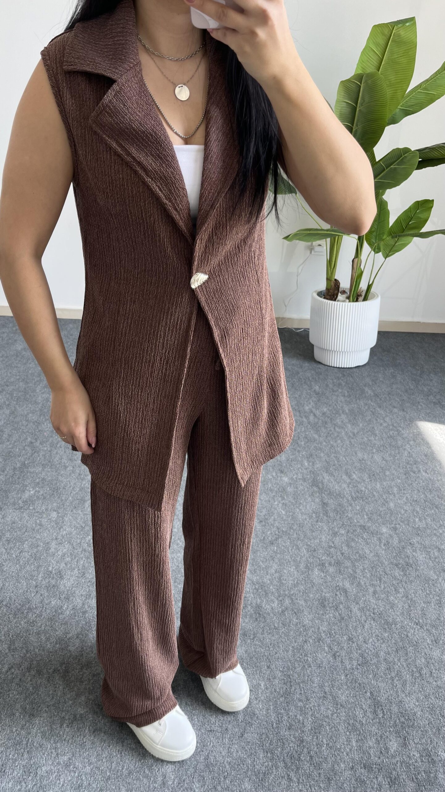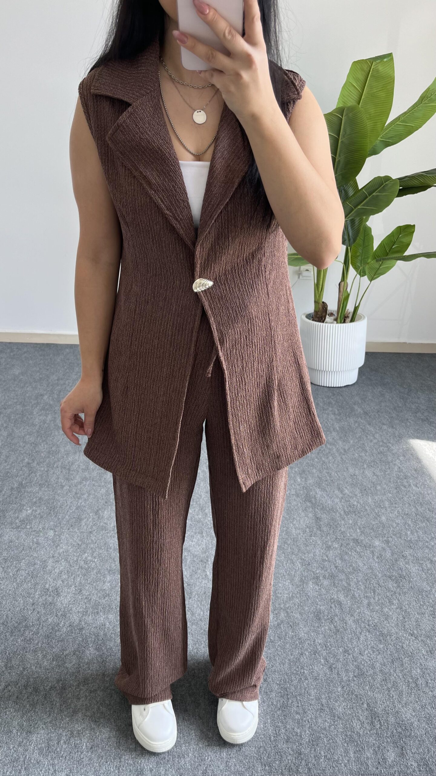 Helena Şal Yaka Yelek Pantolon İkili Takım – Kahverengi