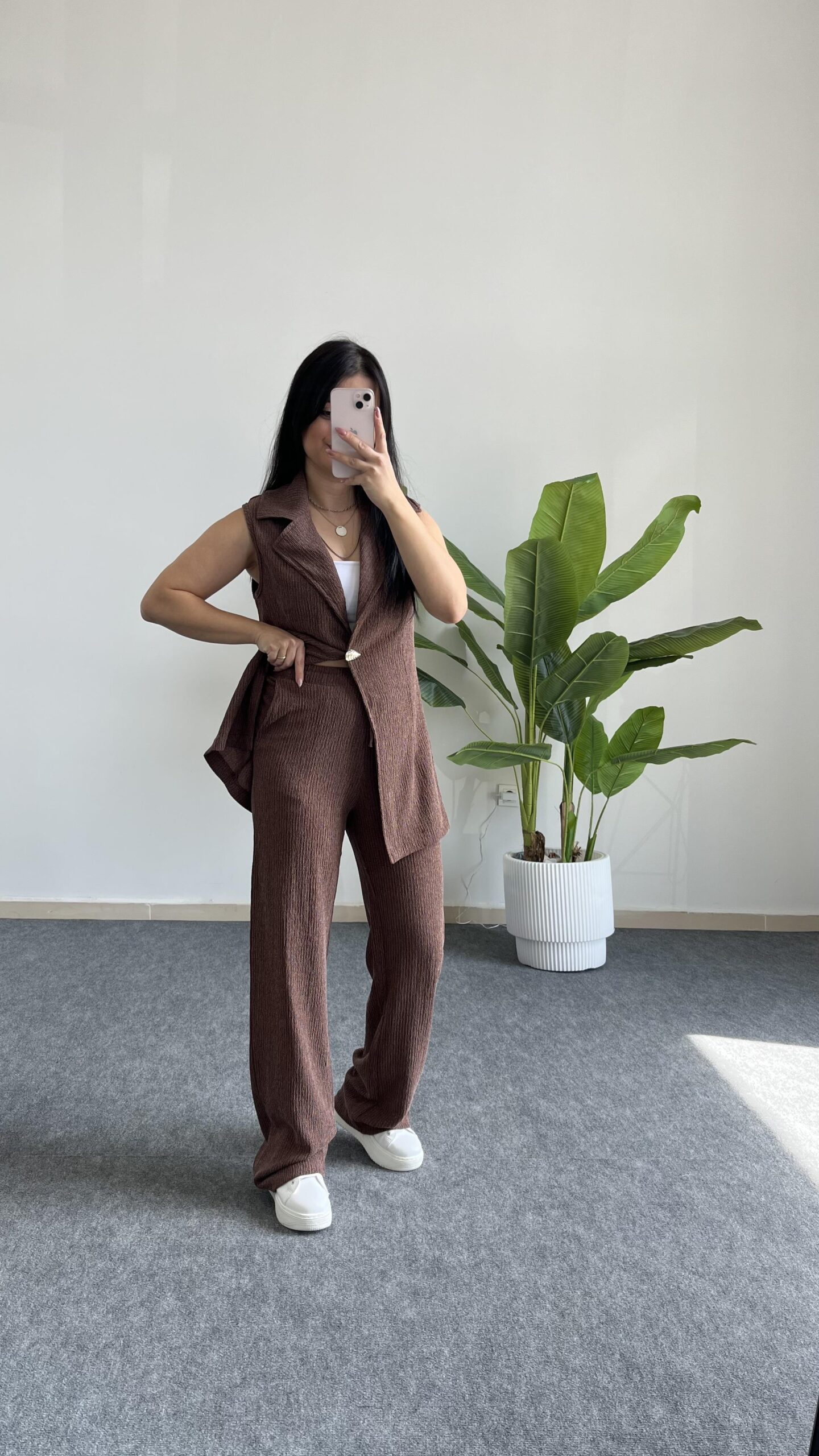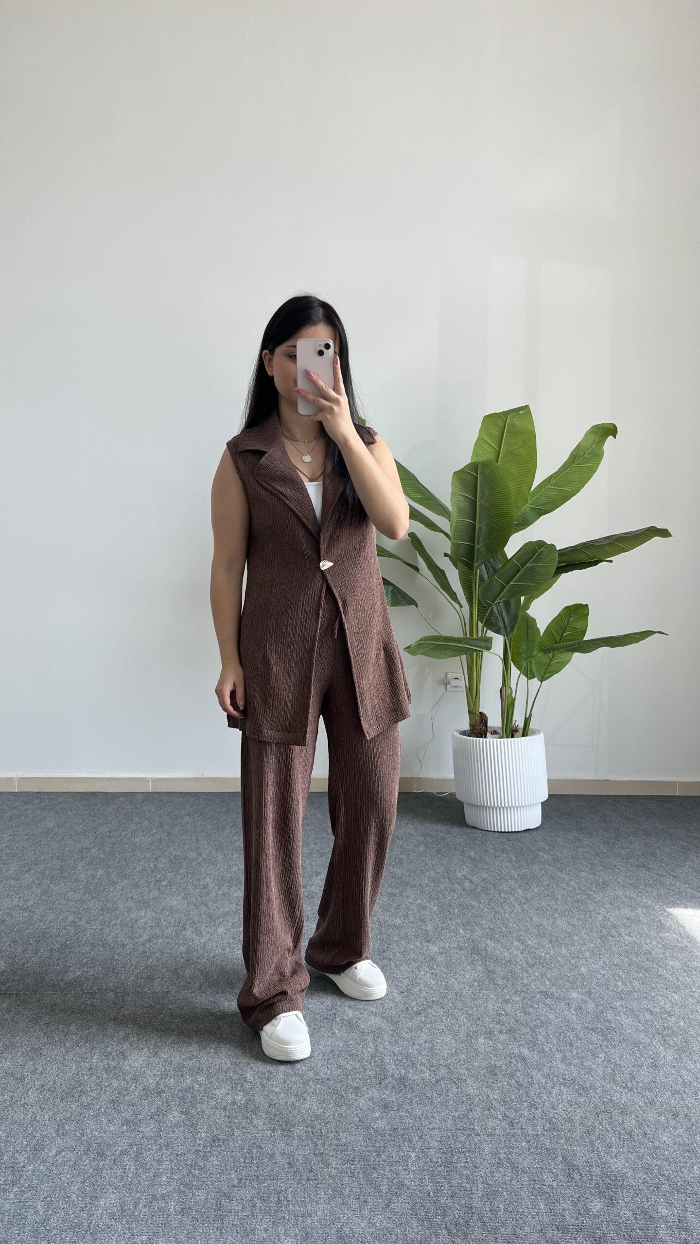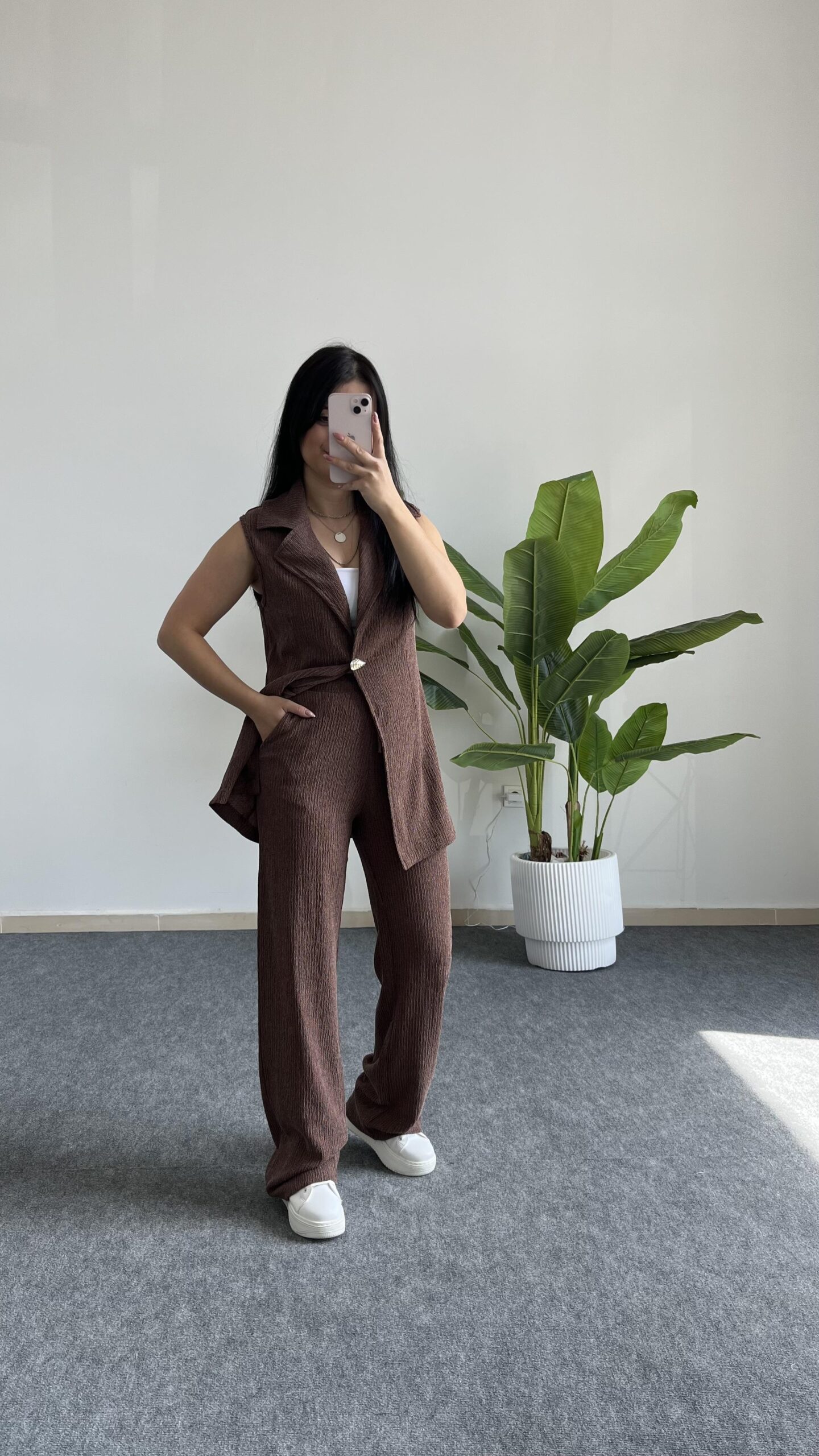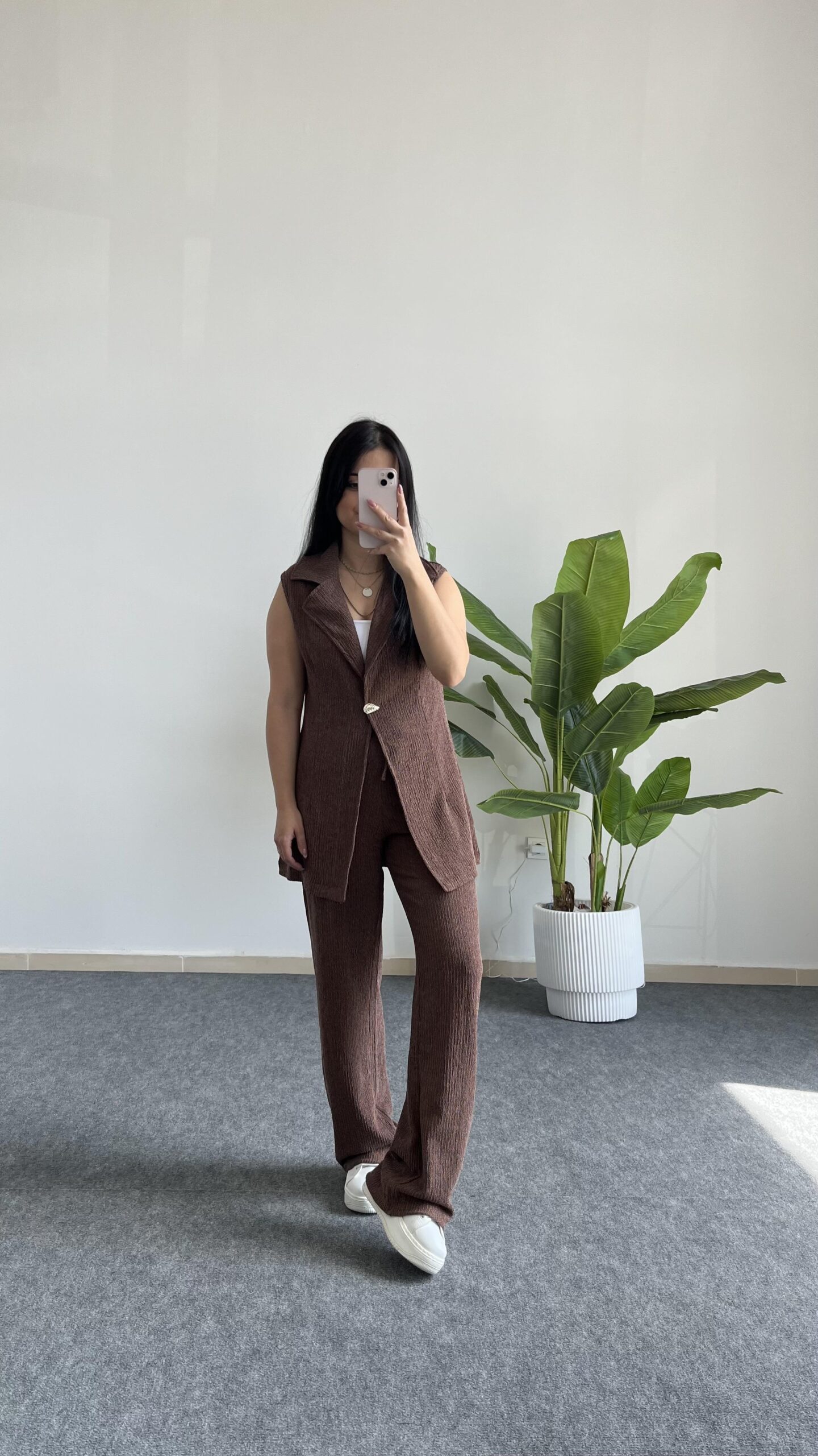 Helena Şal Yaka Yelek Pantolon İkili Takım – Kahverengi