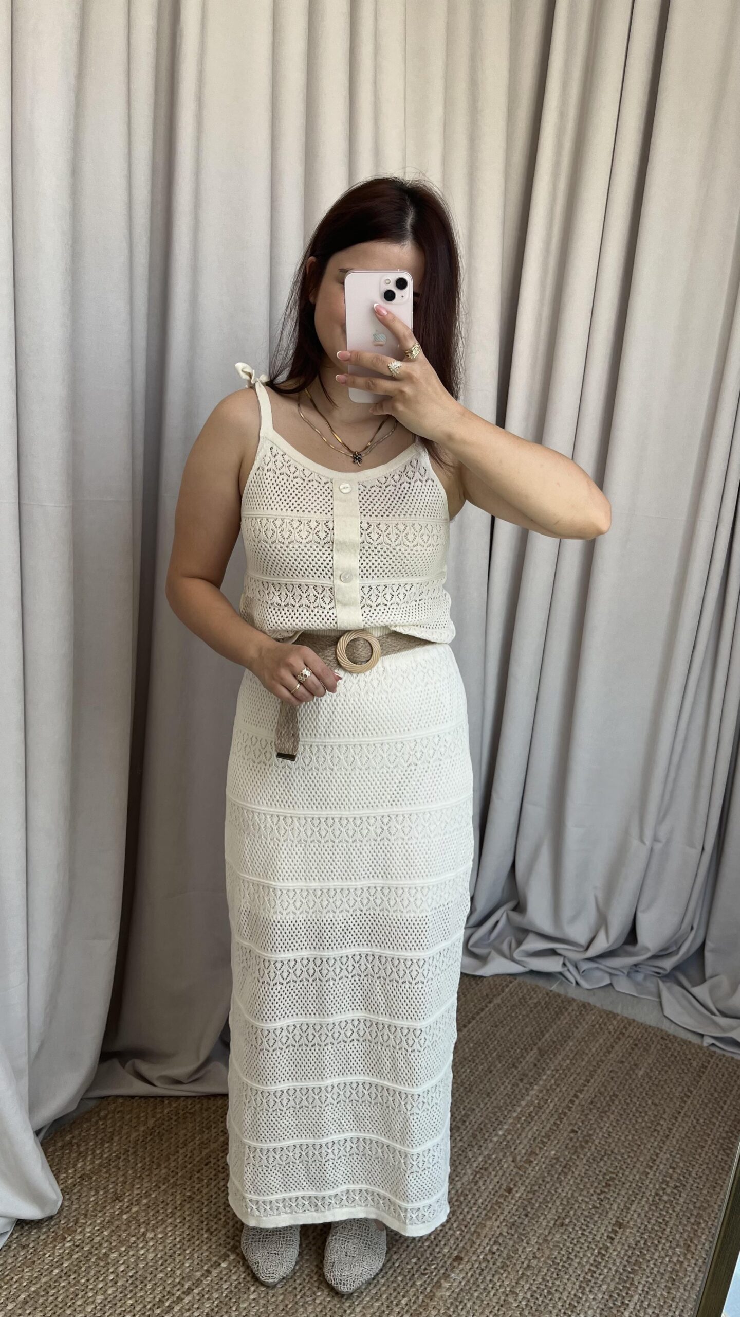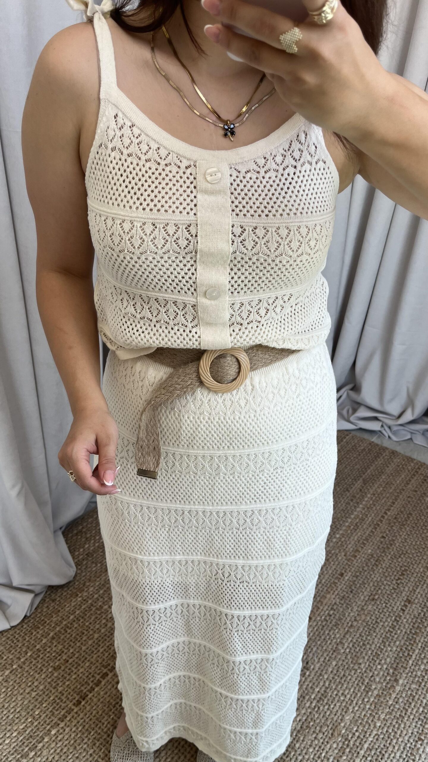 Krem Askılı Etekli Triko Takım