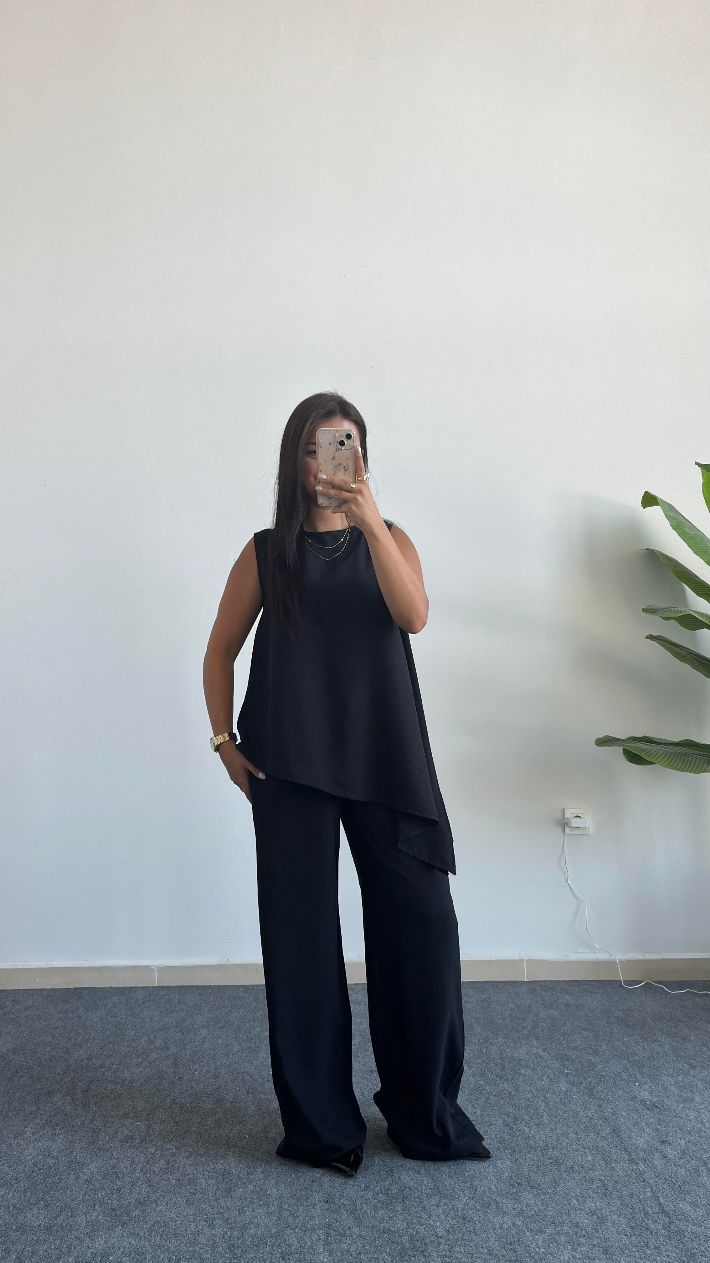 Asimetrik Kesim Bluz Pantolon Takım - Siyah