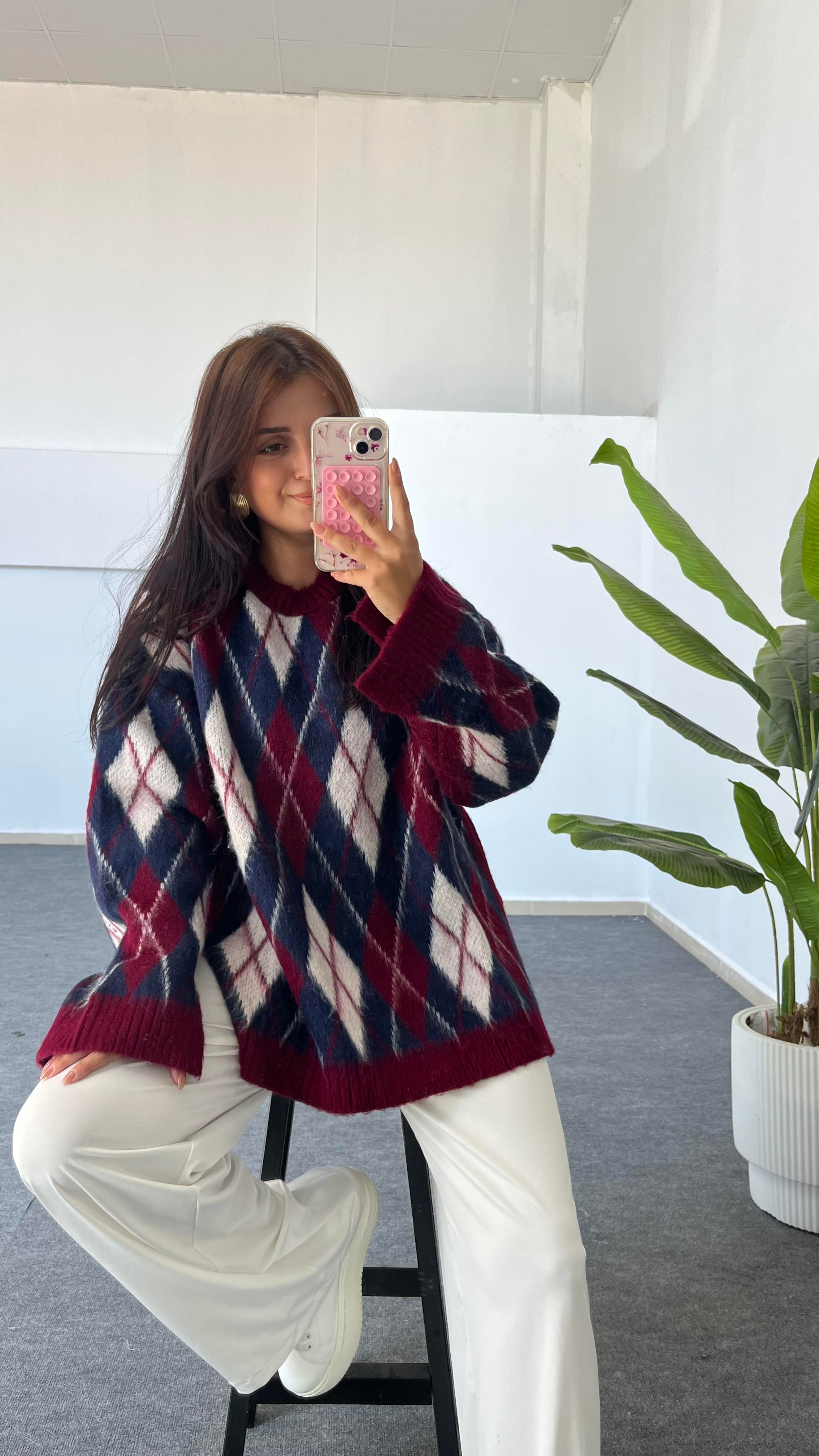Baklava Desen Yırtmaçlı Oversize Kazak - Bordo
