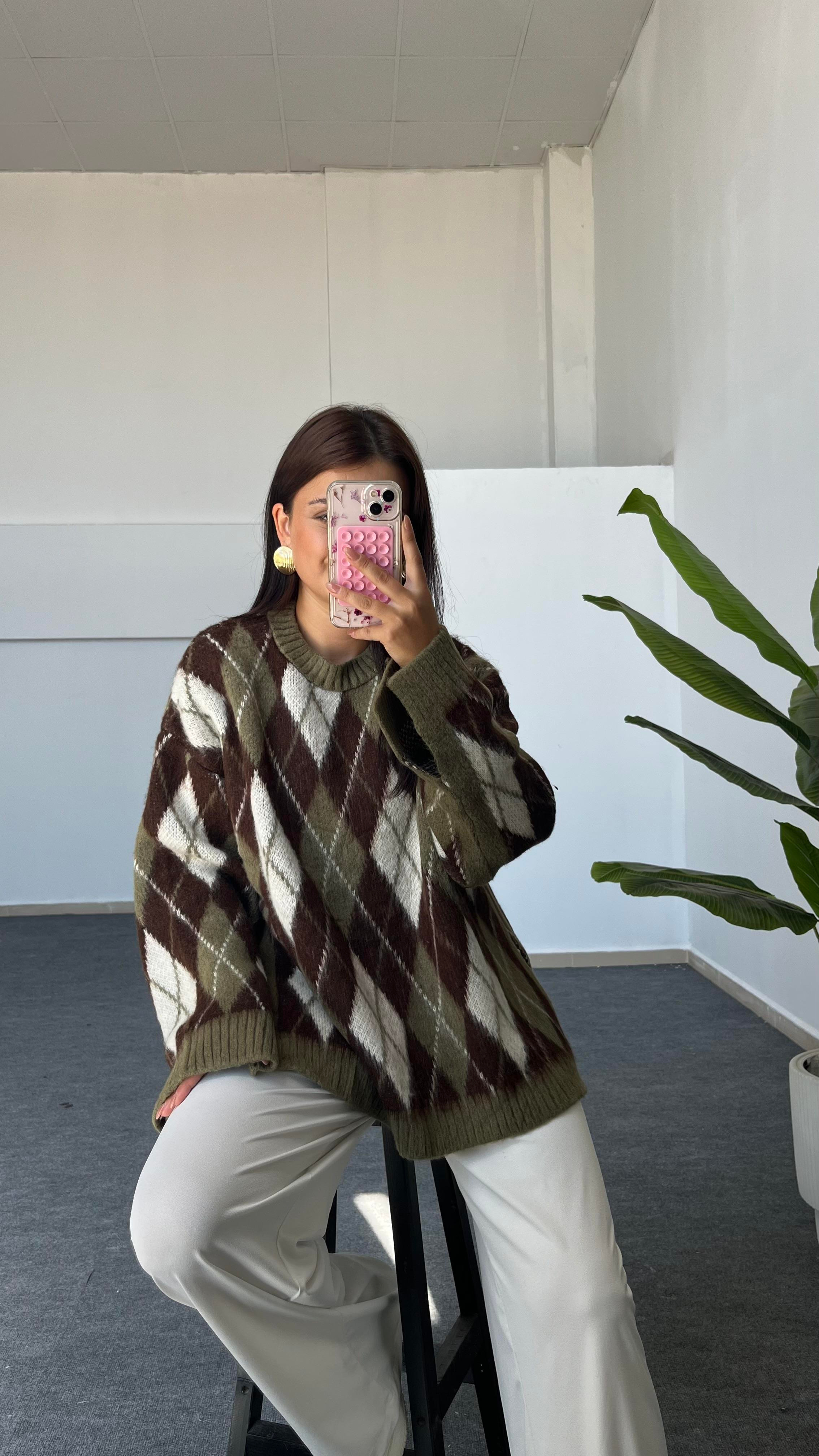 Baklava Desen Yırtmaçlı Oversize Kazak - Yeşil