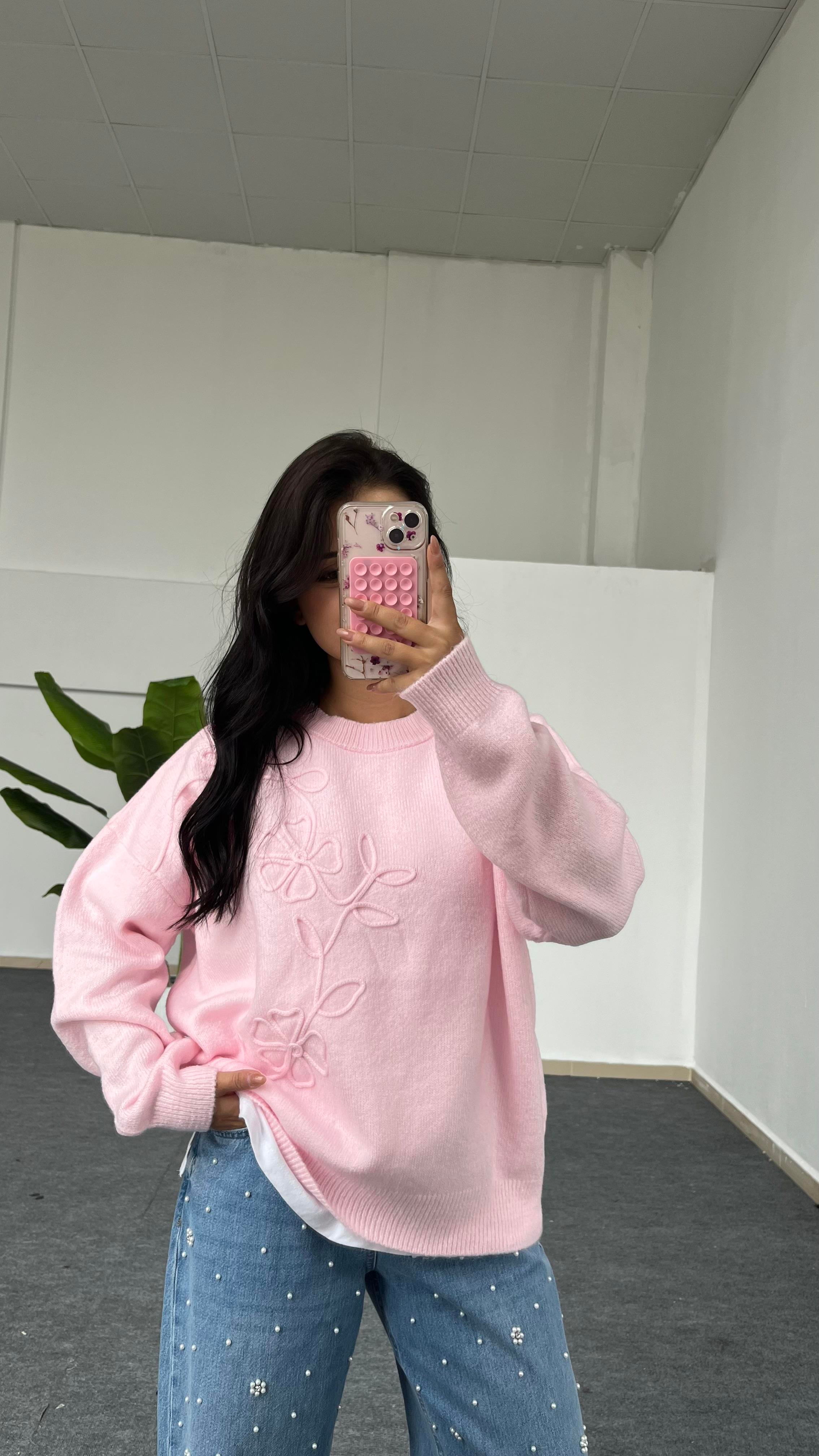 Estel Çiçek Nakışlı Triko Kazak - Pembe