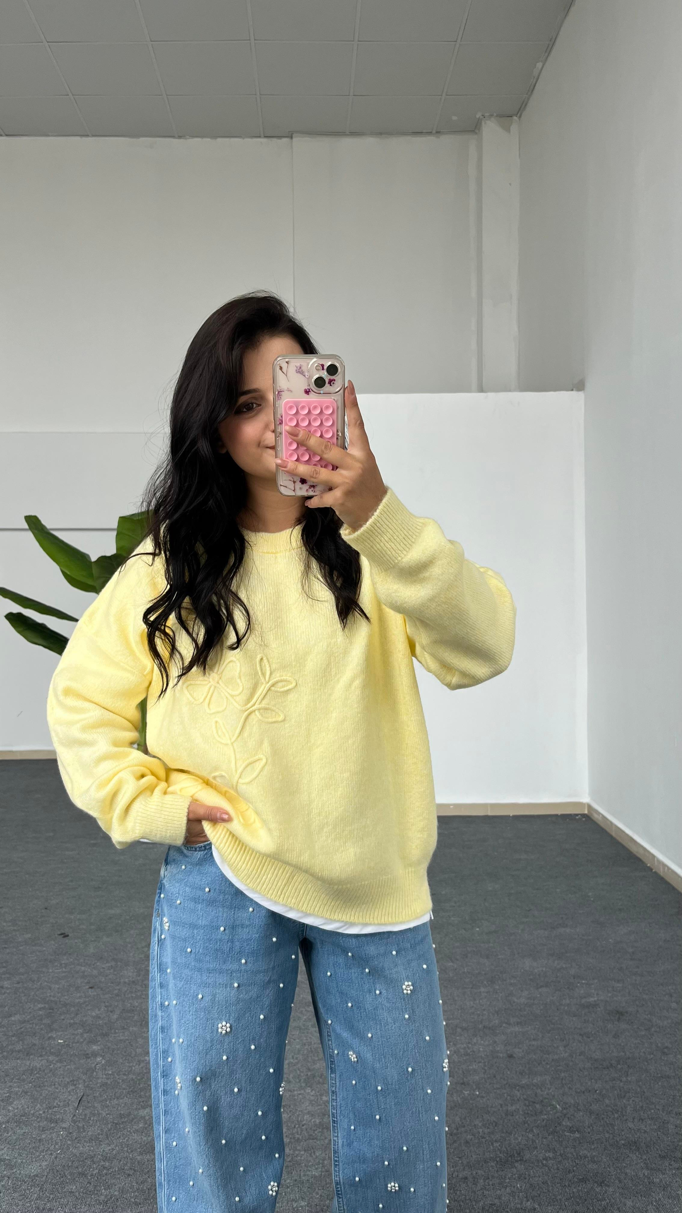 Estel Çiçek Nakışlı Triko Kazak - Sarı