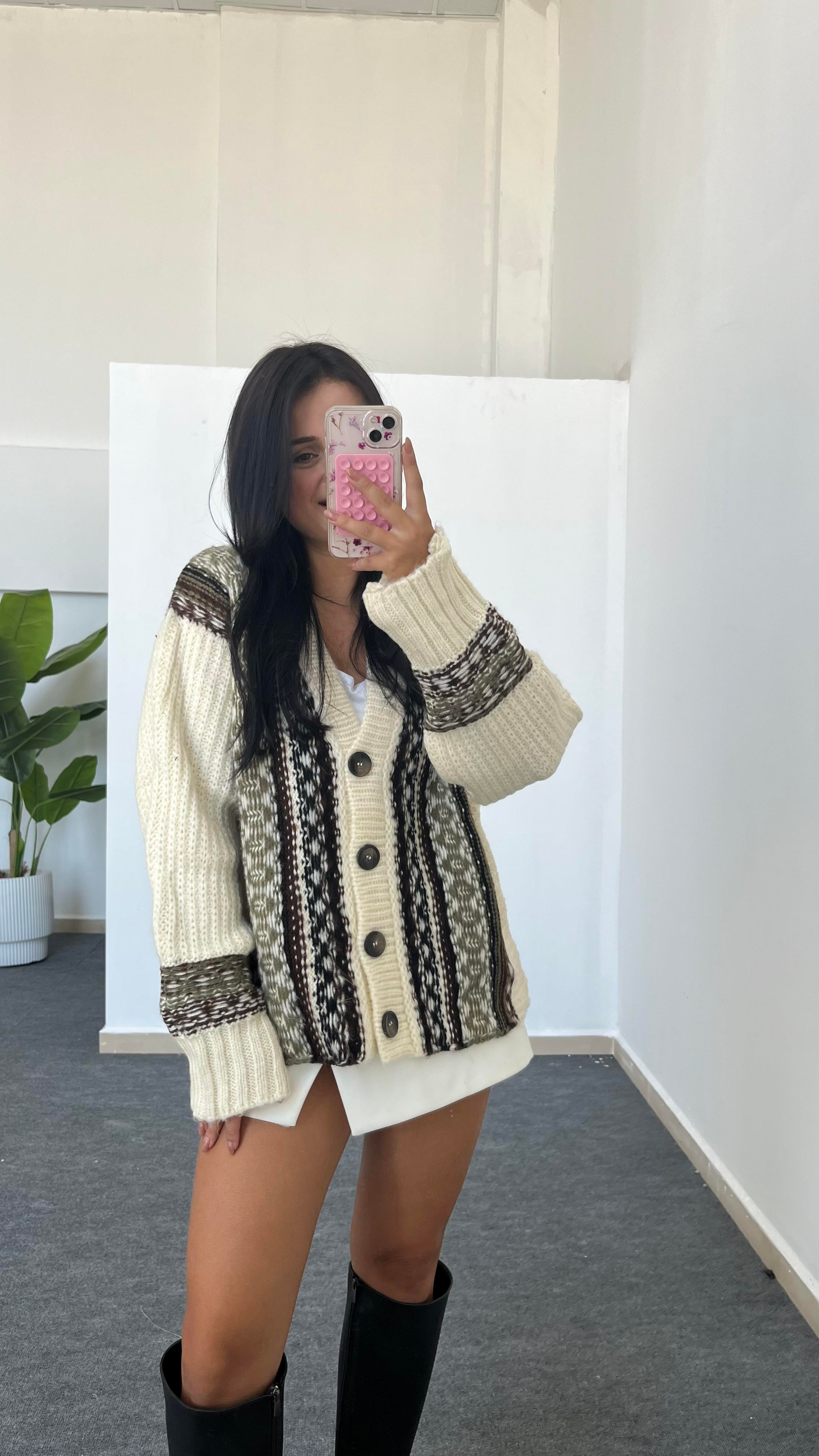 Jakar Desen Oversize Hırka - Ekru