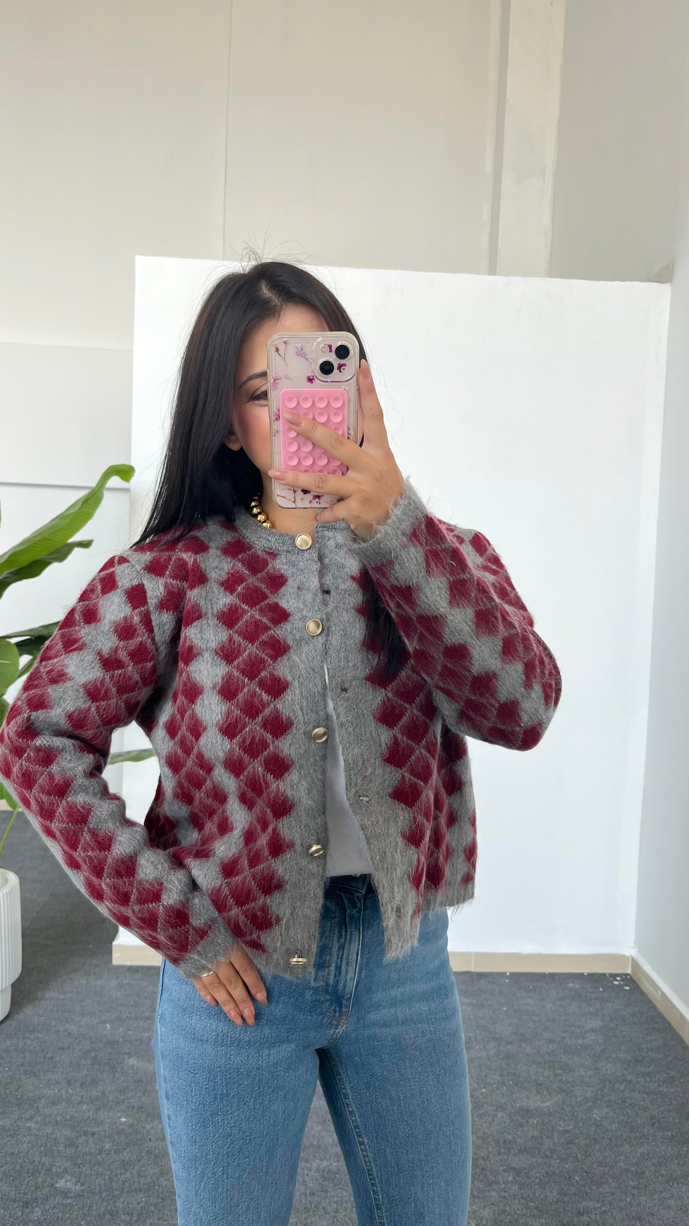 Kardena Baklava Desen Sakallı Hırka - Bordo
