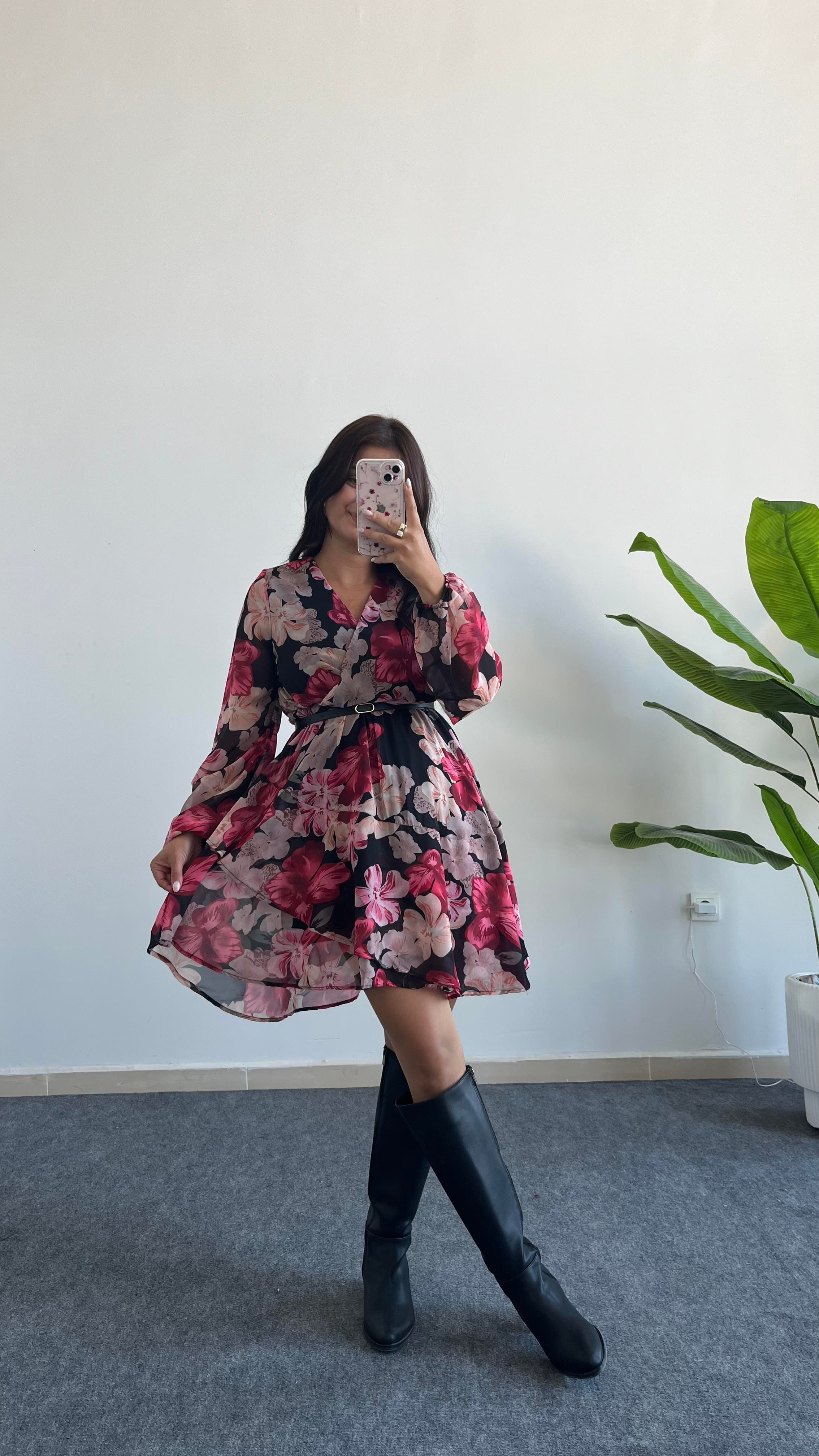 Kemerli Kruvaze Yaka Çiçekli Şifon Elbise - Kırmızı